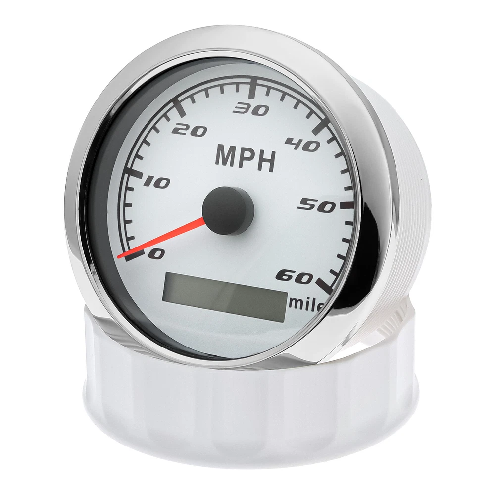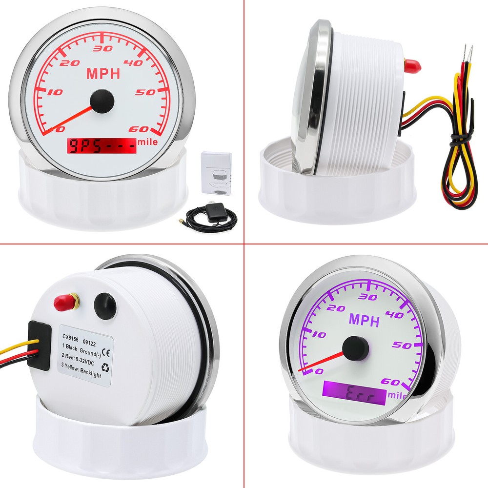 85MM GPS Speedometer 0-60MPH Odometer Gauge For Boat Car Truck ATV Motorcycle 85mm GPS Speedometer Gauge Odometer 0-60MPH 7 Colors LED for Car Boat Motorcycle Specifications: Dial: White Material: Stainless Steel 316L Bezel + Anti-fog Glass Install Diameter: Φ85mm or 3-3/8" Signal: GPS Working Voltage: 9~32V DC Working Current: ≤100mA Operating Temperature: -30℃ ~ 75℃ Storage Temperature: -40℃ ~ 85℃ Size: 12x8x12cm / 4.72x3.1x4.75 inch IP67 waterproof and dustproof grade Indication Range: 0-60 MPH Backlight:7 Colors Backligt Product Descriptions High-brightness LED backlight. 316 stainless steel for long-term use even in acid-base, humid environment. IP67 waterproof and dust-proof grade. With curved glass( with anti-fog function). Suitable for all kinds of vehicle modification. Using stepper motor drive pointer, accurate display of the engine speed, and with the LCD display clear display mileage. Gauges have many kinds backlight color (red,yellow,orange,green,blue,purple,white),customers can adjust any color that you like. Package Includes: 1X 85MM Digital GPS Speedometer Gauge 1X Instruction 1X GPS Antenna