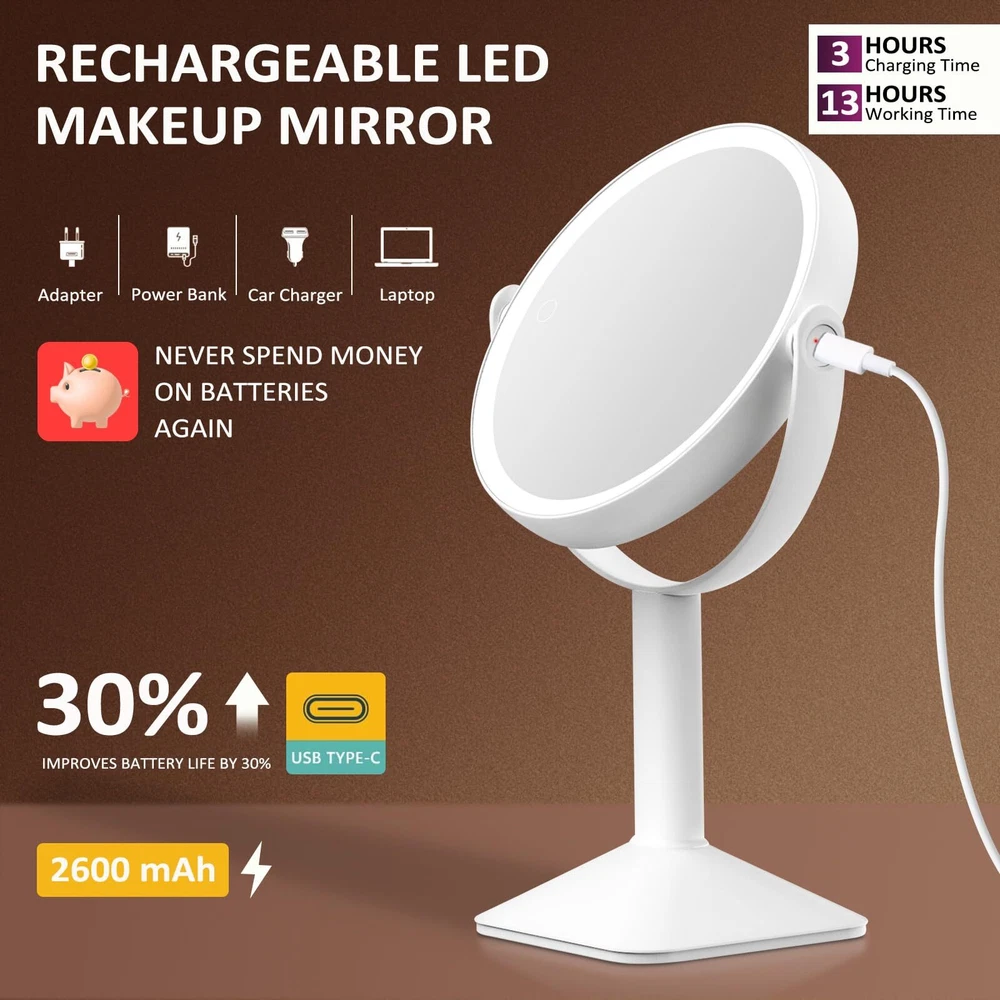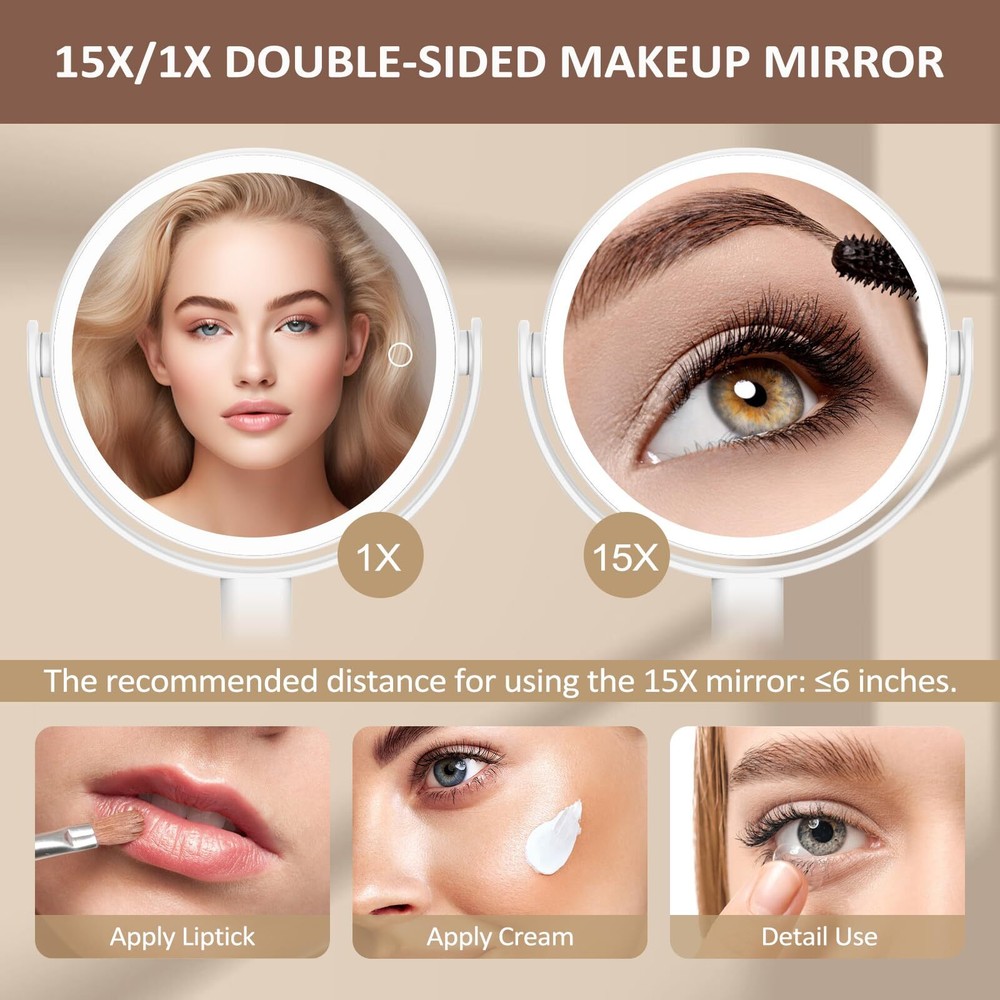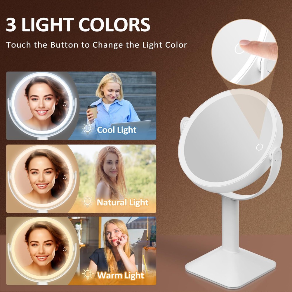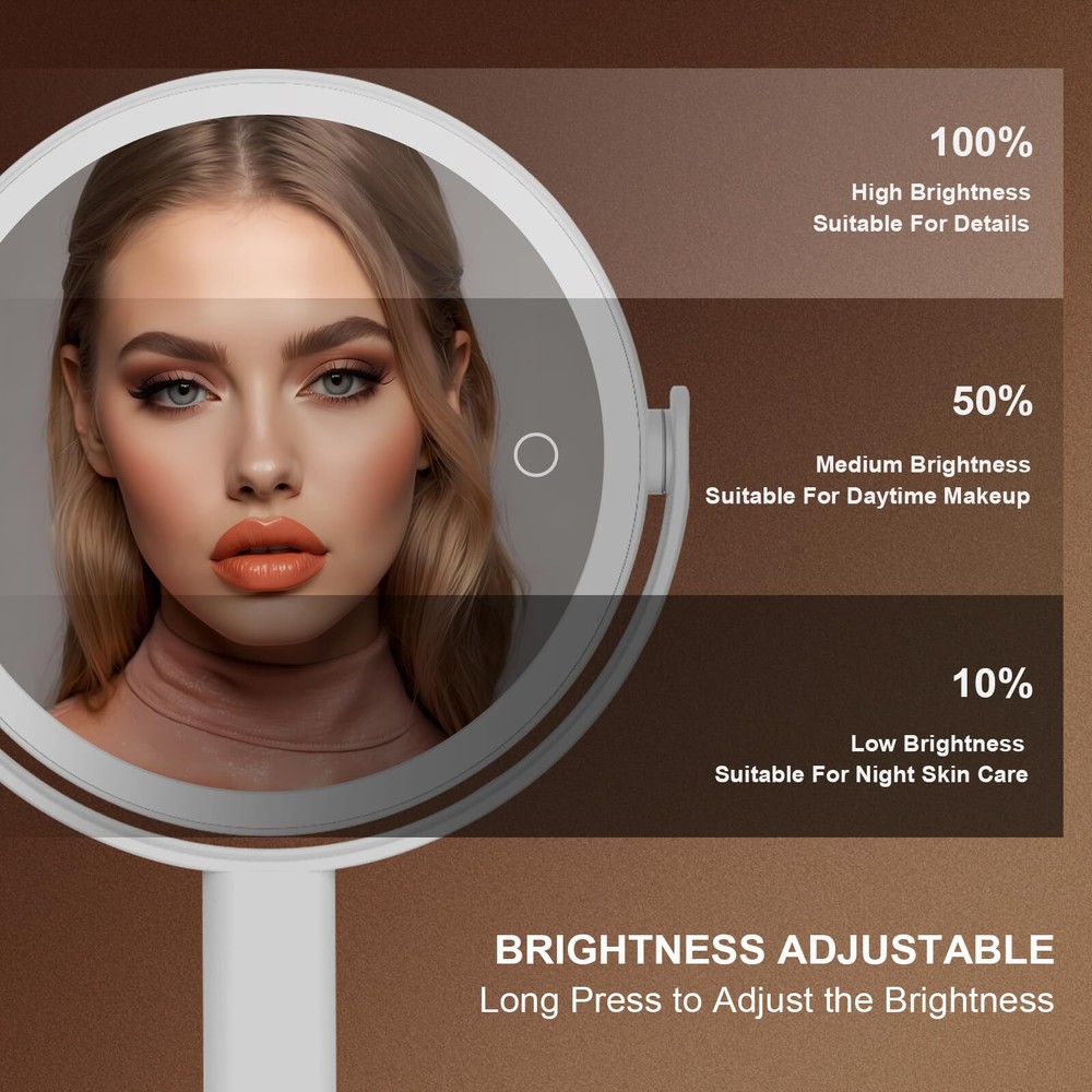 đ„°Are you still worried about the mirror unstable? đŻăSturdy Triangular and Removable Base Easy to InstalăUnlike others,the double-sided lighted makeup mirror features a sturdy U-shaped bracket and stable triangular base design to ensure stability and support.The detachable base design offers convenience for carrying around. đĄă3 Color Lighting and DimmableăThis mirror with lights provides cool light, warm light, and natural light, allowing you to freely switch between three different lighting effects. Short press can easily change the lighting mode, and long press the touch screen switch to dim or brighten the lights, with various brightness levels to meet your needs. đăRechargeable LED MirrorăThe light up mirror is equipped with a 2600mAh rechargeable battery, which can work continuously for 13 hours after fully charged, avoiding frequent charging. Adopt a Type-C interface charging design, convenient for you to charge the lighted mirror. âšăPremium Pearl ABS Finish Surface and Smart FunctionăCrafted from high-quality pearl ABS, the mirror combines durability with smart .Also it features a brightness memory function and a 30-minute auto-off timer which is convenient for your everytime use. đăEnjoy 360°Free-rotationăThe desktop lighted mirror can be freely adjusted between 1X to 15X,so you can always find the most suitable makeup angle on any plane. The magnified mirror with lights is suitable for tables and wash tables of all heights, allowing you to avoid the damage caused by bending over. đăPerfect Gift for WomenăOur mirror for desk is made of high-quality materials, with exquisite appearance and intelligent dimming function, making it practical and beautiful. Whether it's a birthday, anniversary, Mother's Day, Valentine's Day, or Christmas, this mirror makeup is the best gift for mom, girlfriend, wife or friend.