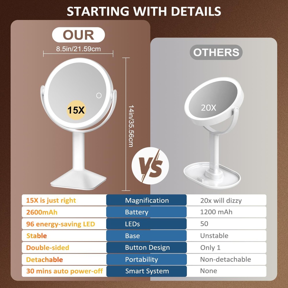 This mirror is a game-changer! The sturdy U-shaped bracket and triangular base keep it perfectly stableâno wobbling at all. Love that the base is removable for easy travel. The three lighting modes (cool, warm, natural) are super handy, and I use the dimmable feature daily. The 15X magnification is crystal clear for precise makeup, while the 1X side is perfect for regular use. Battery life lasts surprisingly long, and the touch controls feel premium. Itâs compact yet powerfulâtotally worth the buy! đ„°