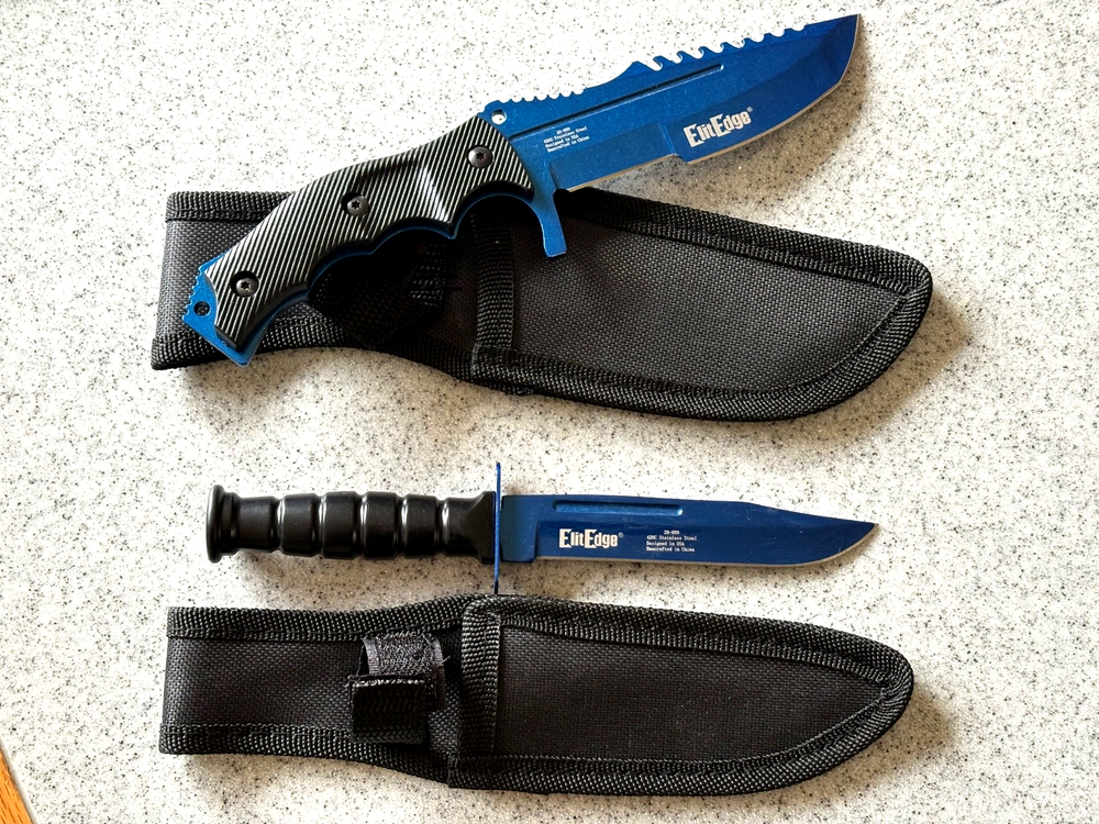 Lot of 2 open box. Never used .. smaller knife has a tiny scratch mark on the blade. Very light weight and easy to carry. Measurement includes the handle. Each knife features a stainless steel blade with blue finish and durable TPU secure-grip handles. In the set, you get an 8 1/2” huntsman and a 7 1/2” military-style clip point knife. Fast shipping.