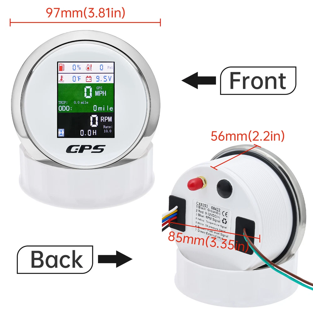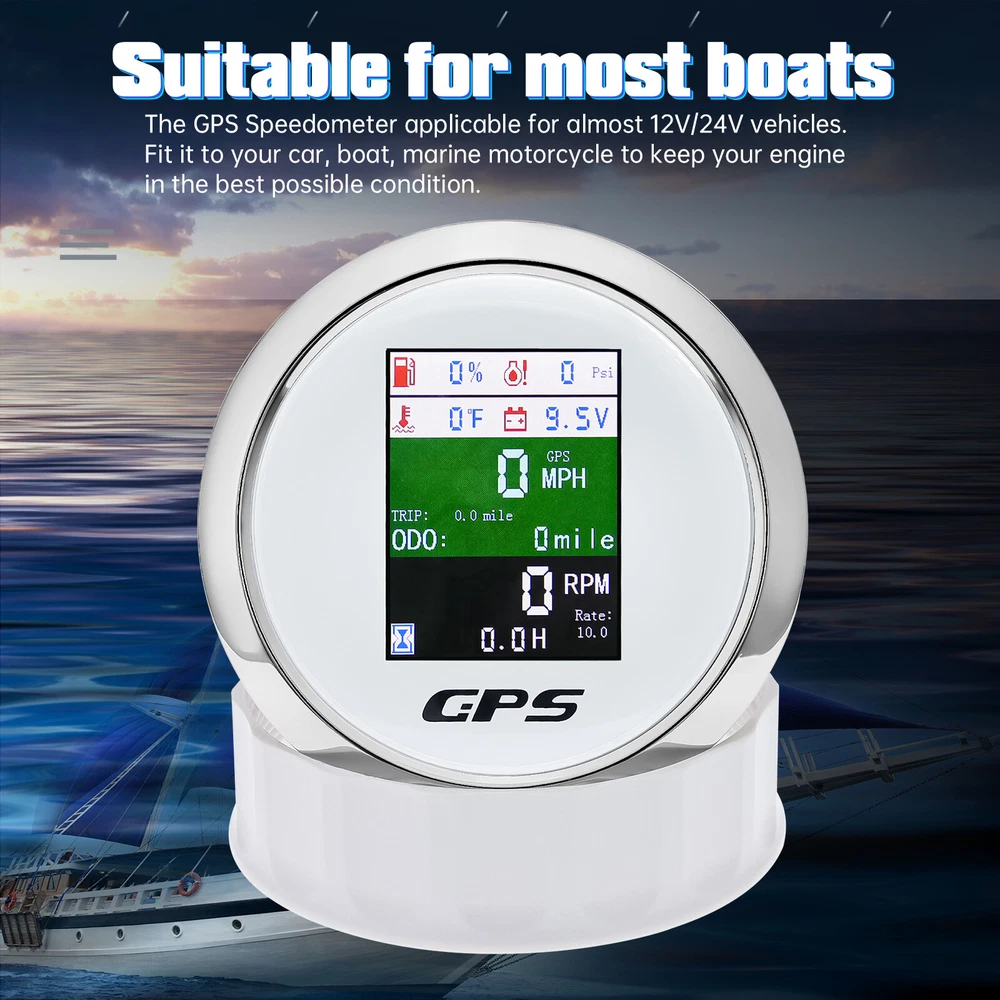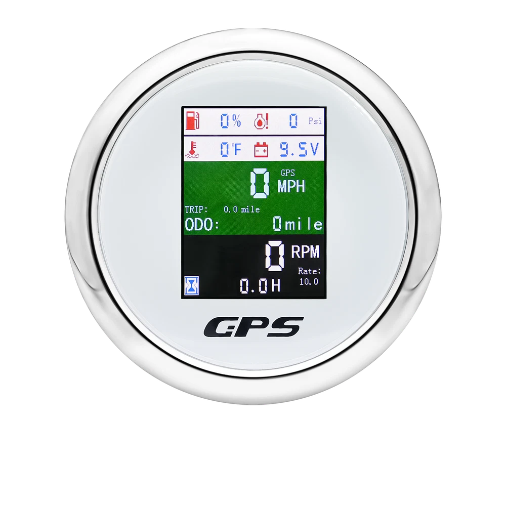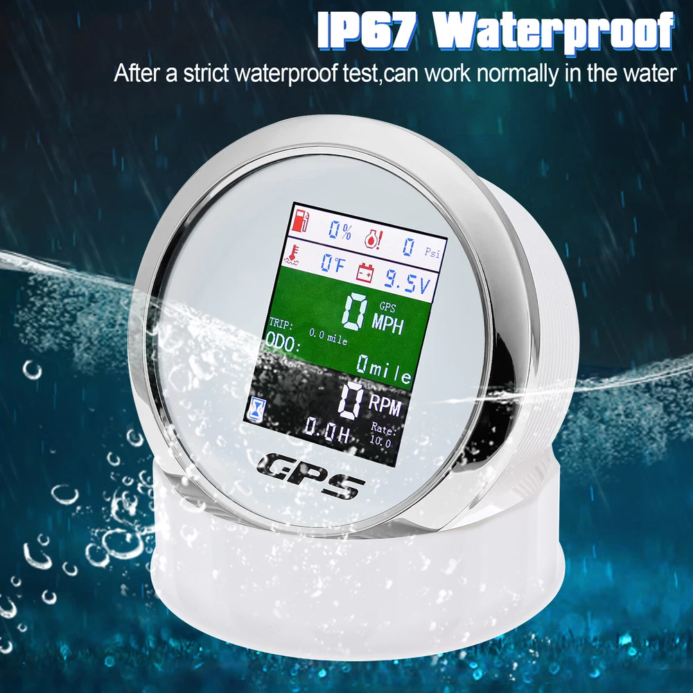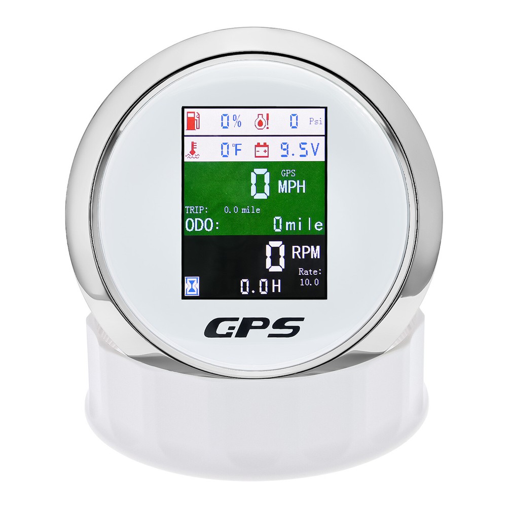 85mm 6 in 1 Multifunction GPS Speedometer Tacho Oil Press Water Temp Fuel Volt 85MM GPS Speedometer Tachometer Water Temp Fuel Level Oil Pressure 0-10Bar 6 in 1 Multi-functional Digital Gauge with alarm Features: - GPS SOG: Speed Over Ground: 0-600km/h - ODO: odometer: 0-999999km (can be adjusted by the back button.) - TRIP: 0-999.9km (Return Zero When off electricity) - COG: Course Over Ground - Tachometer: 0-9999RPM - Speed Ratio: 1.0-360.0; Step Value: 0.1 - Oil Pressure: 0-10 bar/0-145psi (Pressure sensor: 10-184ohm) (After power on, press the back button to adjust unit, if the oil pressure unit is "psi", the temperature unit will be "℉".) - Water Temperature: 40-120℃/100-250℉ (Temperature sensor: 301-22ohm) (The water temperature is displayed by default. If you need oil temperature, please contact us to customize.) - Voltmeter: 9-32V - Fuel Level: 0-100% (Press the back button to adjust the level signal: 0-190Ω/240-33Ω available.) - Total Engine Hours: 0.0-99999.9H(Press the back button to adjust.) - Sensor Fault Alarm(Chinese and English can be switched) - Degree of Protection: IP67 - Backlight: TFT Screen * Sensor are not provided with this gauge. * Plz. order the sensor separately if you need it. Setting: - Keep on pressing the back button for 3 seconds, and then enter into setting mode, leaving button more than 3 seconds, it will be out of setting mode. - The value will increase when you press the button. When you leave the button and then press it again, the value will decrease. The minimum step value is 0.1 and the adjustable range is 1.0-360.0.(tachometer setting) - When you get the required speed ratio value after adjustment, please leave the button. The tachometers will autoclave your setup after 3 seconds. If the setup doesn't meet your demand, please re-setup. - Must press the button first and power up, can select English or Chinese. Dimensions: - 85mm diameter (3-3/8") - 55mm Depth (2-3/4") Package Included(as picture): - 1X 6 in 1 Gauge - 1X Multi-plug socket - 1X GPS antenna - 1X Instruction Note: - Please make sure you can Installation,if you need help you can contact your local car repair workshop,Thank you! - Please allow a voltage error of 0.2V, thank you Wholesale and Drop shipping - For wholesale, we will offer the discount or free express shipping which only takes 3-7 days to arrive. - For drop shipping, We could send the goods to your customers directly and won't leave information about us if youd like to.