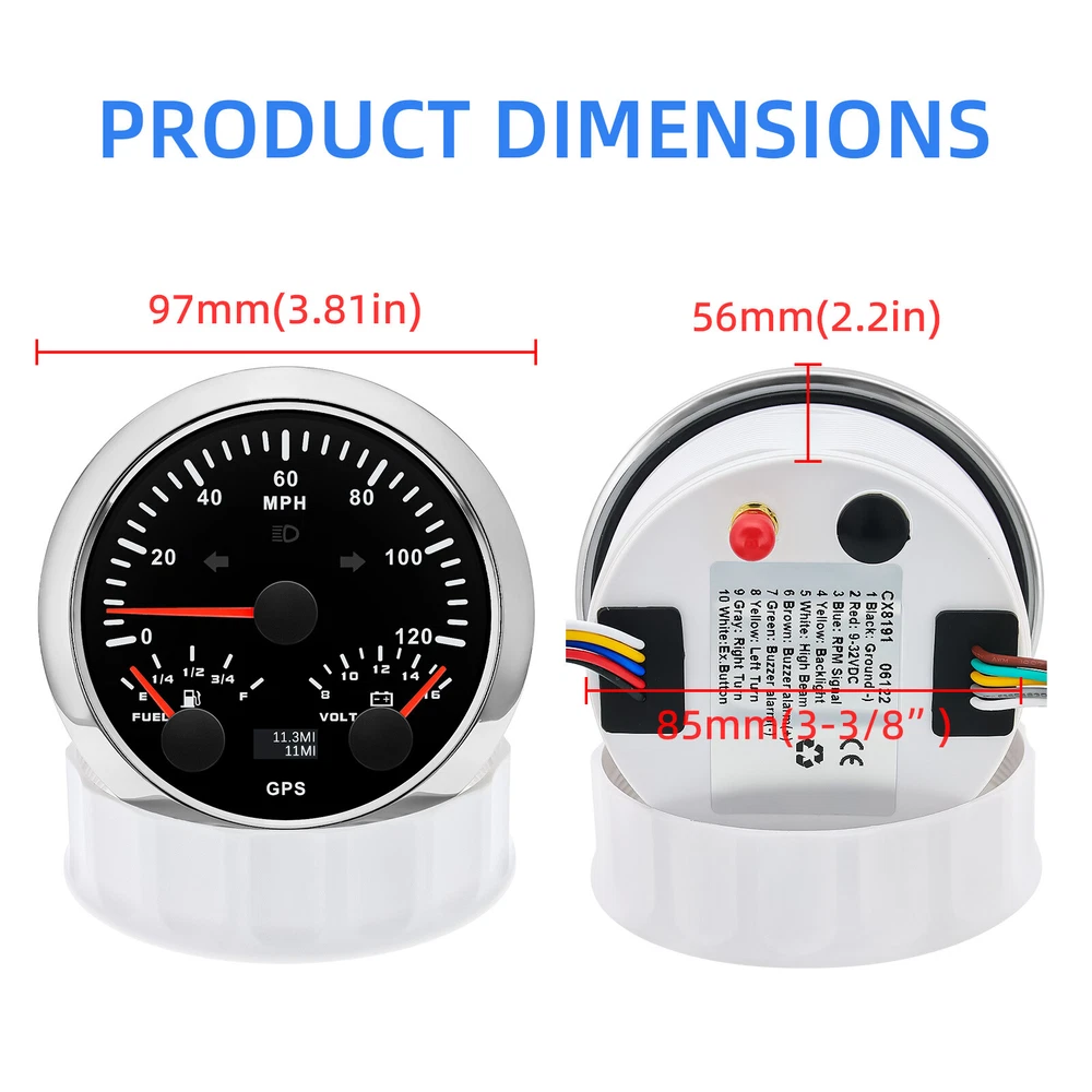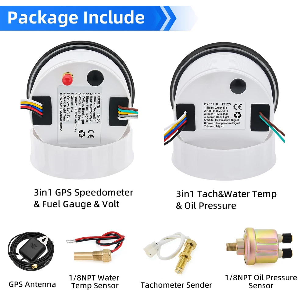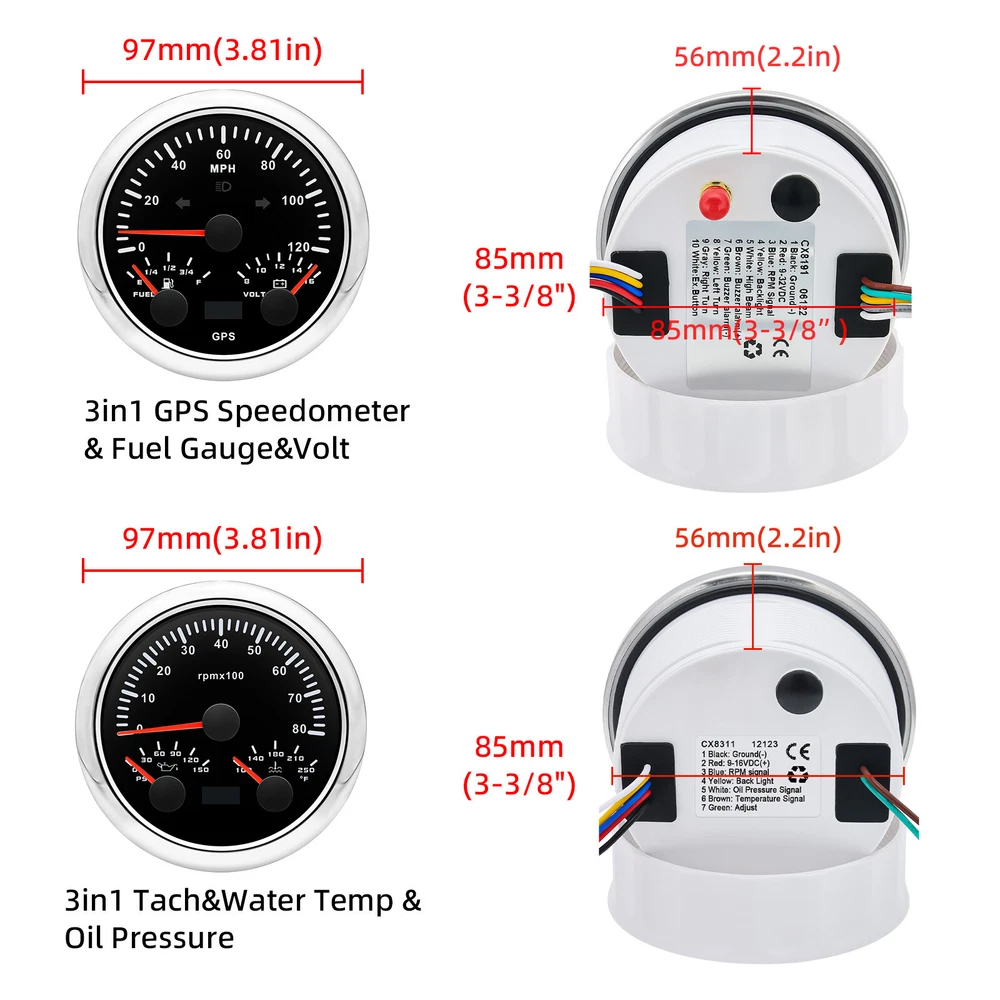 85mm GPS Speedometer 0-120MPH Fuel Volt & 85mm Tachometer/Oil/Temp with Senders 2 Gauge Set With Senders 85mm GPS Speedometer 0-120MPH Fuel Gauge Volt Tachometer 0-6000RPM Water Temp ℉ Oil Press PSI NOTES: The water temperature gauge, Oil pressure gauge does not support desktop testing. It is necessary to connect the SENDING UNITS in order to use it properly. Any helps, please do not hesitate to contact me. Thank you Features: RPM Tachometer Support : Car /Truck/ Boat /Diesel Generator Engine /Gasoline Engine Waterproof:IP67 Excellent anti-fogging function; 316 Stainless steel bezel with curved glass; Convenient Installation by multi-plug socket connecting way; With curved glass( with anti-fog function). 7 colors baclight for your choose (red (default)→green →blue →white →yellow →cyan →Purple→(automatic)),customers can adjust any color that you like Tachometer fit for Car /Truck/ Boat /Diesel Generator Engine /Gasoline Engine CX8307 GPS Speedometer Specification: Size: 85mm GPS Speedometer: 0-120MPH Fuel level: 0-190ohms, 240-33ohms, 10-180ohms, 0-90ohms(Can be adjusted) Voltage: 8-16V Working voltage: 9-32VDC Working current: <100mA Working temperature: -30-80℃ Storage temperature: -40-85℃ Backlight :7 Color backlight Color: Black CX8309 Tachometer Specification: Size: 85mm Tachometer: 0-6000RPM Oil pressure: 0-150PSI Water temperature: 100-250℉ Engine hours: 0.0-99999.9H Working voltage: 9-32VDC Working current: <100mA Working temperature: -30-80℃ Storage temperature: -40-85℃ Backlight :7 Color backlight Color: Black Input parameter Oil pressure sensor: 10~184ohms Temperature sensor: 301~22ohms CX8309 Connection 1 Black: Ground(-) 2 Red: 9-32vDC(+) 3 Blue:PRM signal 4 Yellow: Backlight 5 White: Oil pressure signal 6 Brown:Temperature signal 7 Green:Adjust CX8307 Connection 1 Black : Ground(-) 2 Red : 9~32vDc(+) 3 Blue : Fuel signal 4 Yellow : BackLight 5 White : High Beam 6 Brown: Buzzer alarm(+) 7 Green: Nc 8 Yellow: Left Turn 9 Gray: Right Turn 10 white: External Button Package Included: 1 x 85mm 3 in 1 GPS Speedometer 1 x 85mm 3 in 1 Tachometer Gauge 1 x Tacho Sensor 1 x 1/8NPT Temp sensor 1 x 1/8NPT Pressure sensor 2 x Cable 2 x Installation Instruction