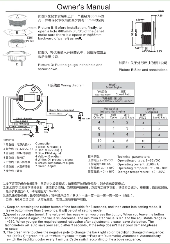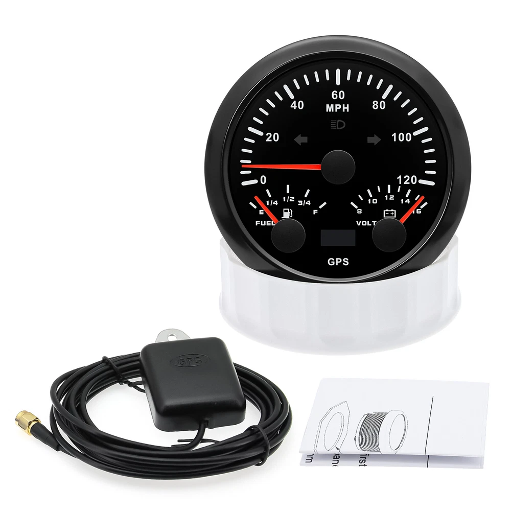 85mm GPS Speedometer 0-120MPH Fuel/Volt/Tacho/Oil Press/Water Temp with Senders 2 Gauge Set With Senders 85mm GPS Speedometer 0-120MPH Fuel Gauge Volt Tachometer 0-8000RPM Water Temp ℉ Oil Press PSI NOTES: The water temperature gauge, Oil pressure gauge does not support desktop testing. It is necessary to connect the SENDING UNITS in order to use it properly. Any helps, please do not hesitate to contact me. Thank you Features: RPM Tachometer Support : Car /Truck/ Boat /Diesel Generator Engine /Gasoline Engine Waterproof:IP67 Excellent anti-fogging function; 316 Stainless steel bezel with curved glass; Convenient Installation by multi-plug socket connecting way; With curved glass( with anti-fog function). 7 colors baclight for your choose (red (default)→green →blue →white →yellow →cyan →Purple→(automatic)),customers can adjust any color that you like Tachometer fit for Car /Truck/ Boat /Diesel Generator Engine /Gasoline Engine GPS Speedometer Specification: Size: 85mm GPS Speedometer: 0-120MPH Fuel level: 0-190ohms, 240-33ohms, 10-180ohms, 0-90ohms(Can be adjusted) Voltage: 8-16V Working voltage: 9-32VDC Working current: <100mA Working temperature: -30-80℃ Storage temperature: -40-85℃ Backlight :7 Color backlight Color: Black Tachometer Specification: Size: 85mm Tachometer: 0-8000RPM Oil pressure: 0-150PSI Water temperature: 100-250℉ Engine hours: 0.0-99999.9H Working voltage: 9-32VDC Working current: <100mA Working temperature: -30-80℃ Storage temperature: -40-85℃ Backlight :7 Color backlight Color: Black Input parameter Oil pressure sensor: 10~184ohms Temperature sensor: 301~22ohms Tachometer Connection 1 Black: Ground(-) 2 Red: 9-32vDC(+) 3 Blue:PRM signal 4 Yellow: Backlight 5 White: Oil pressure signal 6 Brown:Temperature signal 7 Green:Adjust GPS Speedometer Connection 1 Black : Ground(-) 2 Red : 9~32vDc(+) 3 Blue : Fuel signal 4 Yellow : BackLight 5 White : High Beam 6 Brown: Buzzer alarm(+) 7 Green: Nc 8 Yellow: Left Turn 9 Gray: Right Turn 10 white: External Button Package Included: 1 x 85mm 3 in 1 GPS Speedometer 1 x 85mm 3 in 1 Tachometer Gauge 1 x GPS Antenna 1 x 1/8NPT Temp sensor 1 x 1/8NPT Pressure sensor 2 x Cable 2 x Installation Instruction