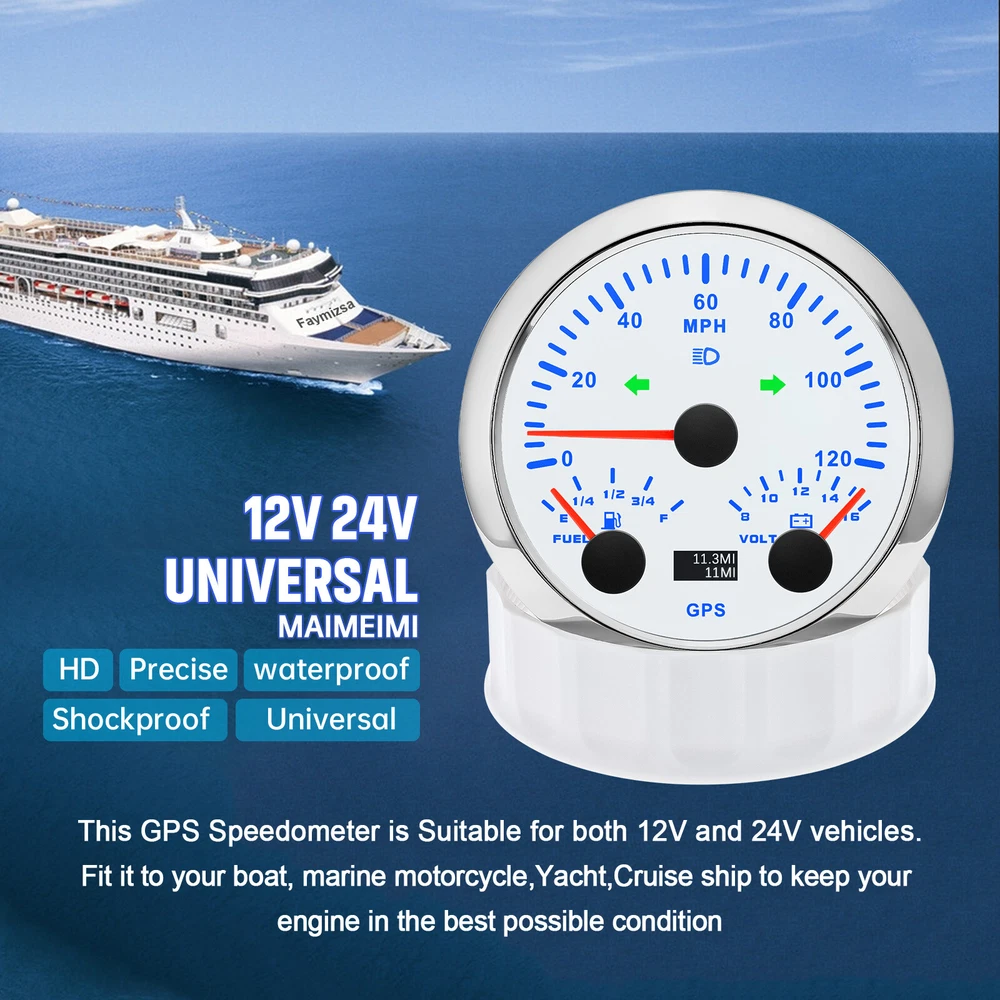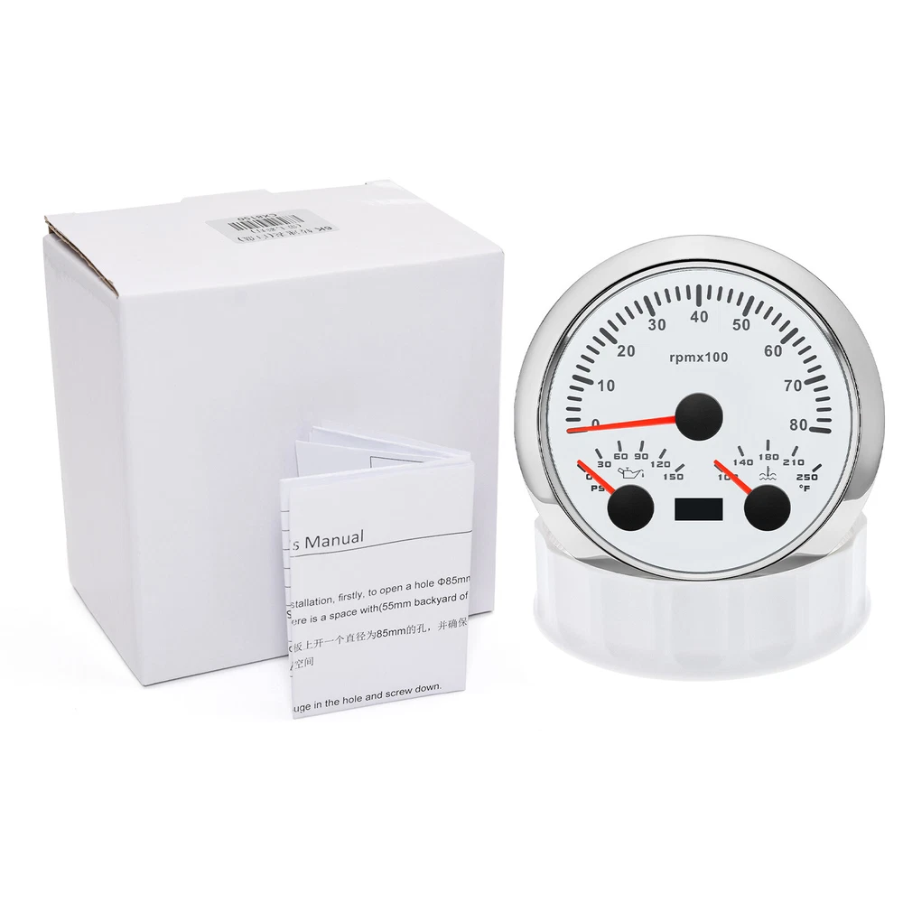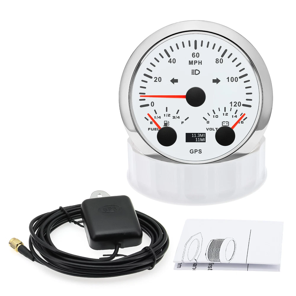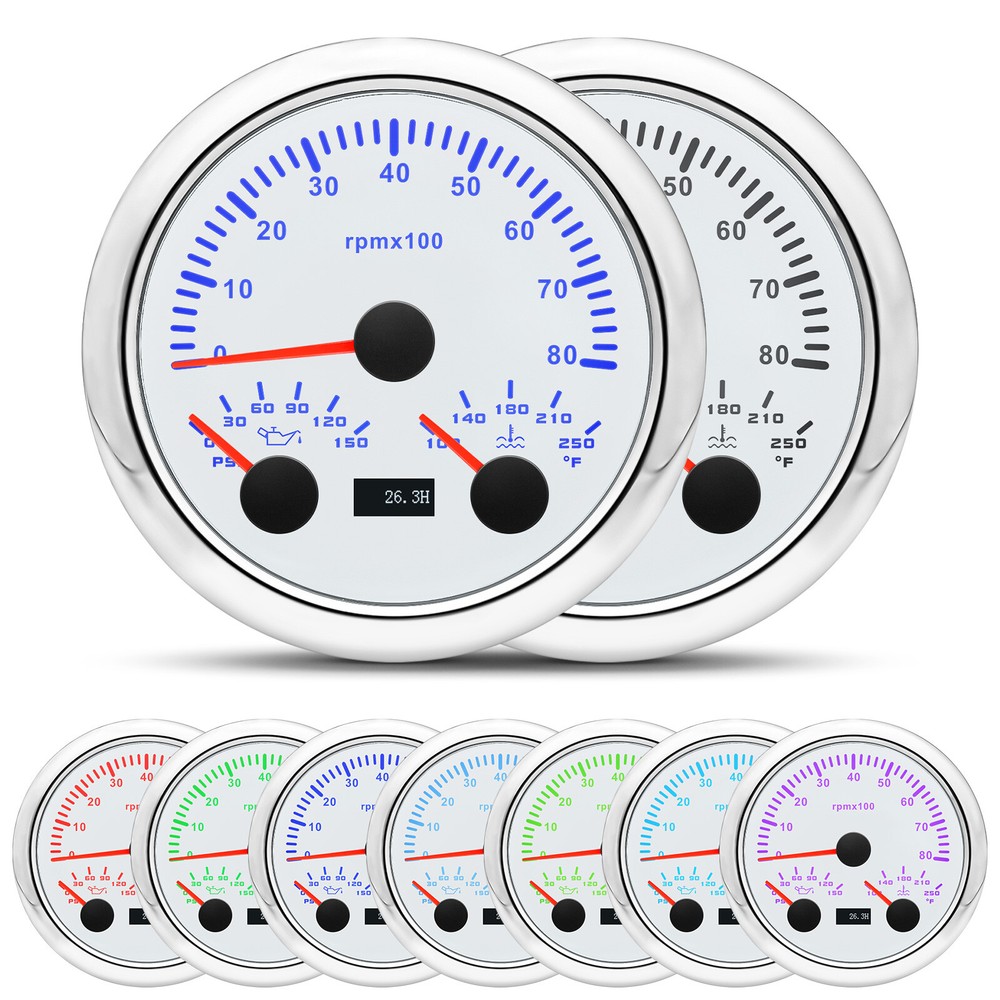 85mm GPS Speedometer 0-120MPH Fuel Gauge/Volt/Tacho/Oil/WaterTemp with Senders 2 Gauge Set With Senders 85mm GPS Speedometer 0-120MPH Fuel Gauge Volt Tachometer 0-8000RPM Water Temp ℉ Oil Press PSI NOTES: The water temperature gauge, Oil pressure gauge does not support desktop testing. It is necessary to connect the SENDING UNITS in order to use it properly. Any helps, please do not hesitate to contact me. Thank you Features: RPM Tachometer Support : Car /Truck/ Boat /Diesel Generator Engine /Gasoline Engine Waterproof:IP67 Excellent anti-fogging function; 316 Stainless steel bezel with curved glass; Convenient Installation by multi-plug socket connecting way; With curved glass( with anti-fog function). 7 colors baclight for your choose (red (default)→green →blue →white →yellow →cyan →Purple→(automatic)),customers can adjust any color that you like Tachometer fit for Car /Truck/ Boat /Diesel Generator Engine /Gasoline Engine GPS Speedometer Specification: Size: 85mm GPS Speedometer: 0-120MPH Fuel level: 0-190ohms, 240-33ohms, 10-180ohms, 0-90ohms(Can be adjusted) Voltage: 8-16V Working voltage: 9-32VDC Working current: <100mA Working temperature: -30-80℃ Storage temperature: -40-85℃ Backlight :7 Color backlight Color: White Tachometer Specification: Size: 85mm Tachometer: 0-8000RPM Oil pressure: 0-150PSI Water temperature: 100-250℉ Engine hours: 0.0-99999.9H Working voltage: 9-32VDC Working current: <100mA Working temperature: -30-80℃ Storage temperature: -40-85℃ Backlight :7 Color backlight Color: White Input parameter Oil pressure sensor: 10~184ohms Temperature sensor: 301~22ohms Tachometer Connection 1 Black: Ground(-) 2 Red: 9-32vDC(+) 3 Blue:PRM signal 4 Yellow: Backlight 5 White: Oil pressure signal 6 Brown:Temperature signal 7 Green:Adjust GPS Speedometer Connection 1 Black : Ground(-) 2 Red : 9~32vDc(+) 3 Blue : Fuel signal 4 Yellow : BackLight 5 White : High Beam 6 Brown: Buzzer alarm(+) 7 Green: Nc 8 Yellow: Left Turn 9 Gray: Right Turn 10 white: External Button Package Included: 1 x 85mm 3 in 1 GPS Speedometer 1 x 85mm 3 in 1 Tachometer Gauge 1 x Fuel level sending units 240-33ohms 1 x 1/8NPT Temp sensor 1 x 1/8NPT Pressure sensor 2 x Cable 2 x Installation Instruction