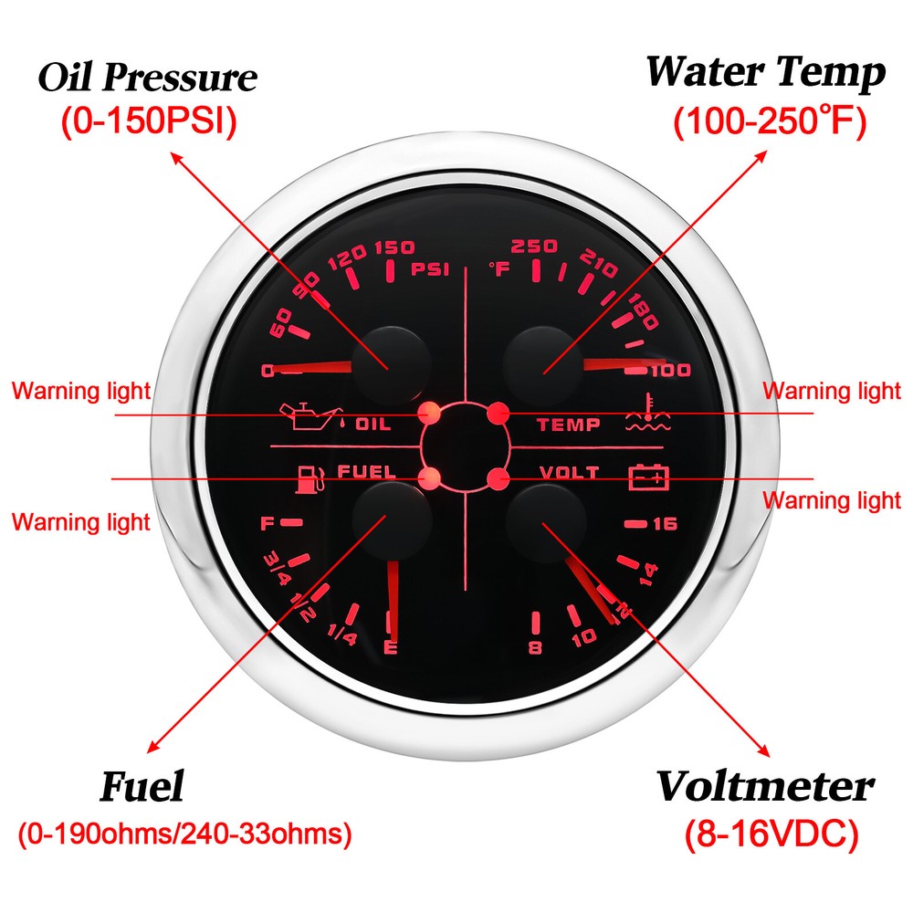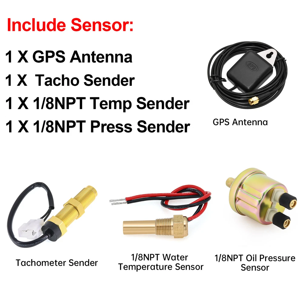 85mm GPS Speedometer 0-200MPH W/tachometer & 85mm 4 in 1 Gauge SET with Senders 2 Gauge Set With Senders 85mm GPS Speedometer 0-120MPH with 85mm Fuel Level Water Temp Oil Pressure Volt Features: Suitable for all vehicles and off-road vehicles The signal comes directly from the satellite signal receiver(GPS Antenna), don't need other speed sensor. The gauge has the advantages of high precision, quick location confirmation and short start up time. IP67 waterproof and dustproof grade Reverse polarity protection and anti-fogging performance Stepper motors used for full range of stepping gauges, great feature with its less power consumption, longer life, higher precision, etc. Most importantly, the gauge is easy to setup, and can be used in all vehicles, boats and off-road vehicles. GPS Speedometer Specifications: Application: Universal fit for Motorcycle/ Boat/Truck/Bus/Car Electronic Speedometer (stepper motor) No Mechanic Sensor, get speed signal from GPS Speed ≠0 and show accurate speed in tunnel with the help of accelerometer Total Mileage Adjustable GPS Blind Area Odometer Compensation OverSpeed Buzzer Alarm (Value Adjustable) Indication Light (Left, Right and High Beam Installation Diameter: 85mm (3 3/8") Speed Range: 0~120MPH RPM Range : 0~8000RPM Mileage Range: 0-99999.9miles Working Voltage: 12V/24V Working temperatures: - 40 to 85°C Protection rank: IP67 Waterproof Reverse polarity protection and anti-fogging performance 4 IN 1 Gauge Technical Data: Fixing dimension: 85mm Indicating Range: Oil press. meter: 0-150PSI Water temp. meter: 100-250℉ Fuel level meter: 0-190ohms/240-33ohms, empty-full; The signal can be adjusted Voltmeter: 8-16V Working Voltage: 12V Input Signal: 10-184ohms for 0-150PSIoil pressure meter; 0-190ohms for fuel level meter;(Default 0-190ohms, can adjust to 240-33ohms) 8-16V voltage meter; Input Signal 320-22ohms for water temperature meter Red backlight Protection grade is IP67, the whole body is completely waterproof; Excellent antifogging function; 316 Stainless steel bezel with curved glass; Convenient Installation by multi-plug socket connecting way; Accessories: matched with connectors, Installation Instruction Package Included: 1 x 85mm 4 in 1 Multifunctional Gauge 1 x 85mm GPS Speedometer Gauge 1 x M16*1.5 Tacho Sensor 1 x 1/8NPT Oil pressure Sensor 1 x 1/8NPT Water Temp Sensor 1 x GPS Antenna 2 x Cable 2 x Installation Instruction
