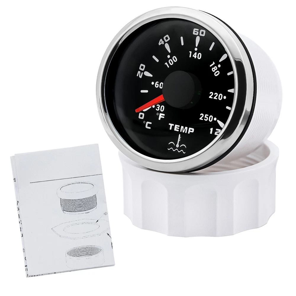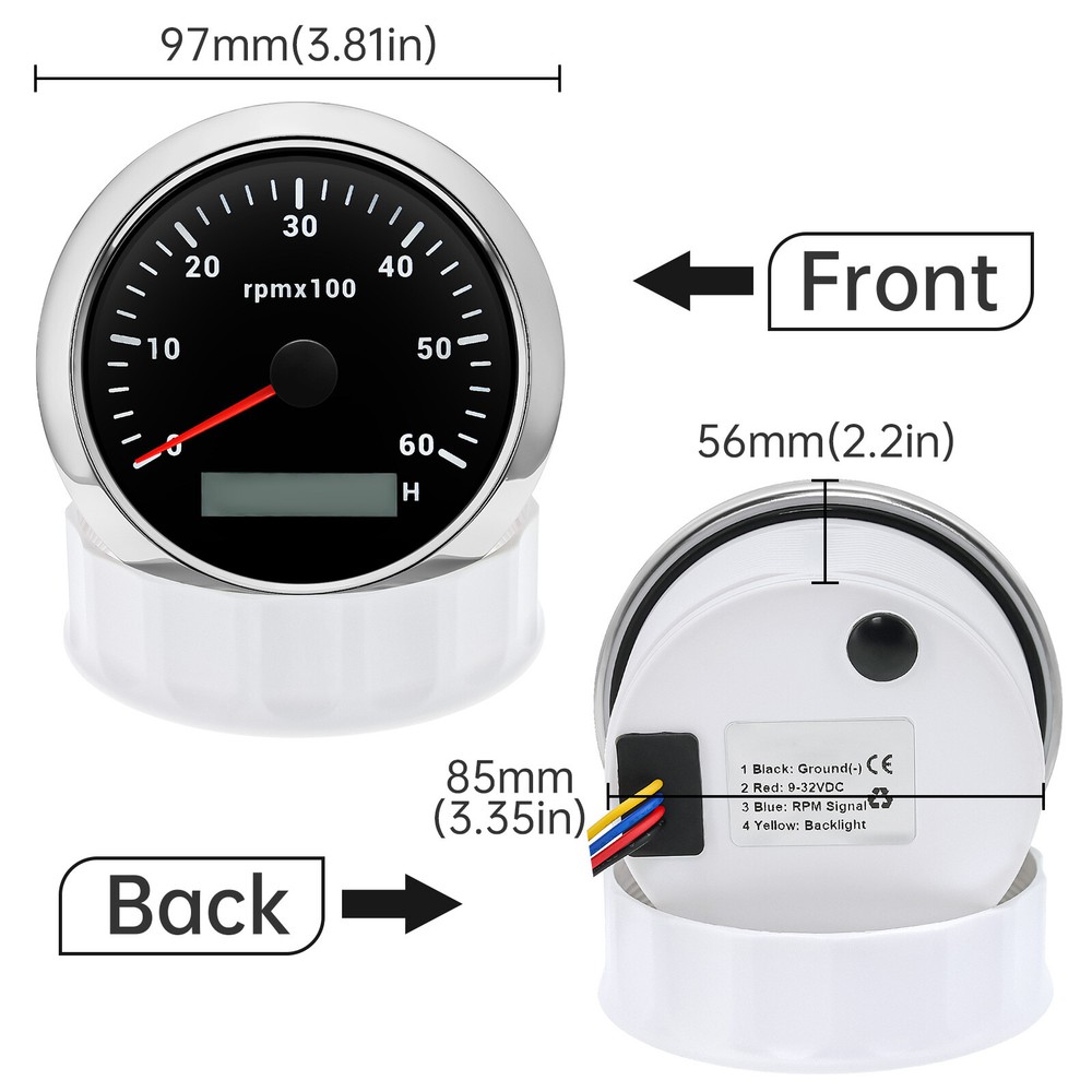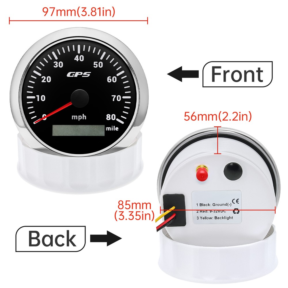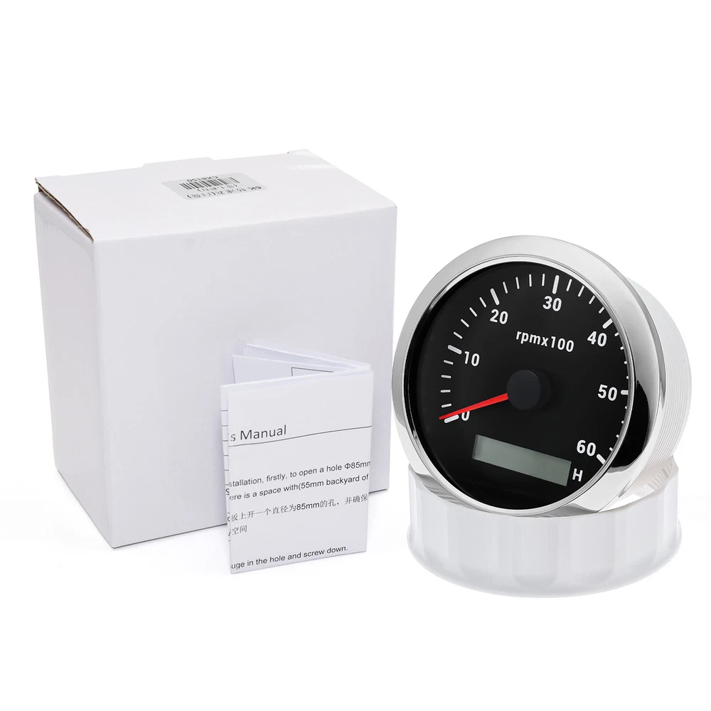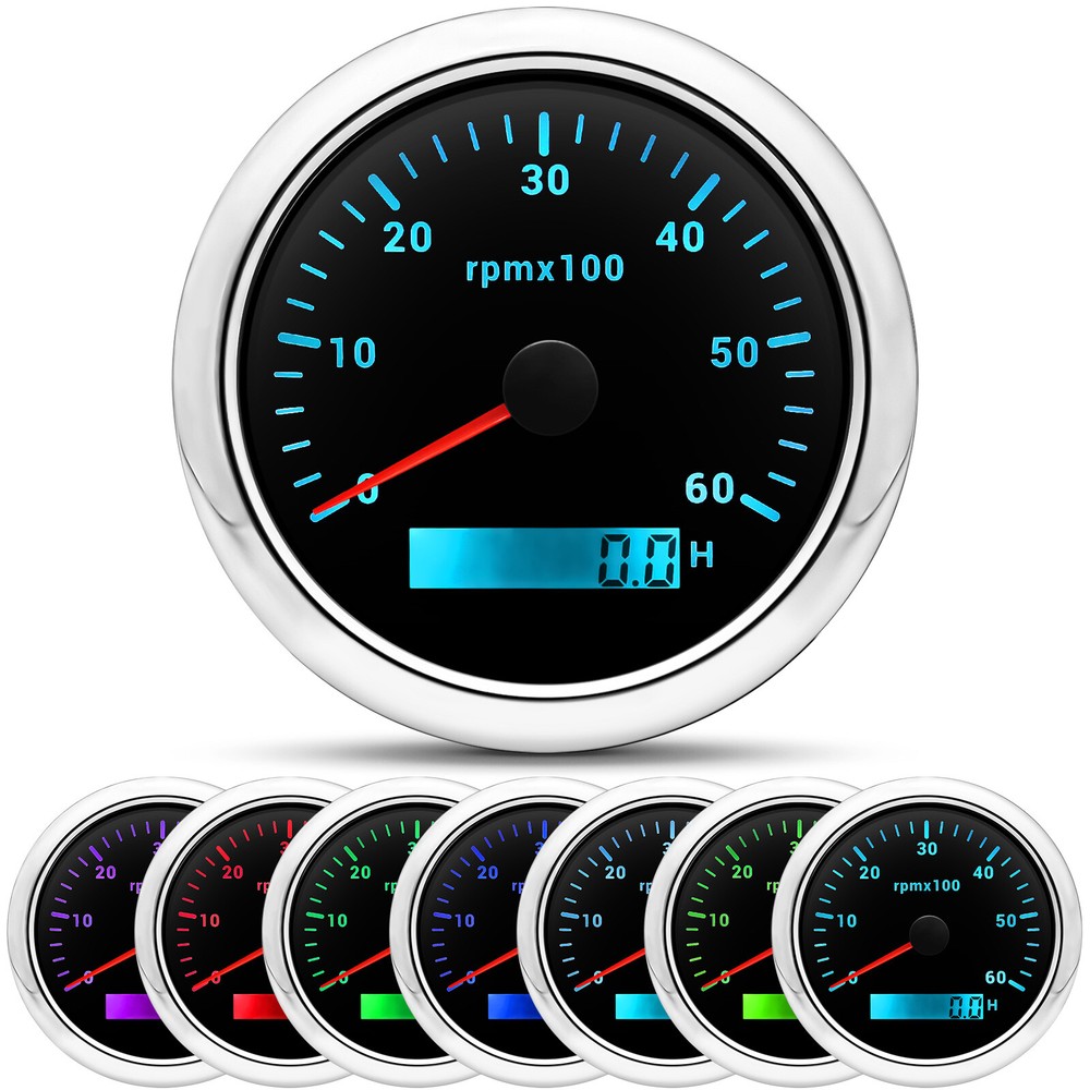 6 Gauge Set with Sensor 85mm GPS Speedometer 80MPH Tacho 6000RPM Gauge for Boat 6 Gauge Set with Sensor 85mm GPS Speedometer 80MPH Tacho 6000RPM Gauge for Boat Features: Suitable for all cars,tractors,vans,vessels,boats,yachts,etc. The signal comes directly from the satellite signal receiver (GPS Speed Sensor) The gauge has the advantages of high precision, quick location confirmation and short start up time. IP67 waterproof and dustproof grade. Stepper motors used for full range of stepping gauges, great feature with its less power consumption,longer life,higher precision,etc. With curved glass (with anti-fogging function). With ultra-wide working voltage design( long-term operating voltage:9-32V,Maximum up to: 36V (≤ 1 min)). Technical Data: Fixing dimension:85mm(3-3/8 inches) Indicating Range:0-80MPH Item: Black&Siliver Working Voltage:9-32VDC(12VDC/24VDC) 7 Backlight color:red,green,blue,white,yellow,cyan,purple Tachometer Engine hours:0.0-99999.9H Backlight :7 Color backlight Indicating Range:0~6000 RPM Signal :Pulse For Tachometer,you can substitute for different unit,please contact us before/after purchase or note on the order. Tachometer:0-3000rpm/0-4000RPM/6000RPM/7000RPM Volt Gauge Sizes: 52 mm (2-1/16") Measuring Range:8 - 16 (V) Backlight:7 Colors Fuel Level Gauge Sizes: 52 mm (2-1/16") Measuring Range:Empty - Full Resistance:240 (E)-33 (F) ohms Backlight: 7 Colors Water Temperature Gauge Install diameter: Φ52mm Indication range: 0~120℃/30-250℉ Input signal: 287.4~22.4 ohm Storage temperature: -40~+85 Backlight: 7 Colors Oil Pressure Gauge Install diameter:Φ52mm or 2-1/16" Indication range:0~10bar / 0-150 PSI Operating temperature:-30~+75 Storage temperature:-40~+85 Backlight: 7 Colors Trim Gauge: 7 Color Backlight : Red (default)→green → blue → white →yellow→cyan →Purple →(automatic). Fixing dimension: 52mm(2'') Indicating Range: UP-DN Signal: 0-190ohms Working Voltage: 9-32V(12V/24V) Operation mode: LCD display, stepper moto Package Includes: 1X 85MM Digital GPS Speedometer Gauge 1X GPS Antenna 1X Tachometer 1X Voltmeter 1X Fuel level gauge 1XTrim Gauge 1X Water temp gauge 1X Oil pressure gauge 1x Rudder Angle Sensor 1x Fuel level Sending Units (240-33ohms) 1X Oil pressure Sensor (1/8NPT) 1X water temp Sensor (1/8NPT) 1X Tachometer Sensor(M16*1.5) Installation Instruction NOTES: The Sending units will be included