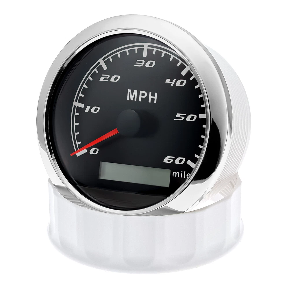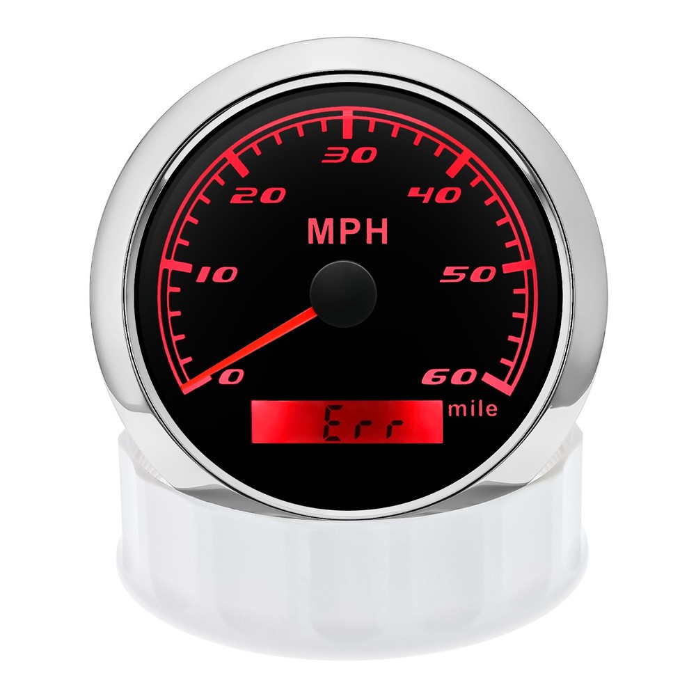 85mm GPS Speedometer 0-60MPH Odometer Gauge 7 Colors LED For Car Truck Boat 85mm GPS Speedometer Gauge Odometer 0-60MPH 7 Colors LED for Car Boat Motorcycle Specifications: Dial: Black Material: Stainless Steel 316L Bezel + Anti-fog Glass Install Diameter: Φ85mm or 3-3/8" Signal: GPS Working Voltage: 9~32V DC Working Current: ≤100mA Operating Temperature: -30℃ ~ 75℃ Storage Temperature: -40℃ ~ 85℃ Size: 12x8x12cm / 4.72x3.1x4.75 inch IP67 waterproof and dustproof grade Indication Range: 0-60 MPH Backlight:7 Colors Backligt Product Descriptions High-brightness LED backlight. 316 stainless steel for long-term use even in acid-base, humid environment. IP67 waterproof and dust-proof grade. With curved glass( with anti-fog function). Suitable for all kinds of vehicle modification. Using stepper motor drive pointer, accurate display of the engine speed, and with the LCD display clear display mileage. Gauges have many kinds backlight color (red,yellow,orange,green,blue,purple,white),customers can adjust any color that you like. Package Includes: 1X 85MM Digital GPS Speedometer Gauge 1X Instruction 1X GPS Antenna
