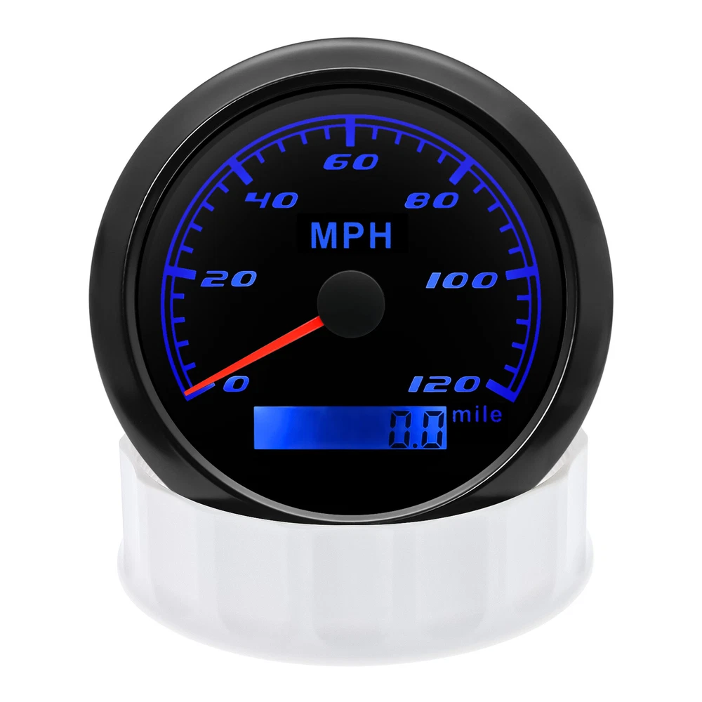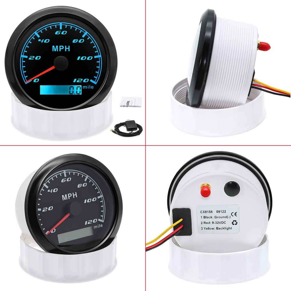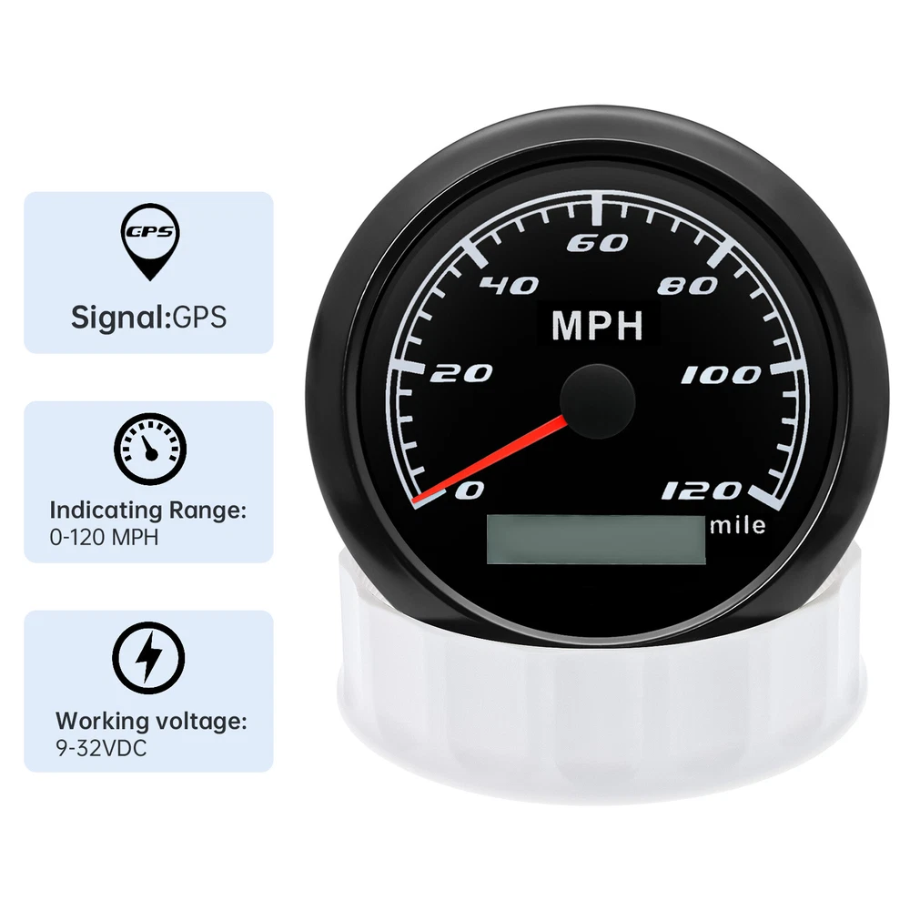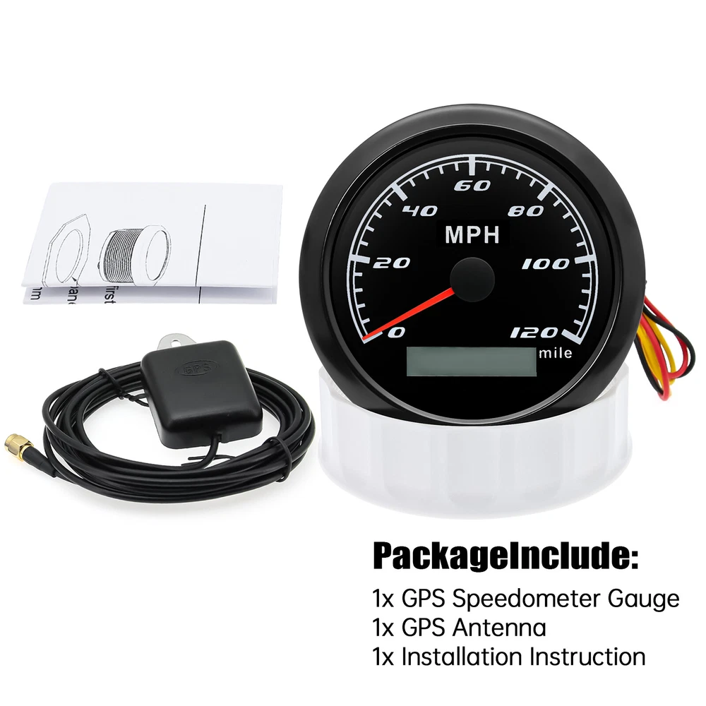 85mm GPS Speedometer 0-120MPH Gauge for Car Truck Motorcycles Boat Waterproof 85mm GPS Speedometer Gauge Odometer 0-120 MPH 7 Colors LED for Car Boat Motorcycle Specifications: Dial: Black Material: Stainless Steel 316L Bezel + Anti-fog Glass Install Diameter: Φ85mm or 3-3/8" Signal: GPS Working Voltage: 9~32V DC Working Current: ≤100mA Operating Temperature: -30℃ ~ 75℃ Storage Temperature: -40℃ ~ 85℃ Size: 12x8x12cm / 4.72x3.1x4.75 inch IP67 waterproof and dustproof grade Indication Range: 0-120 MPH Backlight:7 Colors Backligt Product Descriptions High-brightness LED backlight. 316 stainless steel for long-term use even in acid-base, humid environment. IP67 waterproof and dust-proof grade. With curved glass( with anti-fog function). Suitable for all kinds of vehicle modification. Using stepper motor drive pointer, accurate display of the engine speed, and with the LCD display clear display mileage. Gauges have many kinds backlight color (red,yellow,orange,green,blue,purple,white),customers can adjust any color that you like. Package Includes: 1X 85MM Digital GPS Speedometer Gauge 1X Instruction 1X GPS Antenna