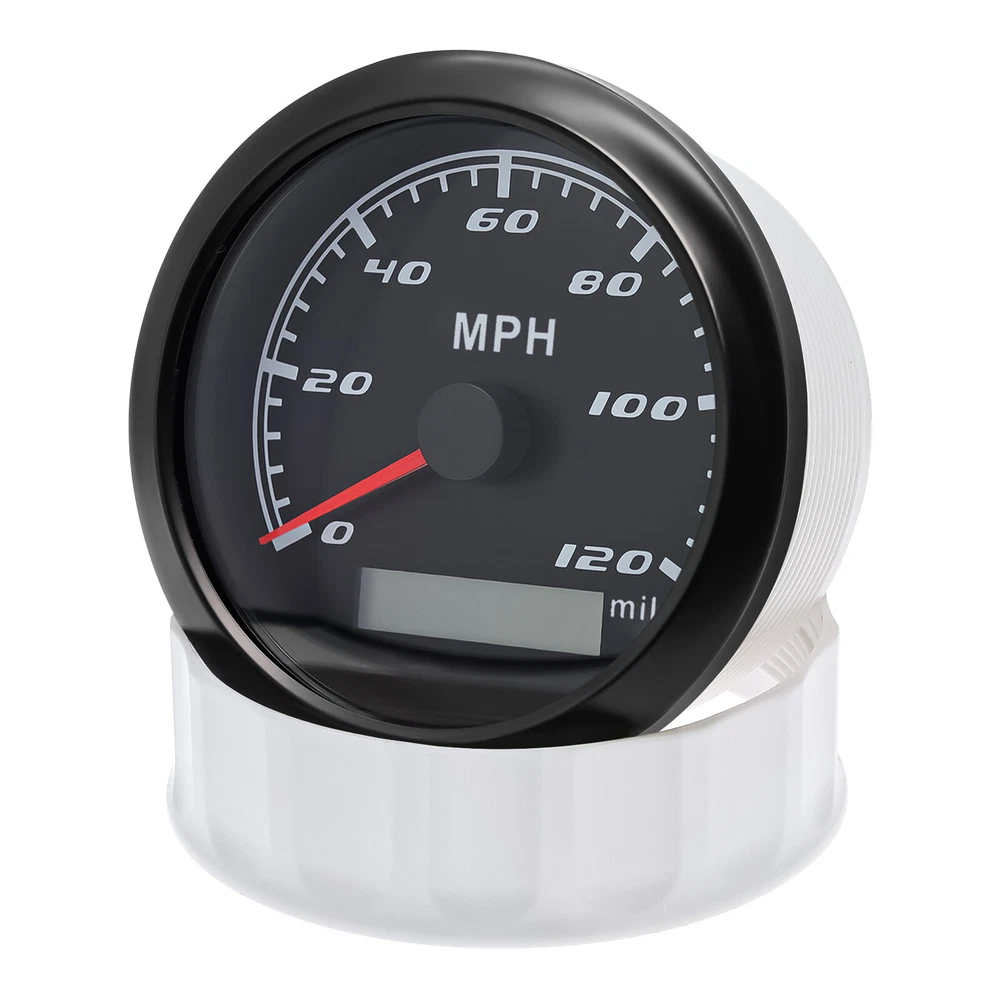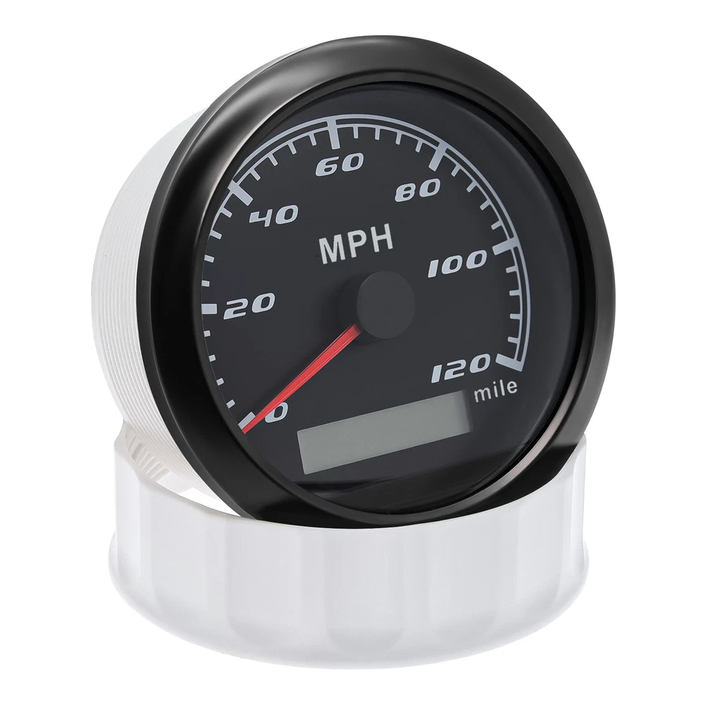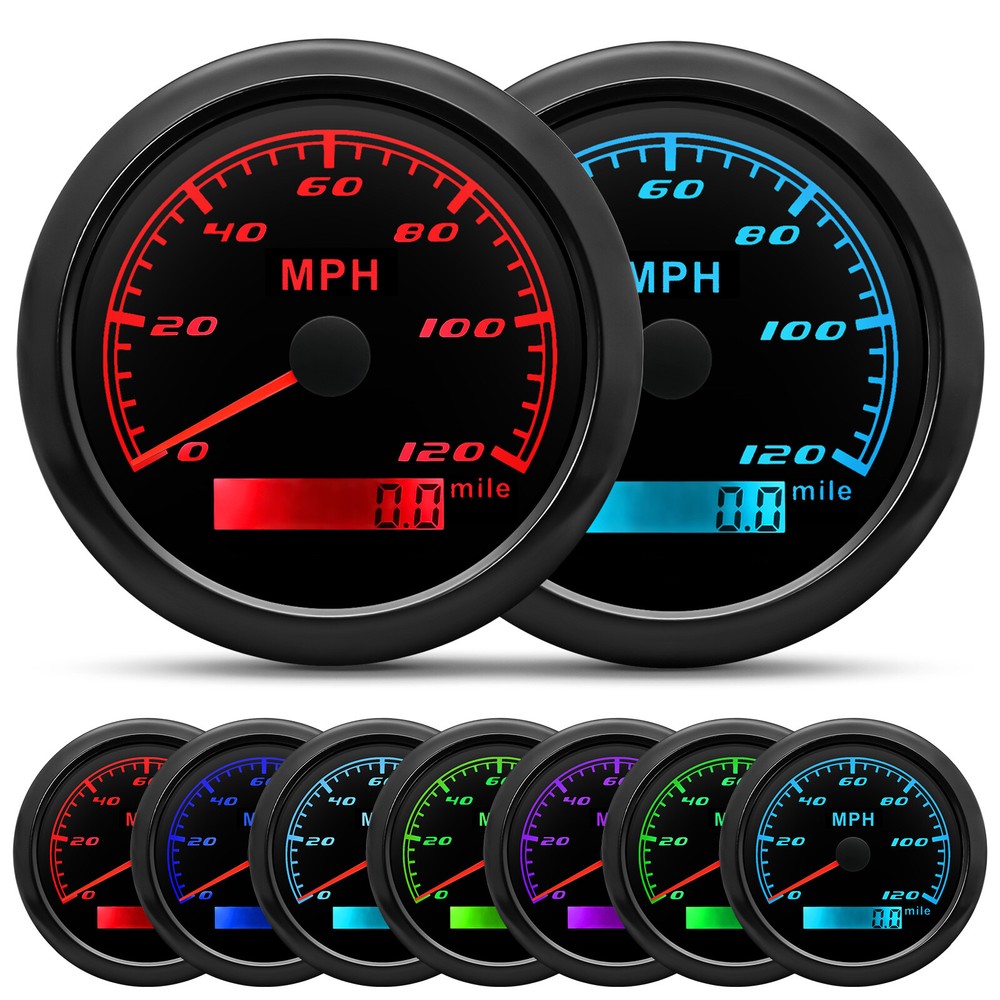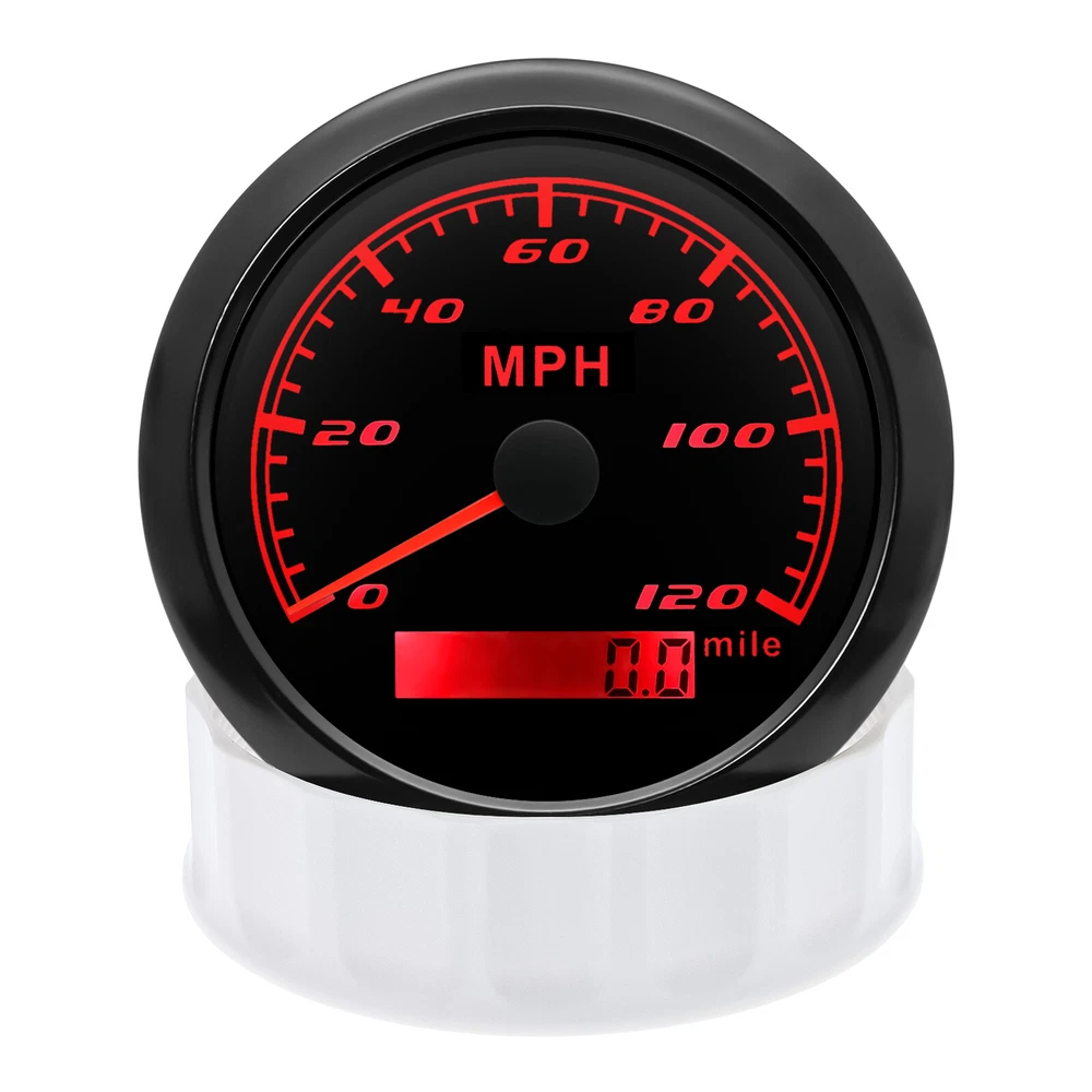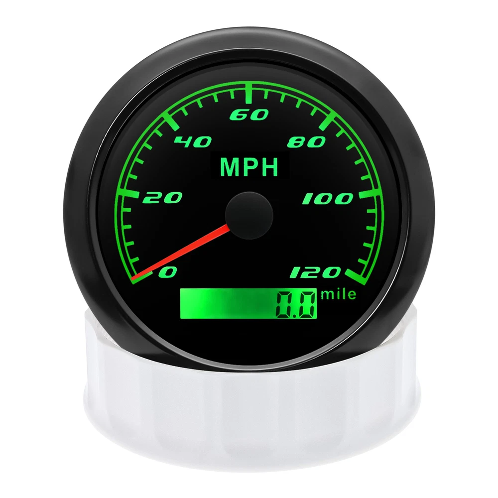 85mm GPS Speedometer 0-120MPH Gauge for Car Truck Motorcycles Boat Waterproof 85mm GPS Speedometer Gauge Odometer 0-120 MPH 7 Colors LED for Car Boat Motorcycle Specifications: Dial: Black Material: Stainless Steel 316L Bezel + Anti-fog Glass Install Diameter: Φ85mm or 3-3/8" Signal: GPS Working Voltage: 9~32V DC Working Current: ≤100mA Operating Temperature: -30℃ ~ 75℃ Storage Temperature: -40℃ ~ 85℃ Size: 12x8x12cm / 4.72x3.1x4.75 inch IP67 waterproof and dustproof grade Indication Range: 0-120 MPH Backlight:7 Colors Backligt Product Descriptions High-brightness LED backlight. 316 stainless steel for long-term use even in acid-base, humid environment. IP67 waterproof and dust-proof grade. With curved glass( with anti-fog function). Suitable for all kinds of vehicle modification. Using stepper motor drive pointer, accurate display of the engine speed, and with the LCD display clear display mileage. Gauges have many kinds backlight color (red,yellow,orange,green,blue,purple,white),customers can adjust any color that you like. Package Includes: 1X 85MM Digital GPS Speedometer Gauge 1X Instruction 1X GPS Antenna
