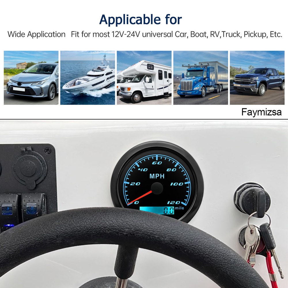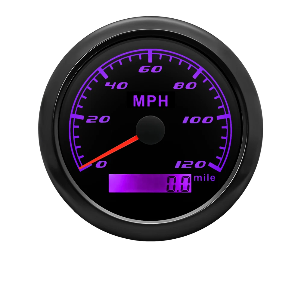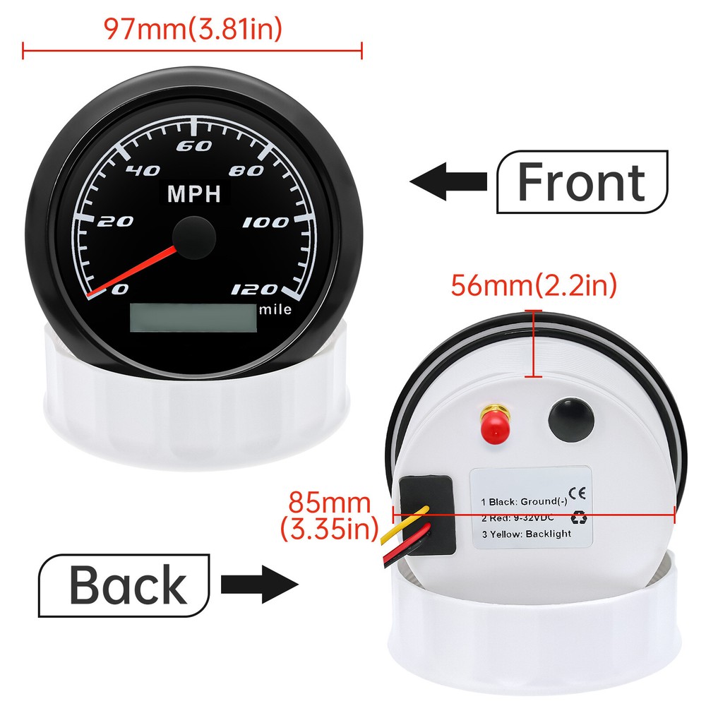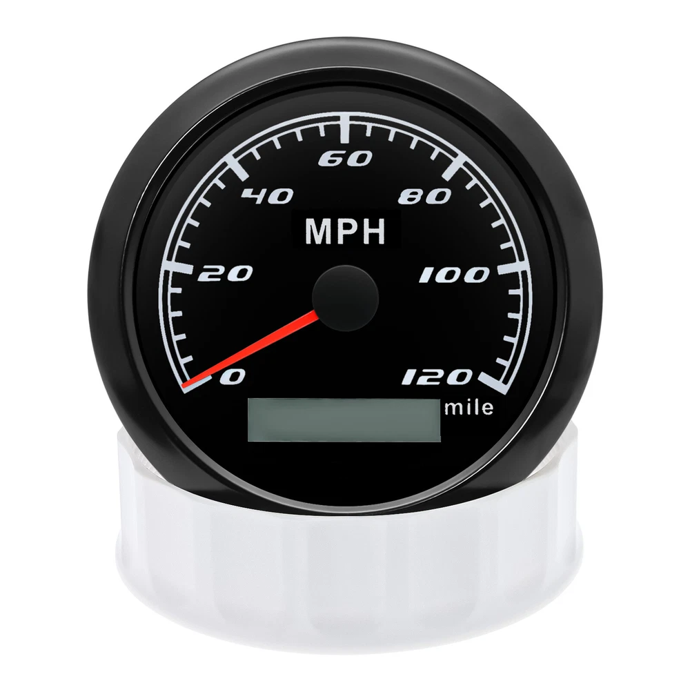 85mm GPS Speedometer 0-120MPH Gauge for Car Truck Motorcycles Boat Waterproof 85mm GPS Speedometer Gauge Odometer 0-120 MPH 7 Colors LED for Car Boat Motorcycle Specifications: Dial: Black Material: Stainless Steel 316L Bezel + Anti-fog Glass Install Diameter: Φ85mm or 3-3/8" Signal: GPS Working Voltage: 9~32V DC Working Current: ≤100mA Operating Temperature: -30℃ ~ 75℃ Storage Temperature: -40℃ ~ 85℃ Size: 12x8x12cm / 4.72x3.1x4.75 inch IP67 waterproof and dustproof grade Indication Range: 0-120 MPH Backlight:7 Colors Backligt Product Descriptions High-brightness LED backlight. 316 stainless steel for long-term use even in acid-base, humid environment. IP67 waterproof and dust-proof grade. With curved glass( with anti-fog function). Suitable for all kinds of vehicle modification. Using stepper motor drive pointer, accurate display of the engine speed, and with the LCD display clear display mileage. Gauges have many kinds backlight color (red,yellow,orange,green,blue,purple,white),customers can adjust any color that you like. Package Includes: 1X 85MM Digital GPS Speedometer Gauge 1X Instruction 1X GPS Antenna