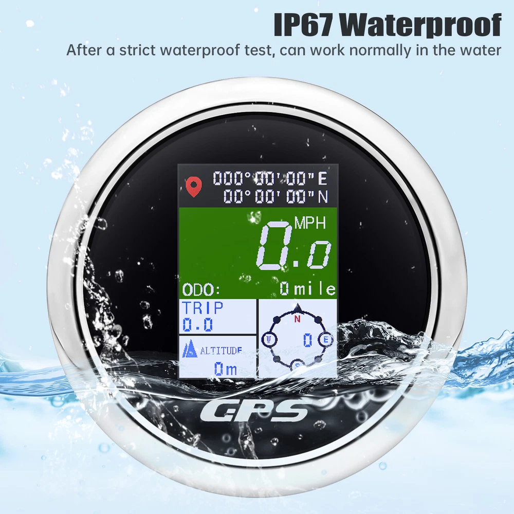85mm Waterproof GPS speedometer Odometer Gauge For Car Truck Motorcycle Boat 85MM Digital GPS Speedometer Odometer Gauge for Marine Boat Car Waterproof NEW Feature: High-brightness LED backlight. 316 stainless steel for long-term use even in acid-base, humid environment. IP67 waterproof and dust-proof grade. With curved glass( with anti-fog function). Suitable for all kinds of vehicle modification. Using stepper motor drive pointer, accurate display of the engine speed, and with the LCD display clear display mileage. Specification Basic description of the instrument: Speedometer display range: 0-999,9mph Total mileage display range: 0-999999mph Indication range of daily kilometres: 0-999,9mph Digital compass: 0-359° Longitude and Latitude ODO: Accumulated mileage power outage data can be saved TRIP: Single mileagezero power down COG: Digital Compass Cog: heading, direction of travel (middle COG is accurate to a specific degree) Three unit can be swicthed: knot; mph; km/h (By touching the button on the back of the instrument, knot, MPH, km/h units can be switched and automatically saved.) Degree of Protection: IP67 Backlight: TFT Screen Input Parameter: GPS signal GPS antenna length 3 meter Dimensions: 85mm diameter (3-3/8'') Package Include: 1*GPS Speedometer 1*GPS Antenna 1*Multi-plug socket 1*Instruction Notes: 1. Please allow 1-3 CM differs due to manual measurement. 2. As different computers display colors differently, the color of the actual item may vary slightly from the above images. Thanks for your understanding.