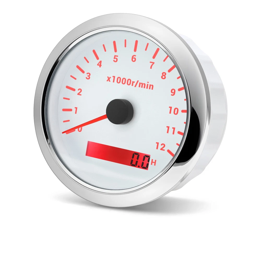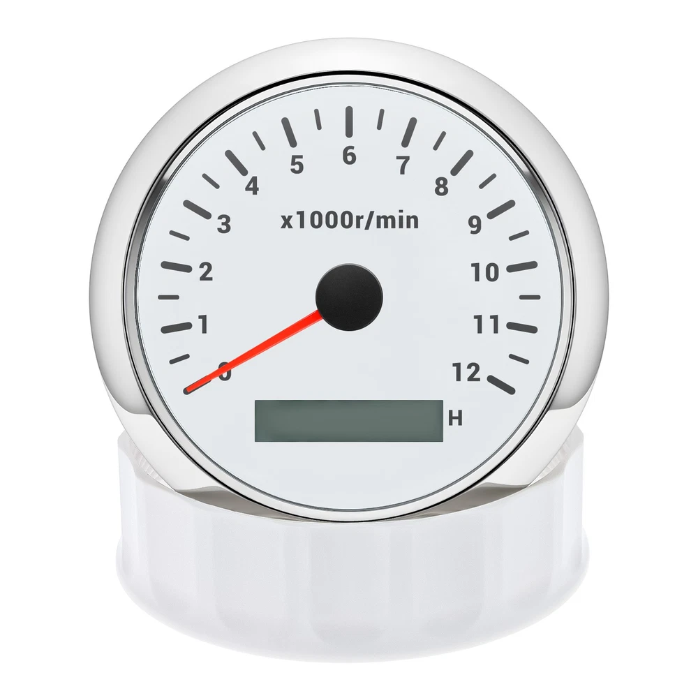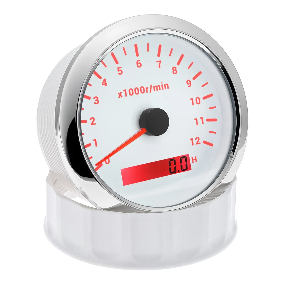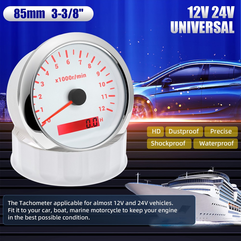 85mm White Tachometer Gauge 0-12000RPM Waterproof For Marine Boat Car Truck 85mm Car Tachometer 0-12000RPM LCD Digital Hourmeter With Red Backlight For Car Truck Motorcycle ATV UTV Marine Boat Yacht Specification: Fit For: Outboard Gas or Disel Engine Car Truck Motorcycle ATV UTV Marine Boat Yacht Face Color: White Face with Chrome bezel Bezel Materials: Stainless Steel Indicating Range: 0-12000RPM Operating Voltage:9-32VDC Operating Current:≤100mA Operating Temperature:-30~+75 ℃ Storage Temperature:-40~+85 ℃ Install diameter: 85mm(3-3/8") Grade of protection :IP67 Package Method :Neutral box Features: -100% Brand new and high quality. -Excellent anti-fogging performance. -316L Stainless steel bezel with curve glass. -Easy installation with multi-plug socket connection design. -RED LED Connection: Red--+9-32VDC Black--Ground(-) Orange--Backlight(+) Blue--Signal Input Package Included: 1xTachometer 1xWiring Harness 1x Instruction manual This tacho must be hooked up to the "W" terminal on vehicle alternator. Many diesel engines and most inboard gas boat engine alternator have this connection. It can also be working with tachometer sender or ECU of the car (pulse signal) Installation instructions: 1.Opening a hole in the panel (your cabin board and dashboard) with a diameter of 85mm,Insert meter into the hole,The panel corresponding to the instrument panel is marked with a convex table,and open a small notch in this location,To ensure that there is at least 85mm of the instrument panel at the back of the instrument. 2.After the instrument is mounted in the panel,Screw down with a fixed ring. 3.Connect the wire,the instrument housing is directly connected to the 12~24V power supply. 4.Insert wire harness,Firmly locked in the table. How to adjust the speed ratio? 1. Turn on the power supply first. 2. Press and hold the mode button for three seconds to enter the setting speed ratio mode. Then adjust the speed ratio of 1-300 according to your request. 3. After setting the data will be saved automatically. 4.If your sensor is installed on the flywheel plate, the speed ratio corresponds to the number of gears of the engine; If the speed signal comes from the W terminal, the speed ratio is equal to half the number of poles. 5.When the engine is idle, the rev counter will normally display 600-800 U.min, which means the transmission ratio is correct. If not, you can reduce or increase the gear ratio to check the speed difference.