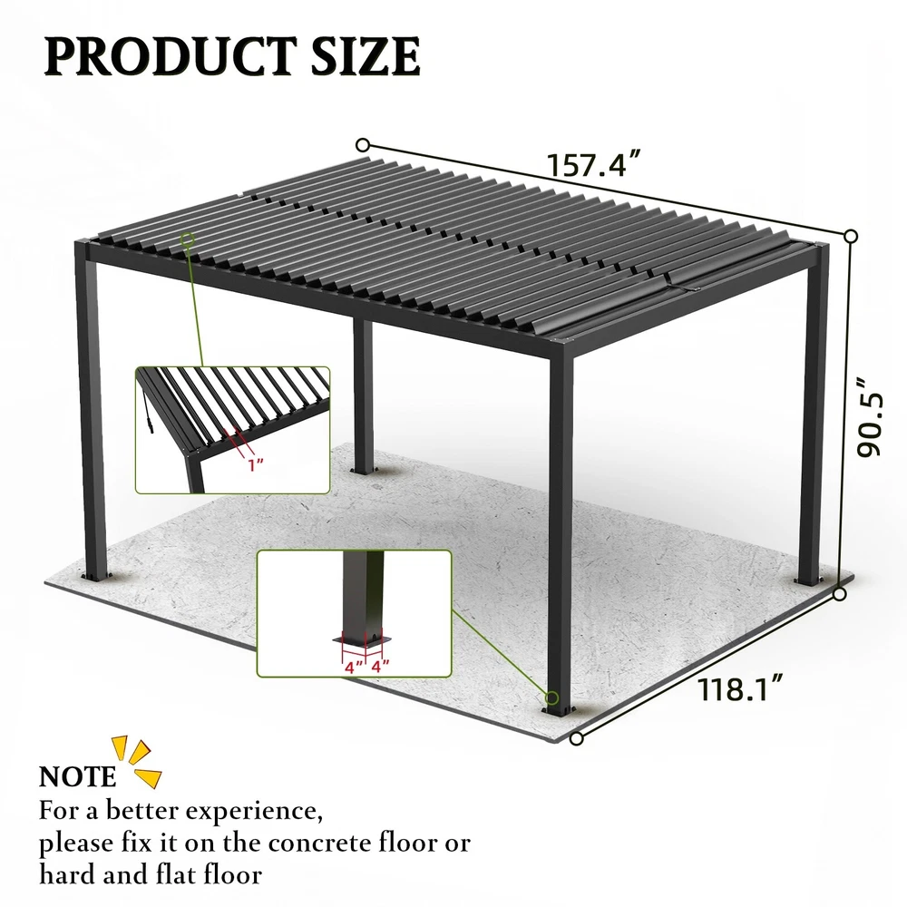 Product Information Main Color: Black Main Material: Aluminium Product Dimensions Item Length (in.): 118.00 Item Width (in.): 157.00 Item Height (in.): 90.50 Weight (lbs.): 356.00 Package Size Length (in.): 152.00 Width (in.): 23.00 Height (in.): 22.40 Weight (lbs.): 415.80 Product Features Premium Material Construction: The pergola is made of a powder-coated aluminum frame and a tilting louvered roof of aluminum that withstands up to 73 mph winds.Durable construction for year-round use Innovative design: a louver roof with adjustable angles lets you control outdoor light and ventilation.Effortlessly open or close the louver roof with a simple crank, adapting to changing weather conditions. Integrated Drainage System: Rainwater will be diverted to the columns through the built-in integrated drainage system, where it will be drained through the notches in the base of the posts. Endless comfort: our pergola creates the perfect outdoor leisure space, fostering cherished memories with family and friends.Ideal for gardens, backyards, parties, and commercial/domestic BBQ use. Multipurpose outdoor solution. Easy to Assemble: Prefabricated rails and Louvers require no special rivets or welds for assembly, and can be stably attached to the ground through the supplied expansion bolts. Attention: Do not allow snow to accumulate on the louver roof. If moderate to heavy snow is expected, open the louvers. In the case of high winds or other extreme weather conditions, open the louvers and raise or remove any shade screen accessories that have been installed to avoid potential damage to your pergola.