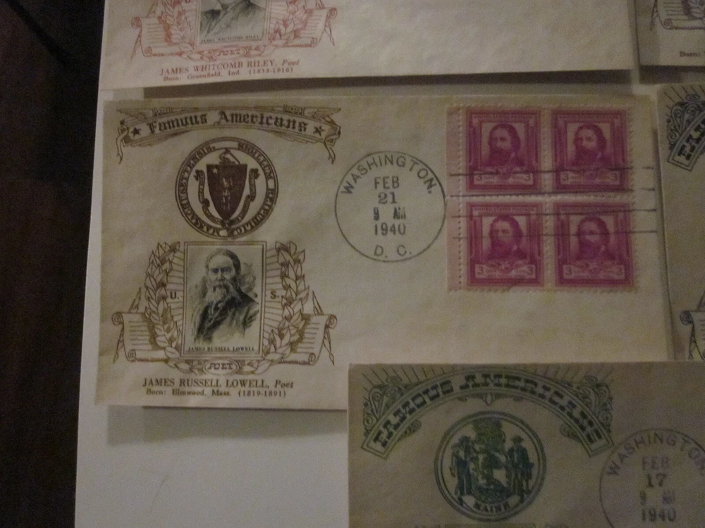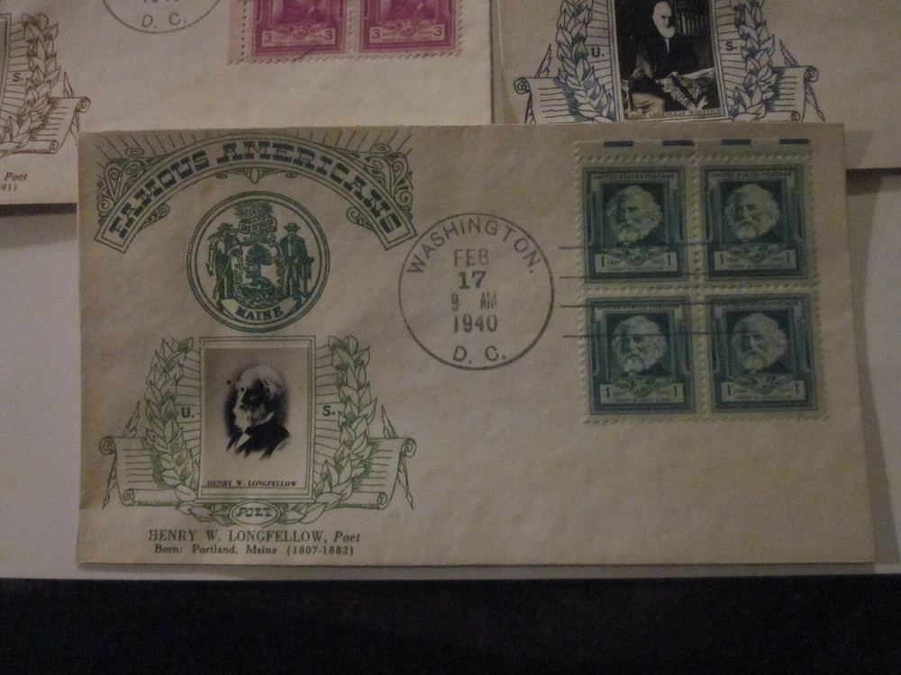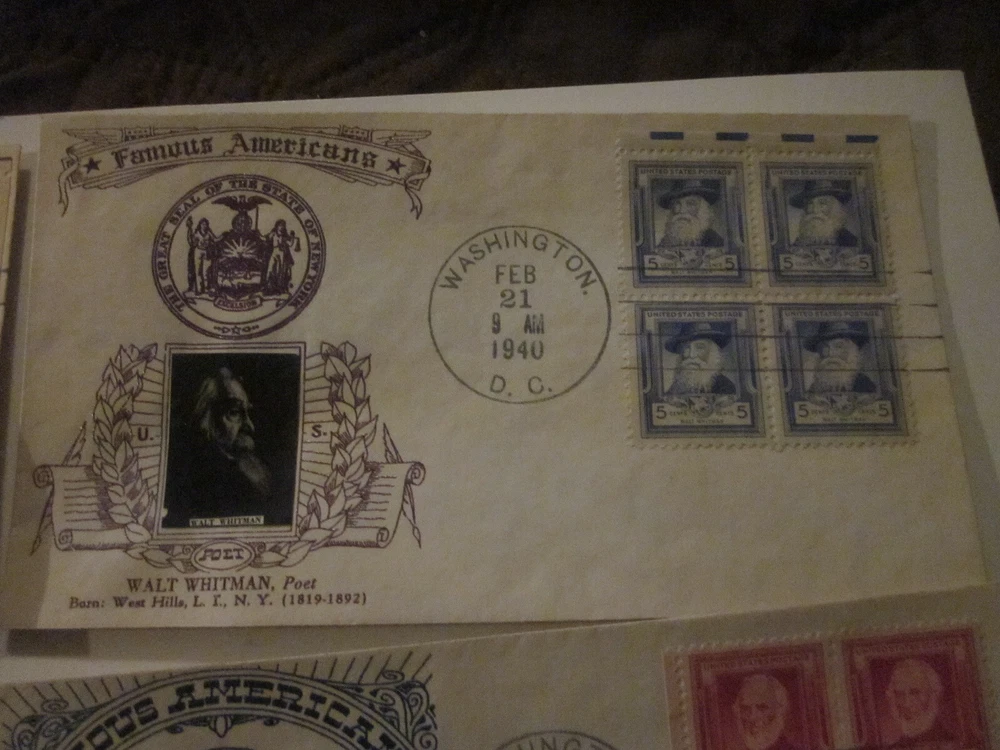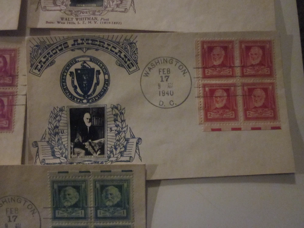 Delve into the rich tapestry of American literary history with this complete set of 5 First Day Cover envelopes, each honoring a renowned poet from the Crosby Photo Cachet series. Issued between 1931-1940, these cachets celebrate the art of poetry and the historical figures who crafted words into masterpieces. The envelopes, originating from the United States, bear the special cancellation mark of their first day of issue, capturing a moment in postal history. These ungraded and uncertified collectibles offer a glimpse into the past, highlighting the philatelic connection to notable poets. The set stands as a testament to the enduring legacy of historical figures and their commemorations. For enthusiasts of stamps, poetry, or historical memorabilia, these FDCs are a noteworthy addition to any collection.