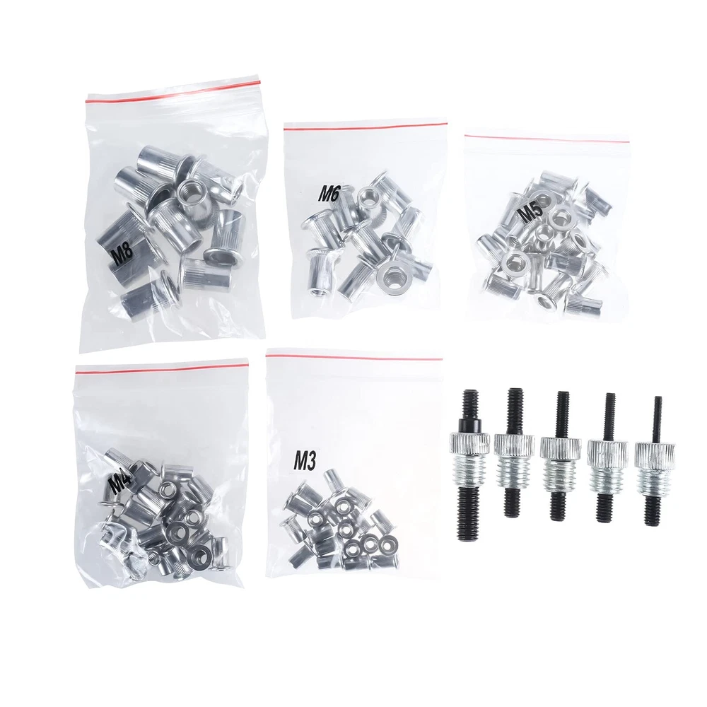 86pcs Hand Rivet Tool Nut Setter Kit, Thread Blind Riveting Tools, Wrench Nut Sert, Riveter Threaded Insert Tool with Metric Rivet Nuts Assortment M3 M4 M5 M6 M8 Product Details Manufacturer: Ruichen Brand: BTSHUB Item Weight: 2.5 pounds Product Dimensions: 7.87 x 5.91 x 3.15 inches Country of Origin: China Item model number: BT0324 Manufacturer Part Number: BT0324 Date First Available: August 11, 2021 4-Size Size of nut rivet mandrels: M3/M4/M5/M6/M8. 80pcs aluminum Ribbed Rivnuts, M3(20pcs), M4(20pcs), M5(20pcs), M6(10pcs), M8(10pcs). Includes wrench to hold handles and adjust mandrels.The tool can only be used for aluminum alloy nuts, not suitable for Steel nuts Sturdy Material: Casting in high-strength steel, this hand pulls blind nut riveter is strong, rustproof, and reliable. A robust, ergonomic high-quality PVC-covered non-slip handle, has a good heat treatment for superior strength. Rivet nuts are made from aluminum alloy which provides strength, corrosion protection, and long service life With open-end, small flange, round hole, threaded inner wall, and partial anti-skid surface, these flat head rivet nut has a good performance of fastener function Wide Usage: used for installing aluminum threaded riveting nuts at the home, shop, and farm, suitable for repair work on cars, boats, furniture, and machines Package includes: 1 x Nut Rivet Tool(Including Wrench); 20 x M3 Threaded Rivet Nut Inserts; 20 x M4 Threaded Rivet Nut Inserts; 20 x M5 Threaded Rivet Nut Inserts; 10 x Threaded Rivet Nut Inserts; 10 x Threaded Rivet Nut Inserts; 5 x Nut Rivet Mandrels: M3/M4/M5/M6/M8; 1 x Instruction Manual; 1 x Tool Box