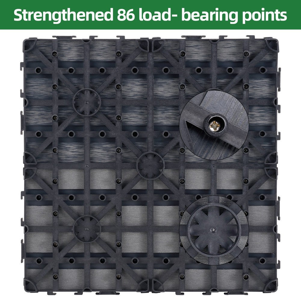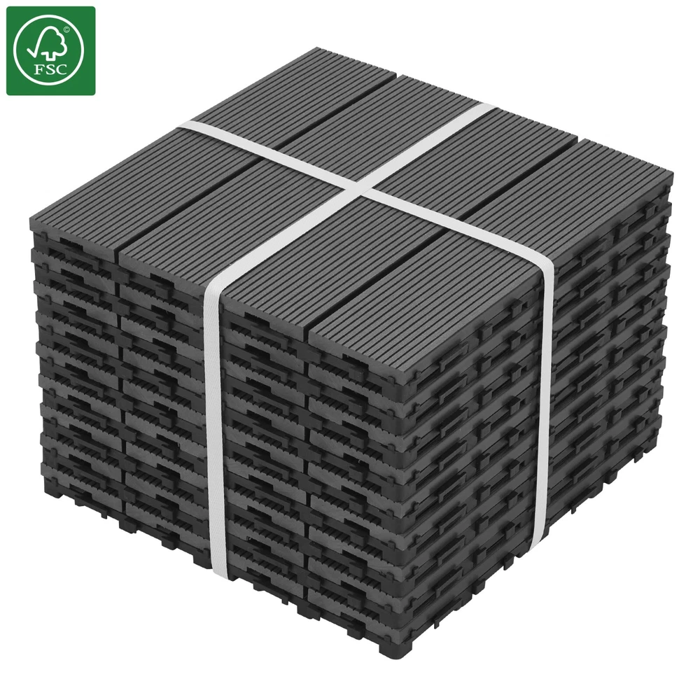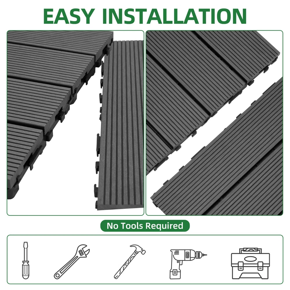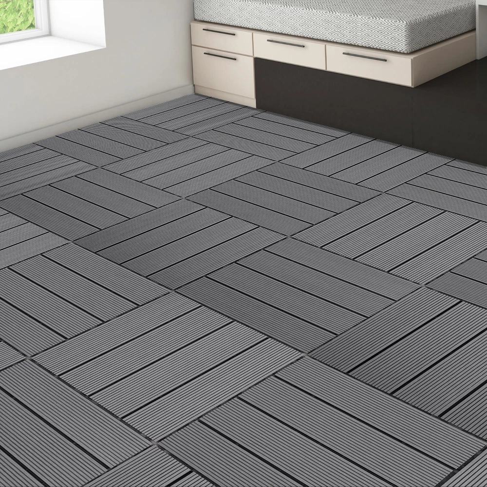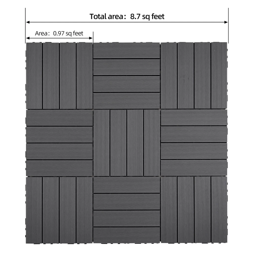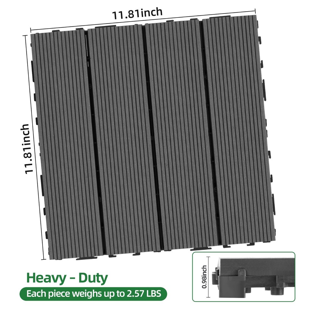 Specification Product Information Item Code: W2659P234053 Product Type: Single Box Product Product Name: 8.7 sq. ft DIY Wood-Plastic Composite Deck Tiles, Gray, Interlocking Outdoor Flooring Tiles Waterproof All Weather for Patio Balcony Backyard Patio Pavers (pack of 9) Place of Origin: China Main Color: Gray Main Material: Wood+Plastic Use Case: Garden & Outdoor Product Dimensions Assembled Length (in.): 11.80 Assembled Width (in.): 11.80 Assembled Height (in.): 8.50 Product Weight (lbs.): 23.20 Package Size Outer Package Images Length (in.): 13.50 Width (in.): 13.00 Height (in.): 8.50 Weight (lbs.): 24.60 Product Features Easy Installation: Our wood-plastic composite deck tiles have an interlocking base for easy do-it-yourself installation, and no tools are required - No glue, No nails. Design: Our WPC deck tiles have a simple, beautiful design that can be used indoors and outdoors; 4 slats per tile, each tile’s dimensions are 11.8" x 11.8". There is a small gap between each slat for better drainage. Durability: Premium wood-plastic composite material makes for superior water, slip, and UV resistance compared to natural wood; suitable for all weather conditions. Eco-friendly nature: Our WPC deck tiles are made from recyclable material, accredited by FSC and GRS, that reflects the idea that humans and nature live harmoniously; creates green and healthy leisure environment. Indoor & Outdoor Use: The interlocking deck tiles have a PE platform base allows for adequate drainage and moisture. Great for decks, patios, balconies, swimming pools, saunas, showers, sunrooms, mudrooms, bedrooms, and more.