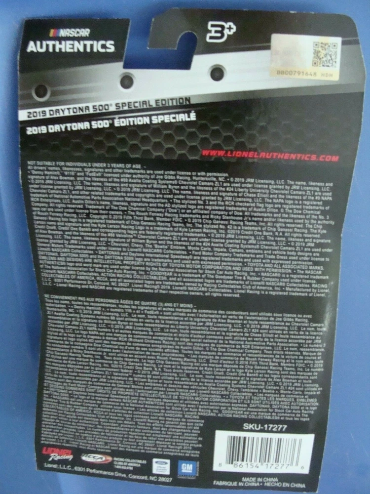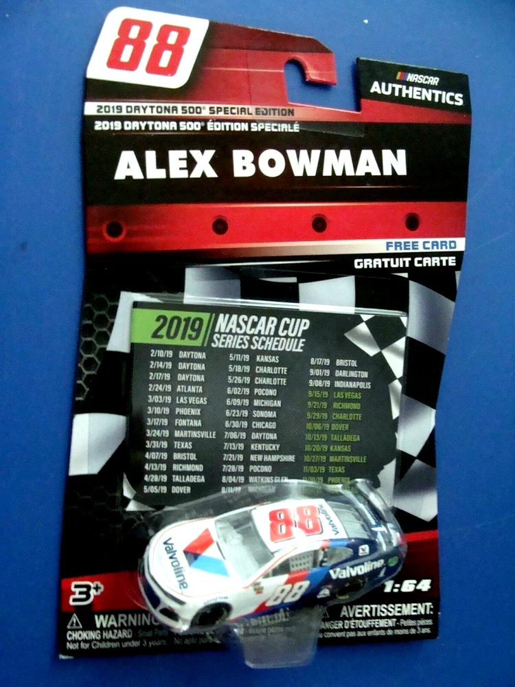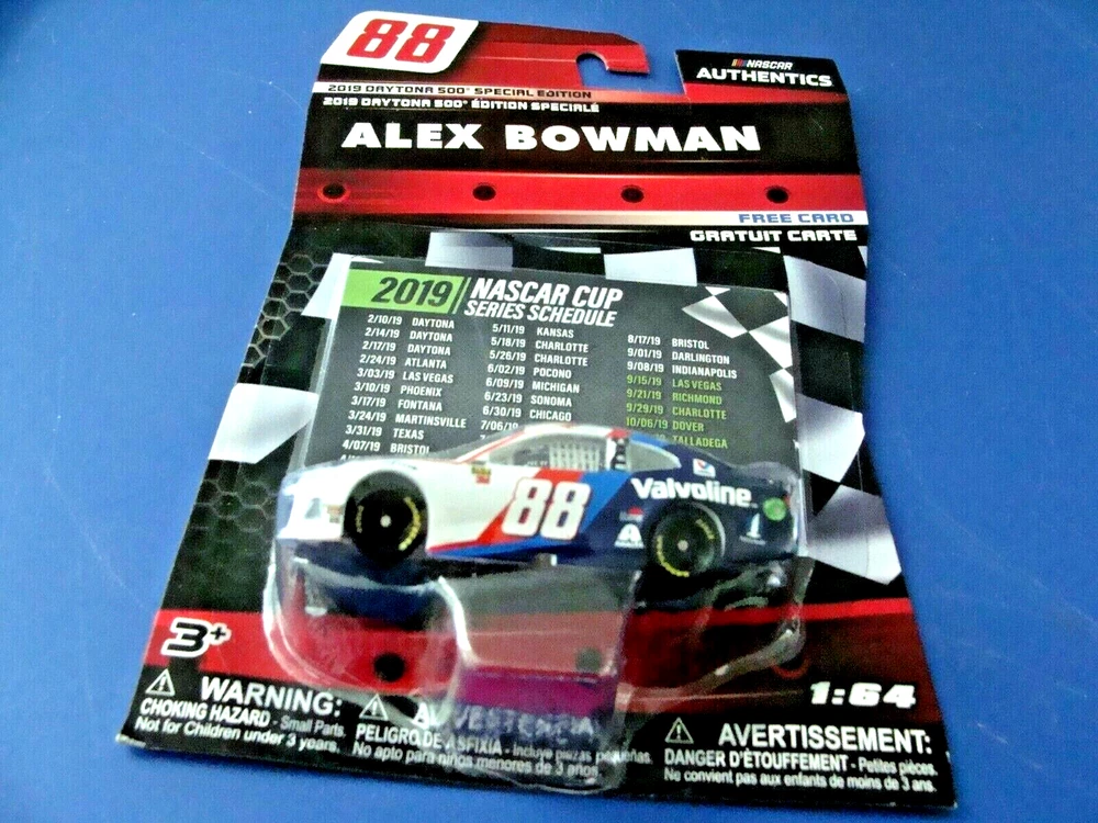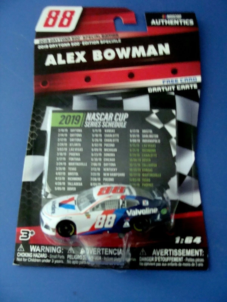 2019 Daytona 500 Special Edition 1:64 diecast car from NASCAR AUTHENTICS. Car is in new condition on its original never opened blister card. Pkg in very good condition. PLEASE VIEW ALL PHOTOS !!! You also receive a 2019 Nascar Cup Series Schedule card in same package as the #88 Valvoline Chevy Camaro for driver Alex Bowman. Red #88 on white roof. Valvoline lettered in black on rear roof edge. Alex Bowman name above door windows. White hood has the trad V logo with the Valvoline name beneath, White nose. Black grill and valance. White continues through the front qtr. Red and blue vertical striping on door panel to black on rear qtr. White #88 on door panel. VALVOLINE lettered in white on uppr rear qtr and black rear panel. Nationwide Insurance lettered on blue trunk deck. Several sponsor logos on car. Clear windshield. Gray net & interior. Goodyears on black rims. Winner to pay $6.55 S/H USPS. EBMP accepted. Canada S/H will be $17.90 USPS First Class Int'l. Thanks for looking and great luck with your bid...........#88 ALEX BOWMAN..........VALVOLINE CAMARO