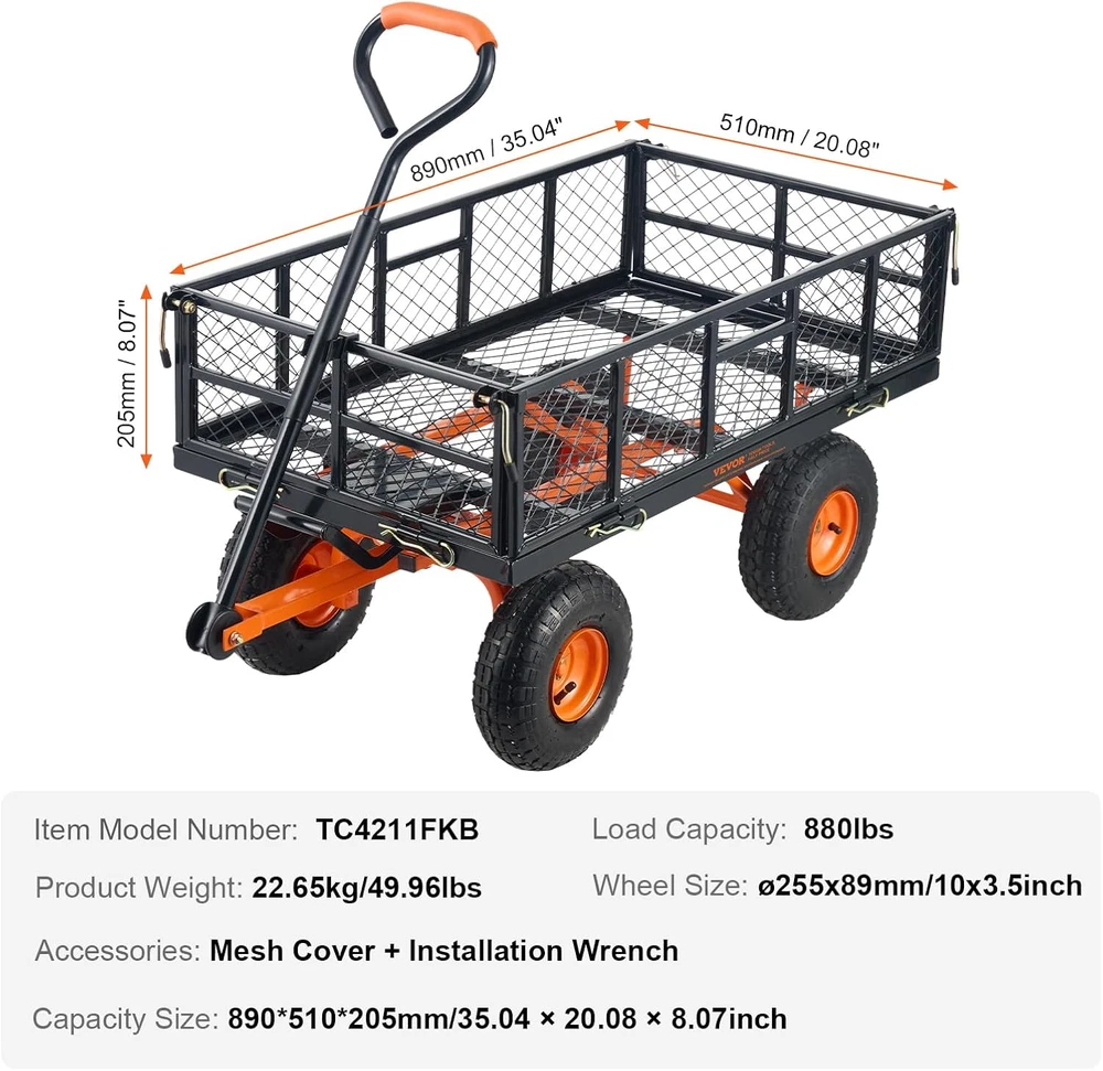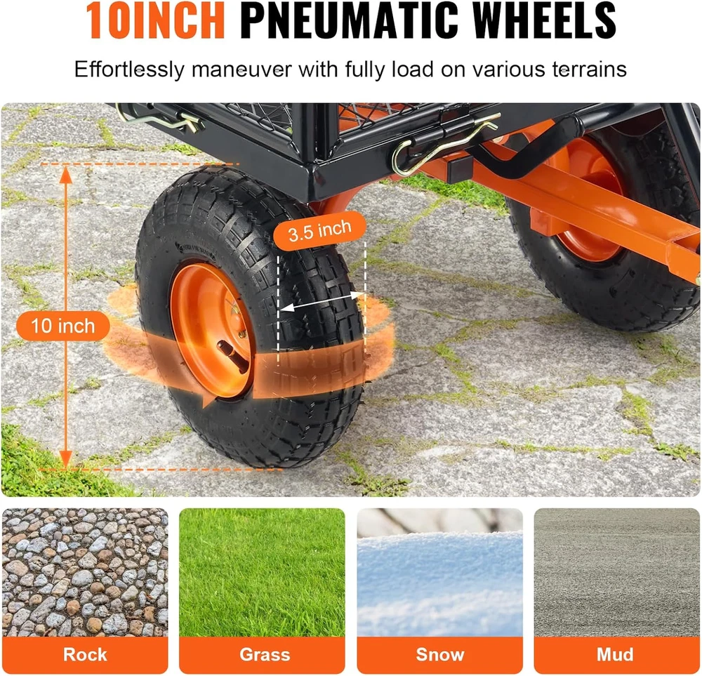 DURABLE STEEL DUMP WAGON: Our dump cart can bear up to 880 lbs, effortlessly handling heavy loads. With a capacity of 3.2 cu.ft, it boosts your productivity. Its sturdy metal frame and surface coating ensure long-term durability. EASY DUMPING: Equipped with a front-handle dumping frame, users can quickly unload items. Simply disassemble the bottom of the frame to the garden dump cart. The 180° adjustable handle facilitates effortless maneuvering, doubling your efficiency. CONVERT TO FLATBED: Our dump wagon features removable all 4 side panels, allowing it to convert into a flatbed for transporting large items. When the panels are reattached, it can carry smaller items like wood or soil, meeting your needs for a multifunctional hauling tool. Large Tire Size: With ø255mm/10" rubber tires, the yard cart provides excellent shock absorption, navigating uneven garden terrain or grassy slopes, ensuring smooth transport. Safe Transport: Included mesh cover and cushion ensure item safety, our yard dump cart is suitable for various settings from gardens, orchards, and farms to warehouses, efficiently completing transport tasks. Product Description Transport heavy loads effortlessly with our dump cart! This garden cart features 1" thick metal frame for stability and reliability. It offers a powerful 880 lbs load capacity that makes heavy loads feel light. Its spacious 3.2 cu. ft capacity makes each transportation a breeze. The straight pull handle provides a 180° convenient control angle. Whether pulling or unloading, everything is under control. The thoughtful design allows for partial side removal, adapting to various situations with ease. Equipped with large 10" rubber wheels, this garden dump cart provides excellent durability and shock absorption, ensuring smooth movement even on rough terrain. The 360° swivel wheels make turning effortless, making transportation a breeze. From tiny grains of sand to large clods of dirt, the included mesh cover and pad ensure stable placement of all items to prevent them from falling during transport. The provided handle means no extra tools are needed, allowing for quick assembly. From beautifying gardens to maintaining orchards, harvesting crops on farms, or managing warehouse logistics, this dump wagon meets all your transportation needs. It's your ideal companion for any task!