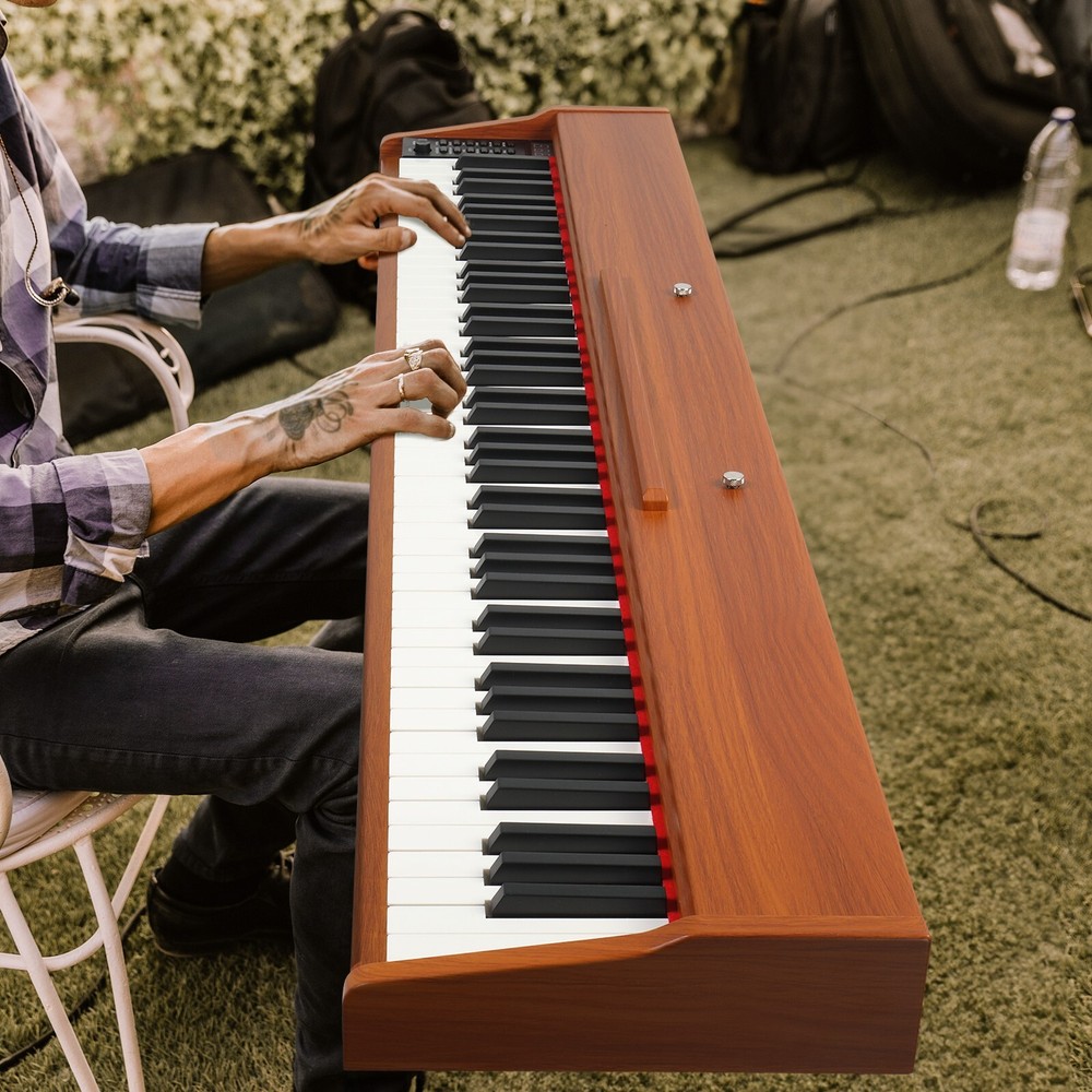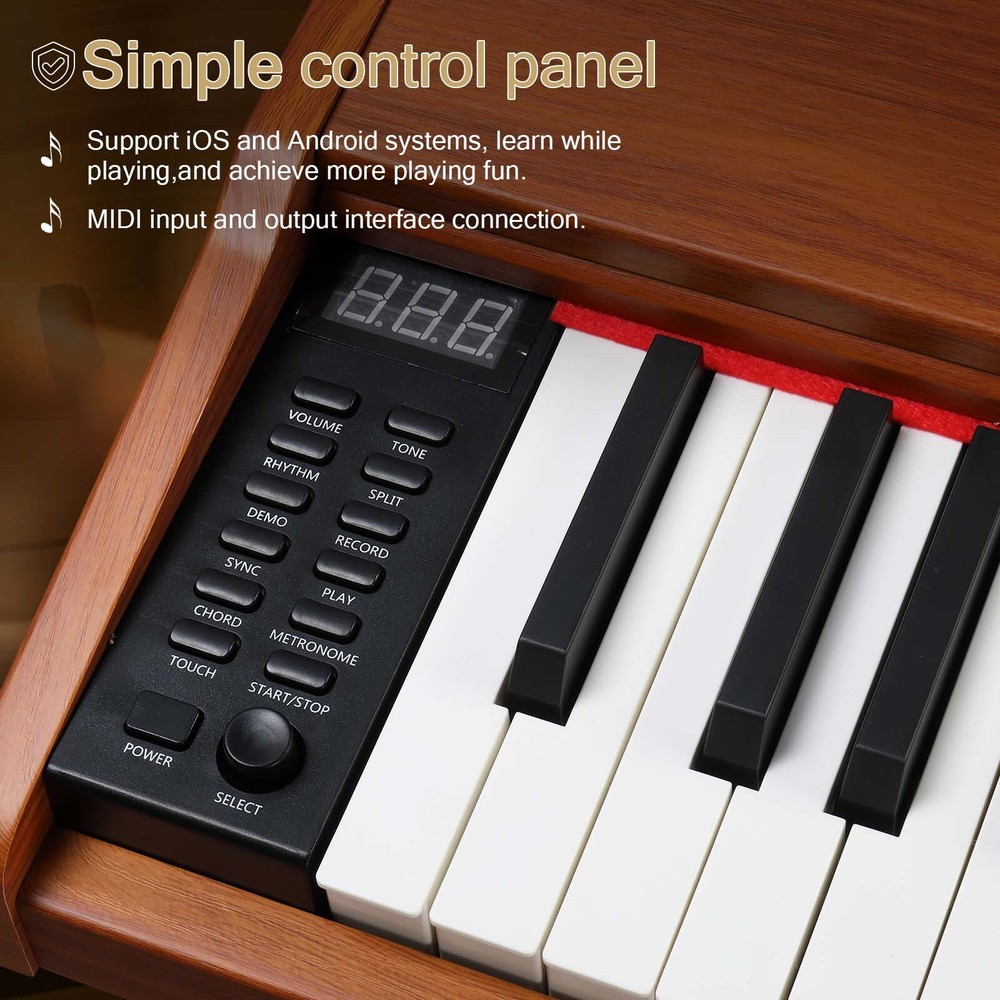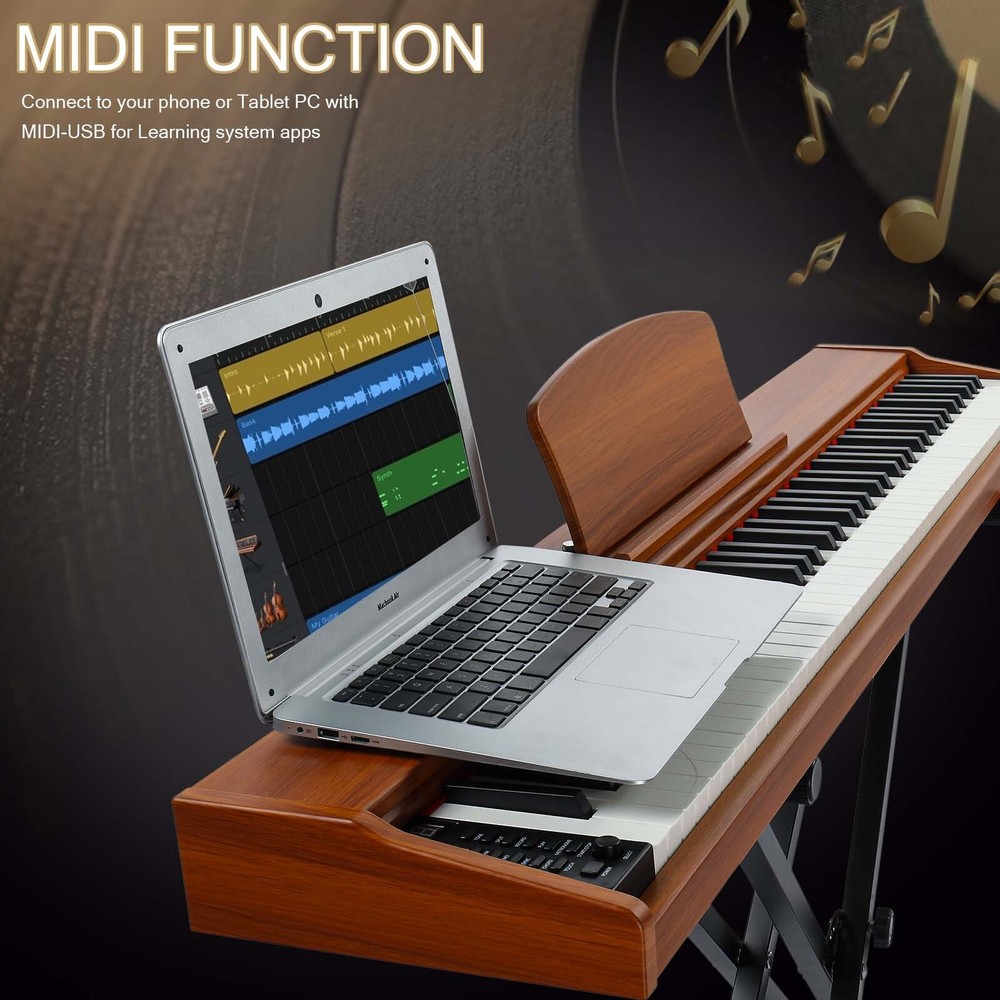 Our service! 5-7 Fast delivery days. Free shipping with Local warehouse. 30 Days Free Returns and Exchanges. 7*24 customer service. Brand new with good conditions. Introductions: 88 Key Digital Piano Full Size Semi-Weighted Keyboards Design adopts superior quality custom Dream Sound source, which can bring you the most striking sound effects. Our 88 key piano with two Dual Bluetooth,MP3 Bluetooth and MIDI Bluetooth,Connect a COMPUTER or tablet with a USB cable for multimedia interaction. After the piano is turned on, bluetooth will be automatically turned on. The mobile phone can search the MIDI Bluetooth signal of this piano. After the connection, the playing software on the mobile phone can realize the wireless connection with the piano. it can also be used as a gift for relatives and friends, or as a prop for theatrical performances. Features: Superior Quality Custom Dream Sound Source 64 Polyphony/ 80 Demo Songs/ 128 Rhythm/ 128 Timbre Built-in two 15 W Stereo Speakers 3 Pedal System:Soft pedal-Soften the tone;Sustain pedal-Continuously increasing lengths of sustained notes,from slight to full;Sostenuto pedal-Press the pedal halfway down to get a partial damper effect Dual Bluetooth,MP3 Bluetooth and MIDI Bluetooth,Connect a COMPUTER or tablet with a USB cable for multimedia interaction. After the piano is turned on, bluetooth will be automatically turned on. The mobile phone can search the MIDI Bluetooth signal of this piano. After the connection, the playing software on the mobile phone can realize the wireless connection with the piano. Supports Cubase,FI Studio,Logic,Live ect. arrangement software Specifications: Piano Color: Walnut Color Music Stand:15.7 in x 5.7in x 0.39in Piano Dimensions:50.3inx10.78inx3.14in (without metal stand) Keyboard key Dimensions: White key width is 0.866in Package Dimensions:56.69 in x 16.53 in x 7.28 in Package Weight: 34.43 lbs/ 15.65kg Model:GPP-107 Keyboard: Number of keys: 88 Key (A1-C9) Action: Full Size Semi-Weighted Action Key Type: Piano-style Metronome:Yes Touch control: Yes Sounds: Sound Source:Superior Quality Custom Dream Sound Source Polyphony (max): 64-note Demo Songs:80 Rhythm:128 Timbre:128 Connectivity: MIDI Connectivity: MIDI over USB Bluetooth:MP3 Bluetooth and MIDI Bluetooth USB MIDI Connectivity: Yes Recording:Yes Headphone Jacks: 1 (1/8" Jack) Storage type: FLASH 128M Expandability Available: No AUX Input: Yes Line Output: Yes Line Input: Yes 3 Pedal System: Soft/Sustain/Sostenuto Pedal Onboard Features: Recording/Playback MIDI Sequencer Accompaniment Styles: Comprehensive Chord Accompaniment Preset Songs: 80 Display: LED Built-in speakers: Yes (2* 15W) Dual-tube X-Shape Keyboard Stand: Diameter: 0.78in(20mm) Wall thickness: 0.019in(0.5mm) Variable Height Positions: 38.4", 36.0", 32.7", 28.5", 23.6" and 18.1" Variable Side-to-side Dimensions: 12.20", 17.9", 23.6", 28.3", 32.7" and 35.8" Folding Dimensions: (17.3 x 39.4 x 2.4)" / (43.94 x 100.08 x 6.10)cm (L x W x H) Package Includes: 1 x Digital Piano 1 x Power Adapter 1 x Triple Pedals 1 x Headphone 1 x Headphone Adapters 1 x USB Cable 1 x Android Cable 1 x Piano Cloth 1 x Piano Cover 1 x Keyboard Sticker 1 x Music Clip 1 x Screwdriver , Screw Accessories And Manual Product Details: