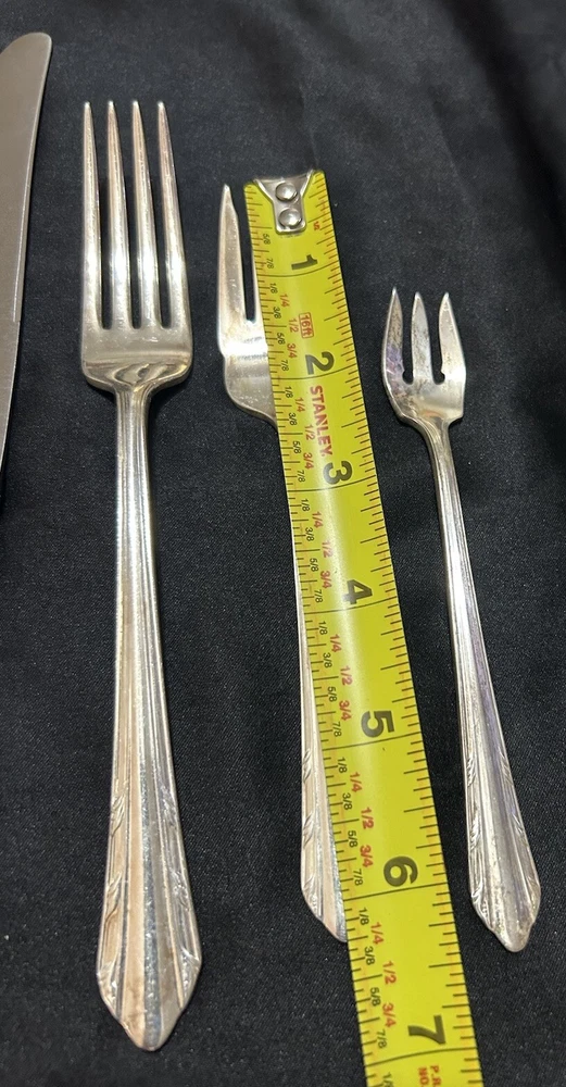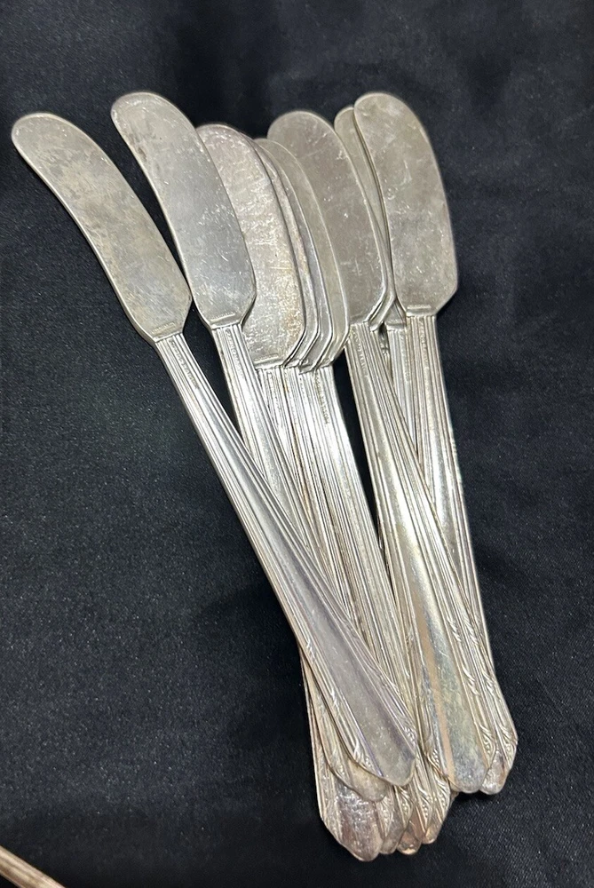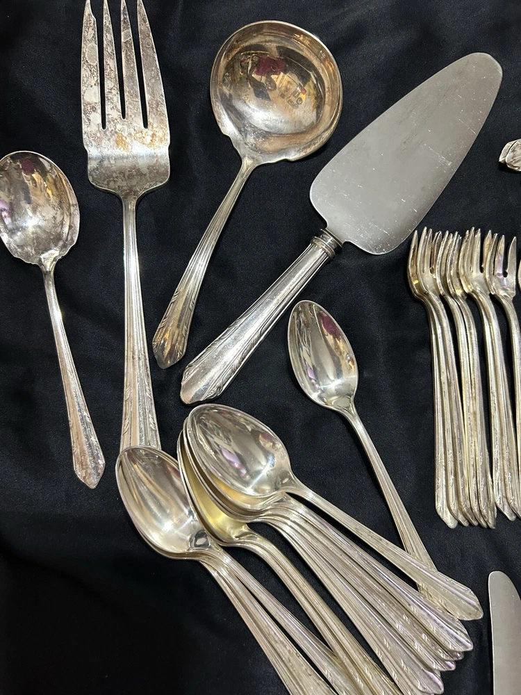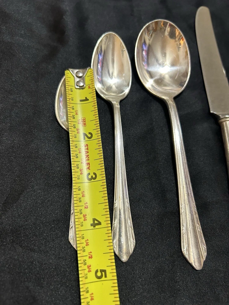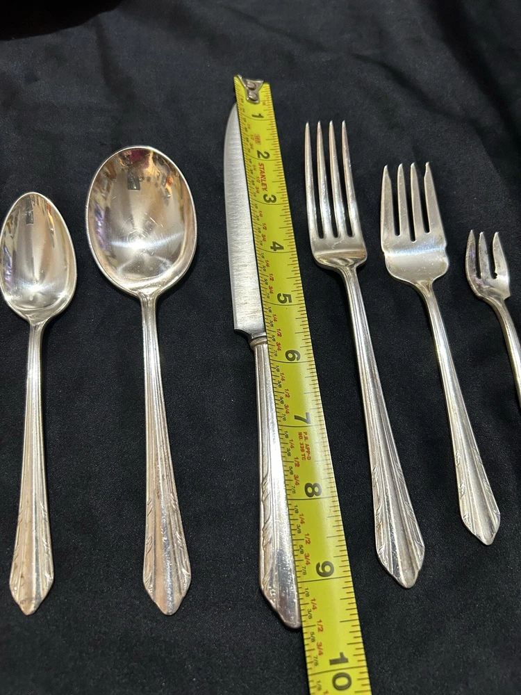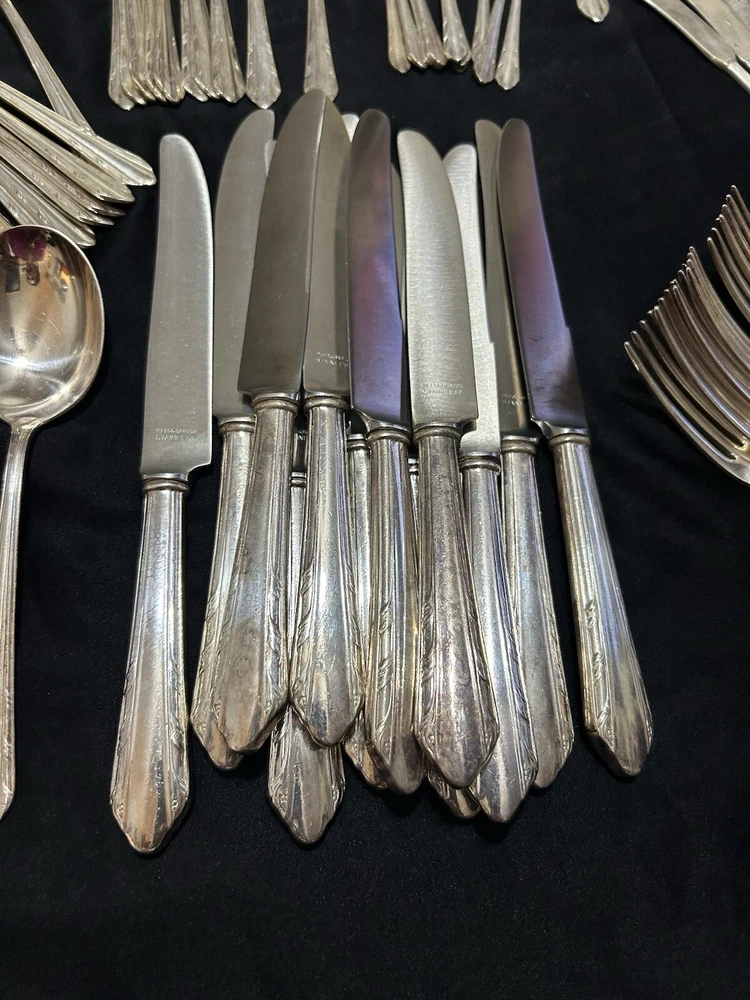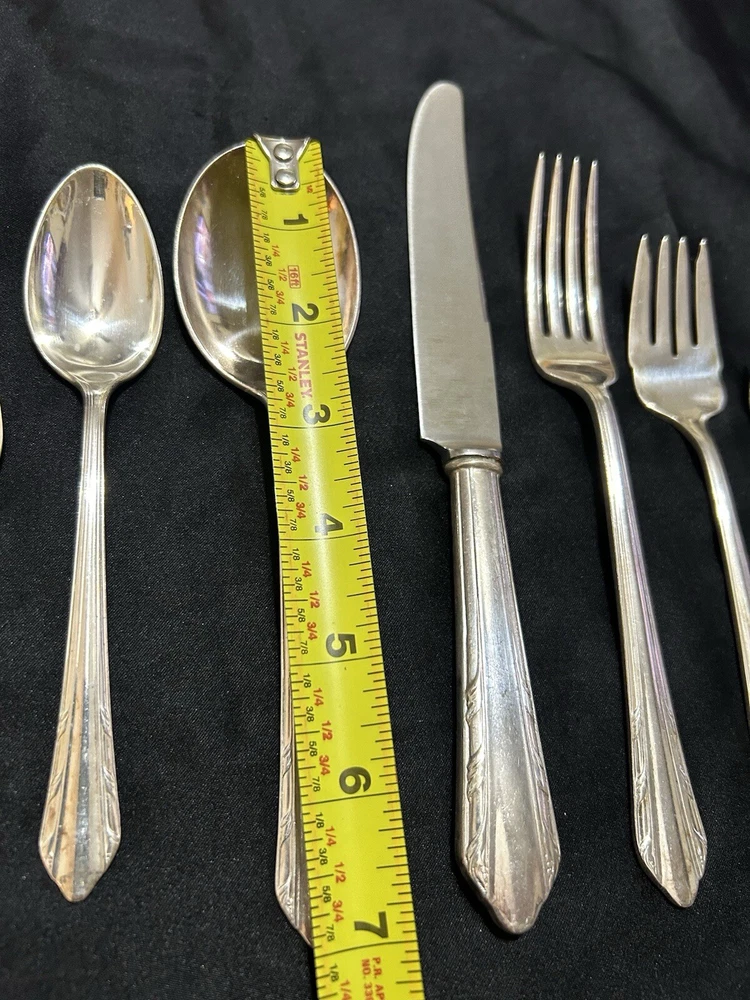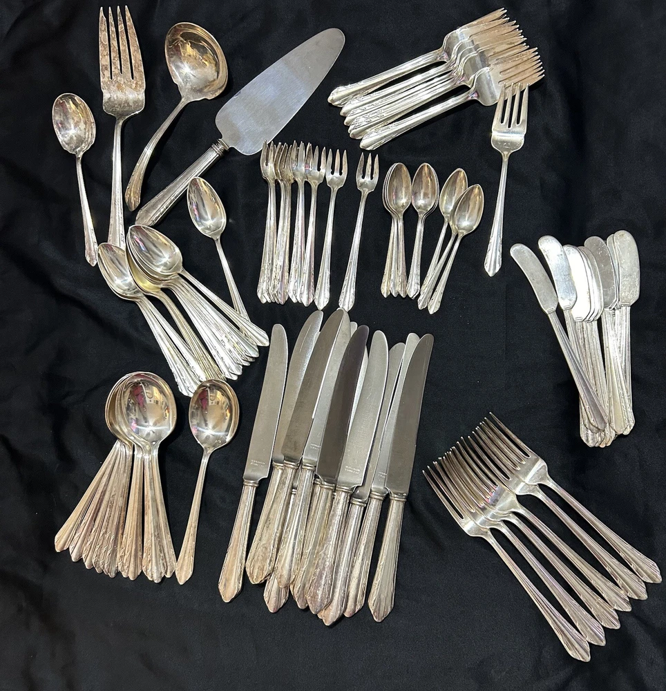 88Pc Reed & Barton Madamoiselle Mademoiselle 1932 Art Deco Dinner Dessert Set 6 Dinner Forks 12 Dinner Knives 12 Dinner Gumbo Spoons 11 Salad Forks 12 Dessert Spoons Teaspoons 10 Demitasse Spoons 10 Seafood Cocktail Forks 11 individual Butter Knives 1 Serving Fork 1 Ladle spoon 1 Pie slice server 1 Sugar spoon Good vintage condition. Normal signs of wear and aging. Minor scratches, patina and discolorations. Please study pictures carefully before purchasing Feel free to ask us any questions. Thank you for visiting our store! Bag138
