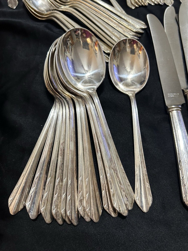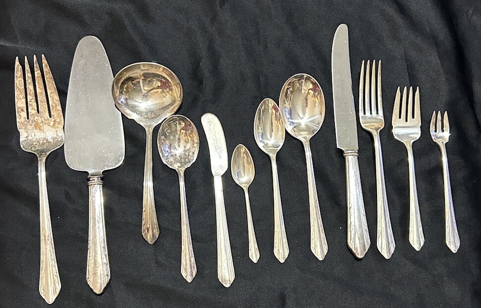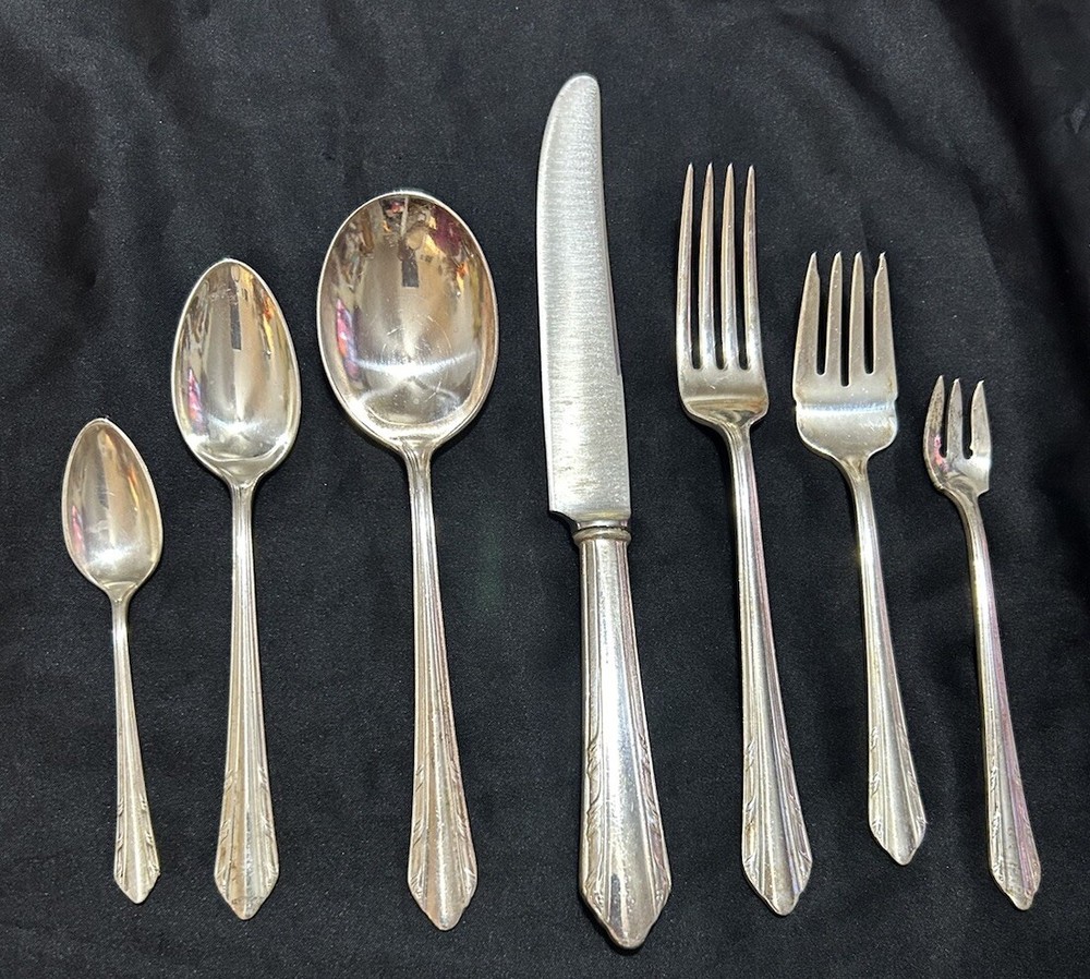 88Pc Reed & Barton Madamoiselle Mademoiselle 1932 Art Deco Dinner Dessert Set 6 Dinner Forks 12 Dinner Knives 12 Dinner Gumbo Spoons 11 Salad Forks 12 Dessert Spoons Teaspoons 10 Demitasse Spoons 10 Seafood Cocktail Forks 11 individual Butter Knives 1 Serving Fork 1 Ladle spoon 1 Pie slice server 1 Sugar spoon Good vintage condition. Normal signs of wear and aging. Minor scratches, patina and discolorations. Please study pictures carefully before purchasing Feel free to ask us any questions. Thank you for visiting our store! Bag138