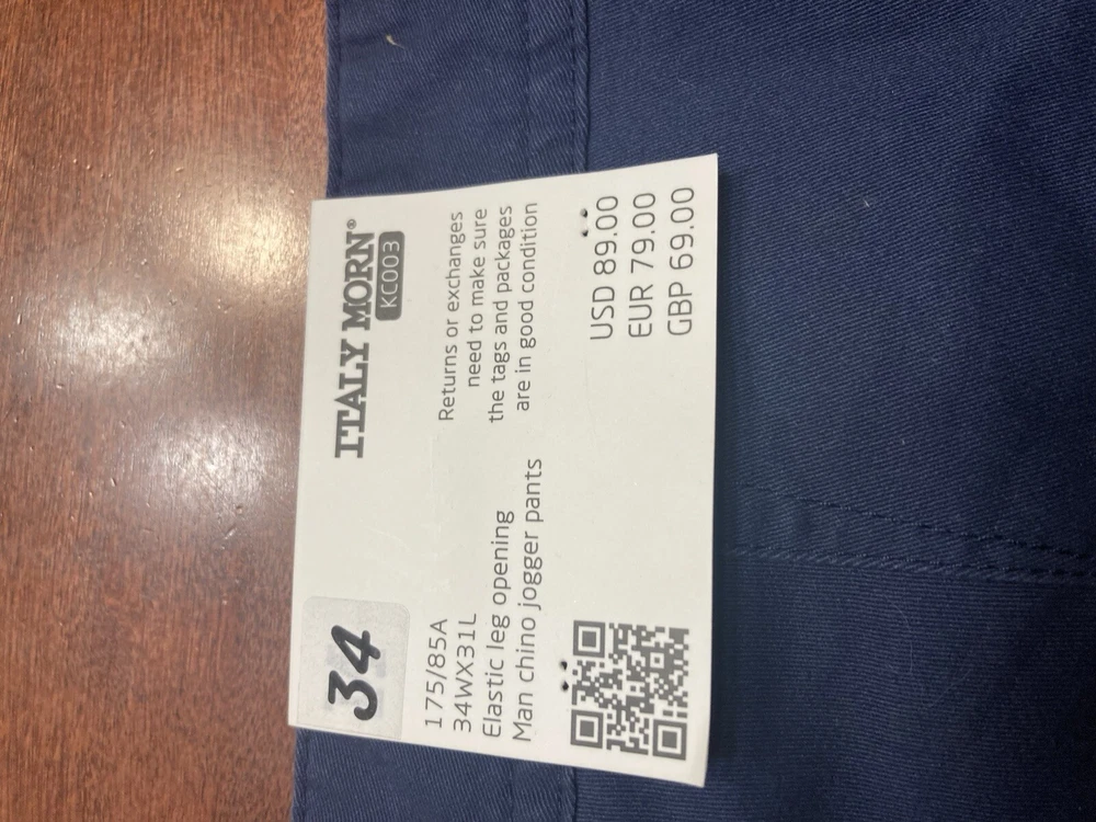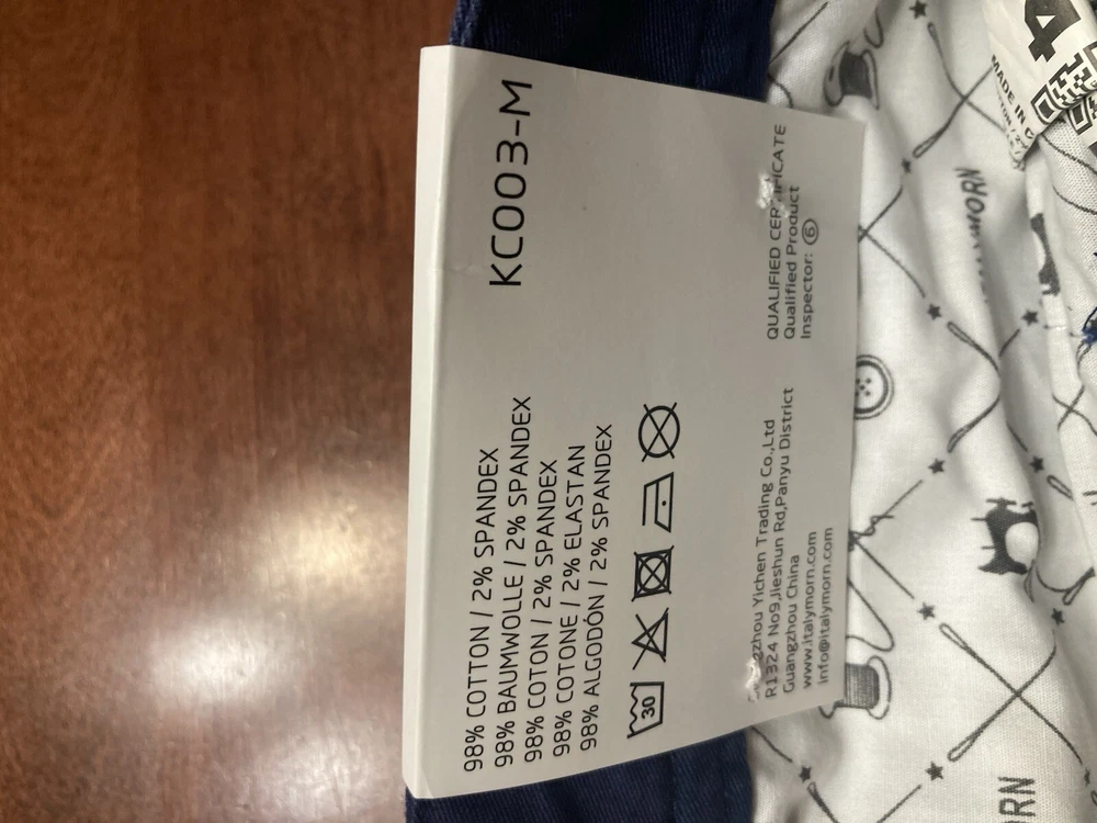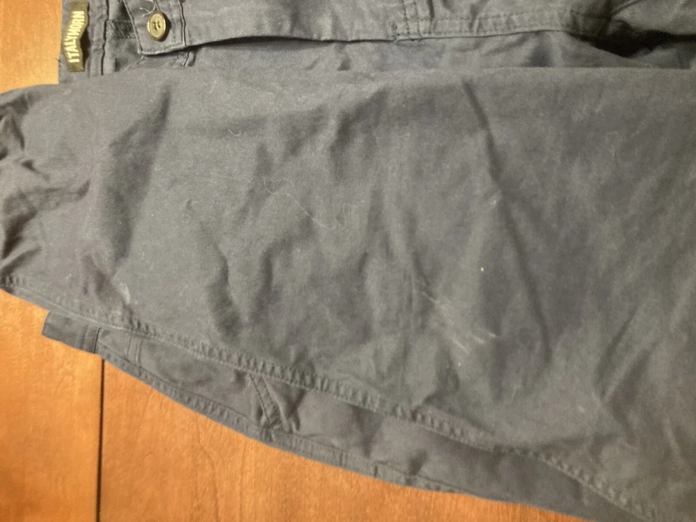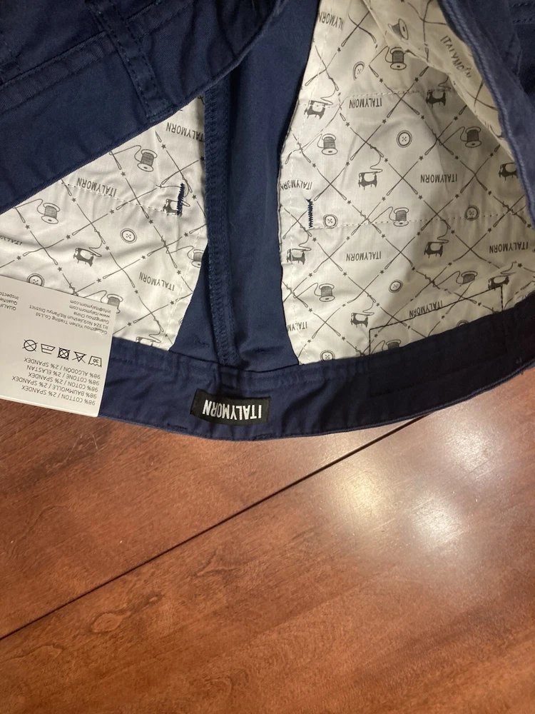 Elevate your wardrobe with these stylish Italy Morn chino pants. The navy blue color and solid pattern make them a versatile choice for any occasion, whether it's casual, workwear, or business. The pants feature a flat front and a relaxed fit, with a straight leg style and a 5-pocket design. Crafted from breathable and stretchable cotton fabric, these pants are perfect for all seasons. The waist size is 34 inches and the inseam is 31 inches, with a high rise of greater than 12 inches. The pants also have a zip closure and are machine washable for easy care. Upgrade your look with these modern and comfortable Italy Morn chino pants. Faint white marks around the knees