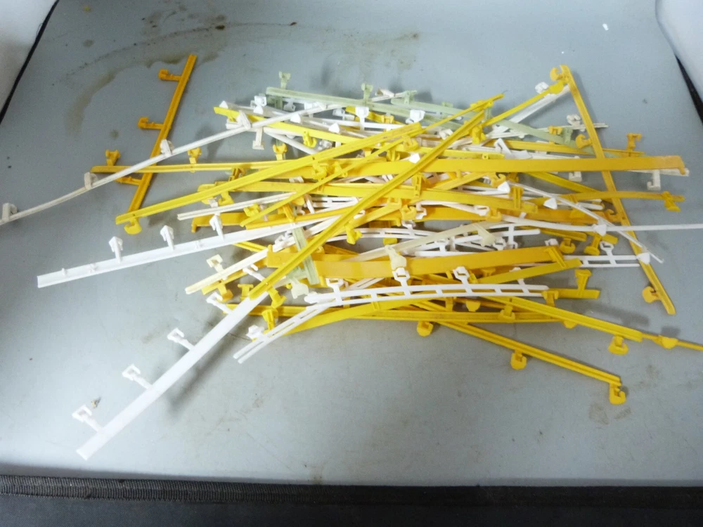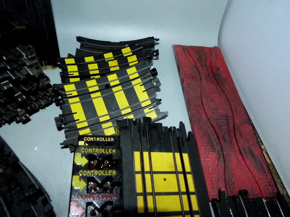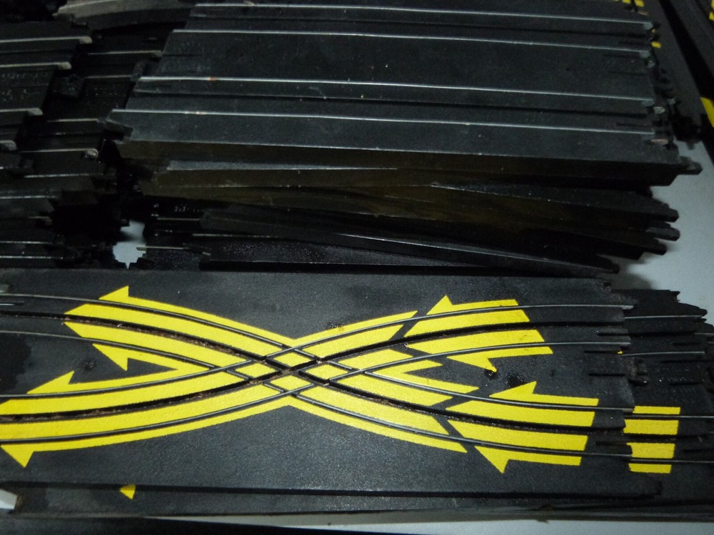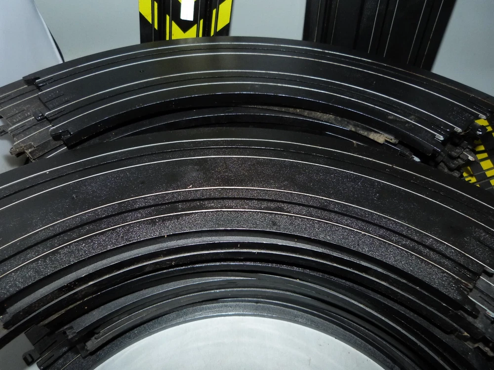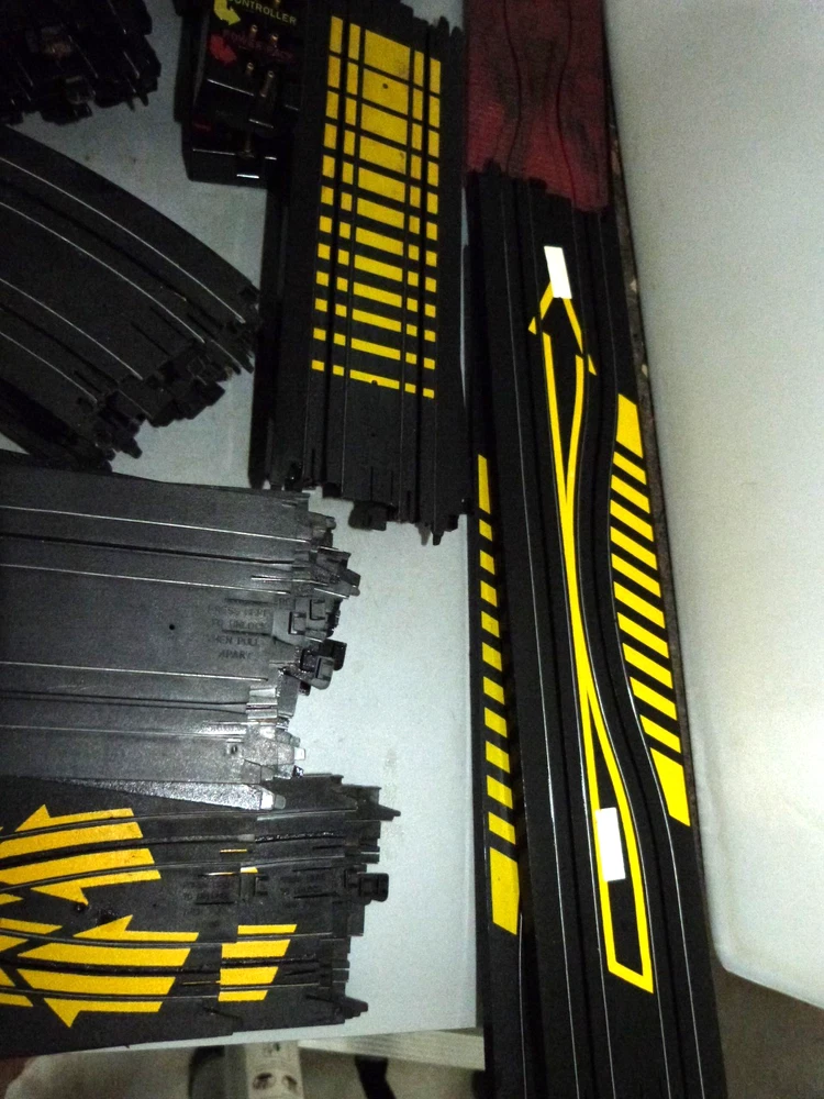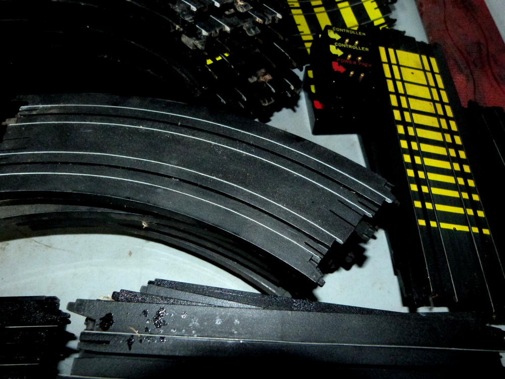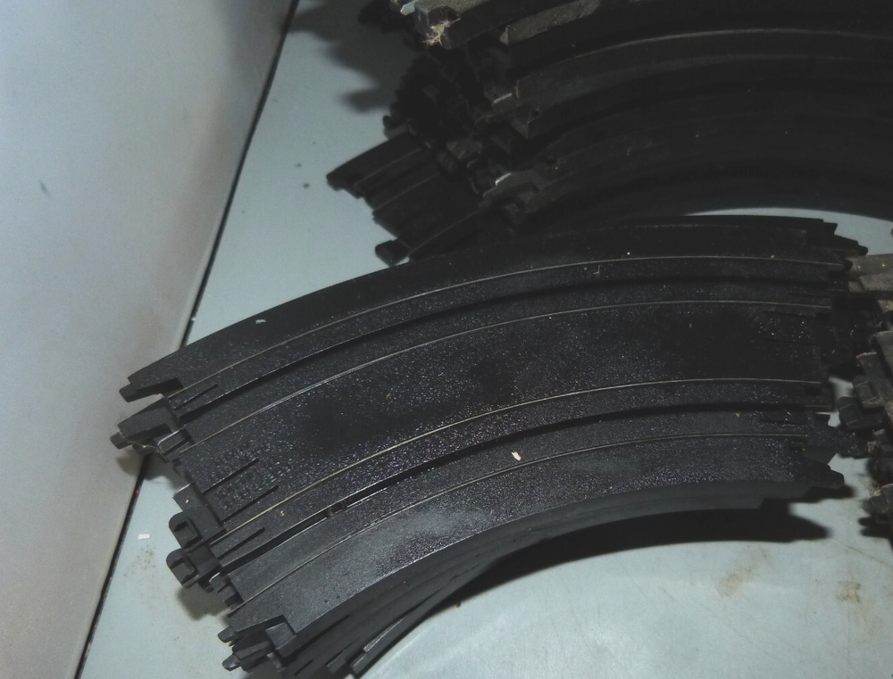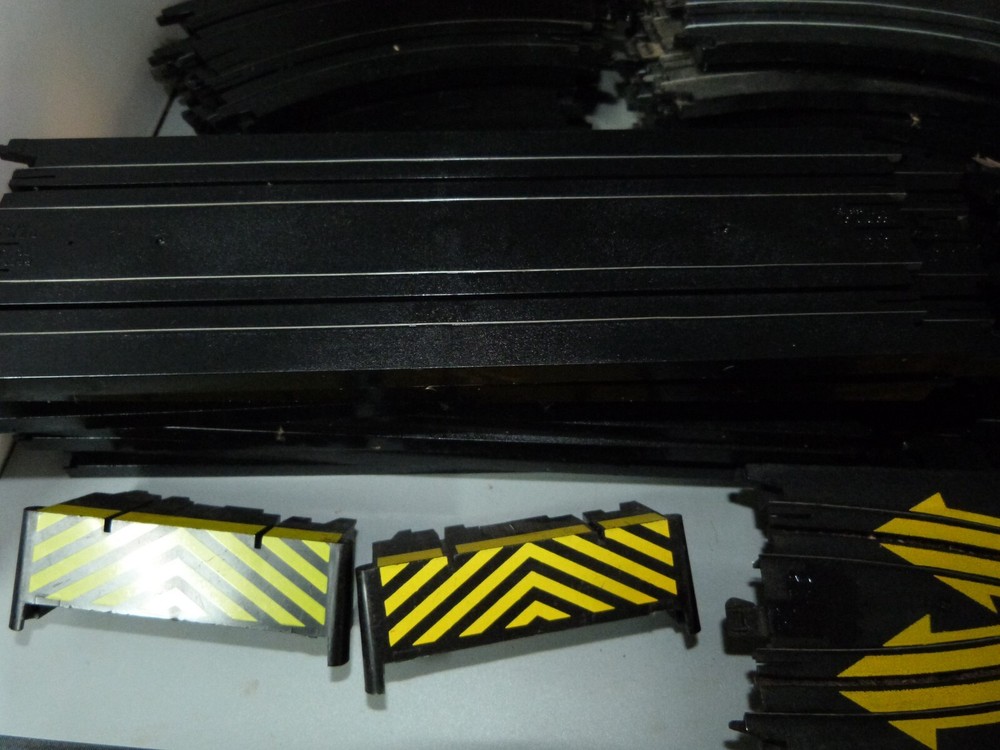 HO Tyco Slot Car Track pcs 89+pcs. All connecting tabs are there. Includes: 2 x 5854 jumps, 4 x 9" str lane changers, 11 x 9" str, 7 x 1/8 crvd, 13 x 6" str, 9 x 1/8 circle, 30 x 1/4 crvd 9", 2 x 15" str, 1 x 15" jump recovery track, 2 x 15" squeeze track, 1 x 9" brick squeeze, 4 x transition track, 3 x 9" terminal str, lots of guard rails.