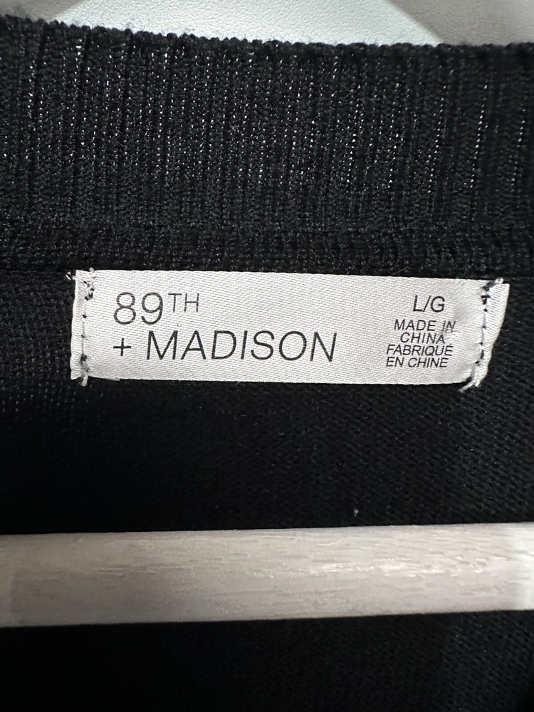 MEASUREMENTS length-23.5” bust-23” Elevate your wardrobe with this stylish and versatile sweater top from 89th & Madison. Featuring a classic crew neck and long balloon sleeves, this sweater is perfect for any occasion, whether it be a casual day out or a business meeting. The tight-knit polyester and rayon material makes it lightweight and easy to care for with machine washable instructions. The black and tan color scheme adds a touch of city and classic vibe to your outfit, while the regular fit ensures comfort and flattery. With its size L and regular size type, this sweater is perfect for any women's department. Whether you're traveling or enjoying the winter, summer, or fall season, this sweater is a must-have addition to your wardrobe.