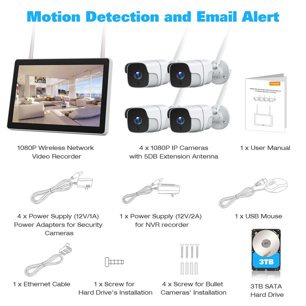 Solar Powered Security Camera Outdoor Wireless System 10CH 10" Monitor Home HDD 313.49 USD 329.99 USD Free shipping 5% off Wireless 10CH 2MP Security Camera System 2Way Audio Human Detection IP66 5G WiFi 188.99 USD Free shipping 8MP 4K 8CH NVR 5MP PT PoE Home Security Camera System AI Humanoid Detection 3TB 246.99 USD 259.99 USD Free shipping 5% off 4MP Wireless Security Camera System Dual Lens WiFi Pro Camera Home Surveillance 242.24 USD 254.99 USD Free shipping 5% off 10CH 4MP Wire-Free Battery Powered Wireless Home Security Camera System 500GB 313.49 USD 329.99 USD Free shipping 5% off TOGUARD 1080P Wireless Security Camera System with 12 inch LCD Monitor, 8CH NVR 4Pcs WiFi Outdoor Home Surveillance Camera with App Remote, Night Vision, Waterproof, Motion Detection, Email Alert W/ 3TB Hard Drive Free & Fast USA Shipping ✔ Best Quality ✔ Easy Installation TOGUARD Wireless Security Camera System Precautions: 1. W/ 3TB Hard Drive 2. Audio Recording is NOT Supported 3. Wireless means the cameras can automatically connect to the NVR monitor wirelessly. Cameras and NVR require power supply all the time. (Not cover Battery) Observing What You Love From Every Angle and Keep Your House Under Control. NVR Kit supports sync-playback, video backup, motion detection, email alert. Night Vision, Waterproof and 1080P image sensor allow you to view more clear and stunning picture and video at night even in rainy day. Smart security for your home. Save videos automatically and you can watch videos on your phone, laptop and computer at any time. Also you can share the interesting things with your other family members and friends. Key Words: 【 All-in-One and Plug & Play 】TOGUARD wireless camera system features a 12" full HD 1080P NVR monitor (Not Touch Screen). The cameras and NVR monitor are auto-paired during the factory setting. Just need to charge the cameras and NVR monitor with Power Supply provided for 24/ 7 surveillance purposes. (Wireless means wireless connection, but also need to plug-in power supply all the time) Perfect for villa, home, office, shop, hotel, warehouse, school, business or elsewhere. 【 Remote Viewing on smart devices 】Connect the NVR Monitor to home router via Ethernet cable provided and download app “EseeCloud ” into your Phone, Pad, or PC. You can remote access simultaneously on smart devices at any time and anywhere. (Note:This TOGUARD wireless camera system does not support audio recording.) 【 Motion Detection and Email Alert 】TOGUARD wireless camera system provide a sensitive choice of Motion Detection for different needs. Smart notifications with email/ snapshot alerts will be pushed to your smart phone via email or IOS/ Android App when motion is detected. Customize your own detection plan and zone for each camera. Alarm Ringing does not support yet. Note: The Email Alert function needs to turn on before it works. 【 IP66 Weatherproof & Outdoor Night Vision 】TOGUARD wifi security camera is rated with IP66, the working temperature ranges from -4°F to 122°F (-20℃ to 50℃) made with dust tight and waterproof and cover with durable housing. It is vandal proof and can work well under harsh weather, even in the storm and snowy weather. Featuring 3.6mm LEDs with IR-CUT function support up to 20m/65ft Night Vision. Best choice for your outdoor home security. 【 More functions and details 】 TOGUARD wireless camera system support up to 8 cameras. It can be also used in no Internet area(connect directly via NVR system, but can not use Remote view). Extending wireless signal range by IP Camera if you use in a long distance.24 hours 30 days reliable video recording for 1TB HDD. For more function,please read user manual. Note : Wireless means that the cameras can connect to the NVR automatically and wirelessly, but also need to be powered all the time. The system can work without internet, just can't view on APP, if you want to view remotely, please need to connect the nvr to internet. Surveillance System Packing List: 1 x 12CH 1080P Wireless Network Video Recorder&Monitor(Wireless NVR Monitor) 4 x 1080P IP Cameras with 5DB Extension Antenna 4 x Power Supply (12V/1A) Power Adapters for Security Cameras 1 x Power Supply (12V/2A) for NVR recorder 4 x Screw for Bullet Cameras' Installation 1 x Screw for Hard Drive's Installation 1 x Ethernet Cable 1 x USB Mouse 1 x User Manual Reference: 3TB Hard Drive ( included) When the hard drive is full, it will be overwritten automatically. True Plug & Play and Auto-Pair The IP cameras have been paired to the NVR monitor. Actual Plug and Play. Just need to connect the NVR monitor and IP cameras with Power Supply. (Cameras are not cover battery) The NVR monitor and IP cameras need to charge all the time to get electricity for 24/7 surveillance purposes. Wireless means that there is no cable between cameras and NVR monitor, but Cameras and NVR require power supply all the time. Local and Remote View Local Viewing: No Network Needed. Just connect the wireless surveillance camera system to the monitor via HDMI and enjoy multiple-cam views on one screen. Remote Viewing: Connect the NVR to Network . Download the “EseeCloud” on your smart phone (Android & IOS system), Or download the “EseeCloud” PC client on PC(advise IE Browser). Create an account and connect the NVR device to view live and record videos. Easy Remote Access TOGUARD Wireless Security Camera System support different devices on remote viewing.(It need to connect to WIFI) Download app “EseeCloud ” into your Phone, Pad, or PC. You can remote access simultaneously on smart devices at any time, anywhere. WiFi Range Extend & Repeater Set up TOGUARD IP Camera can work as signal transmitter to help strengthen the poor signal camera that caused by long range installed or physical obstacles such as walls. Repeater is also supported. Infrared Clear Day Night Vision Featuring 3.6mm LEDs with IR-CUT function, 110° viewing angle, 50ft Night Vision range. The 