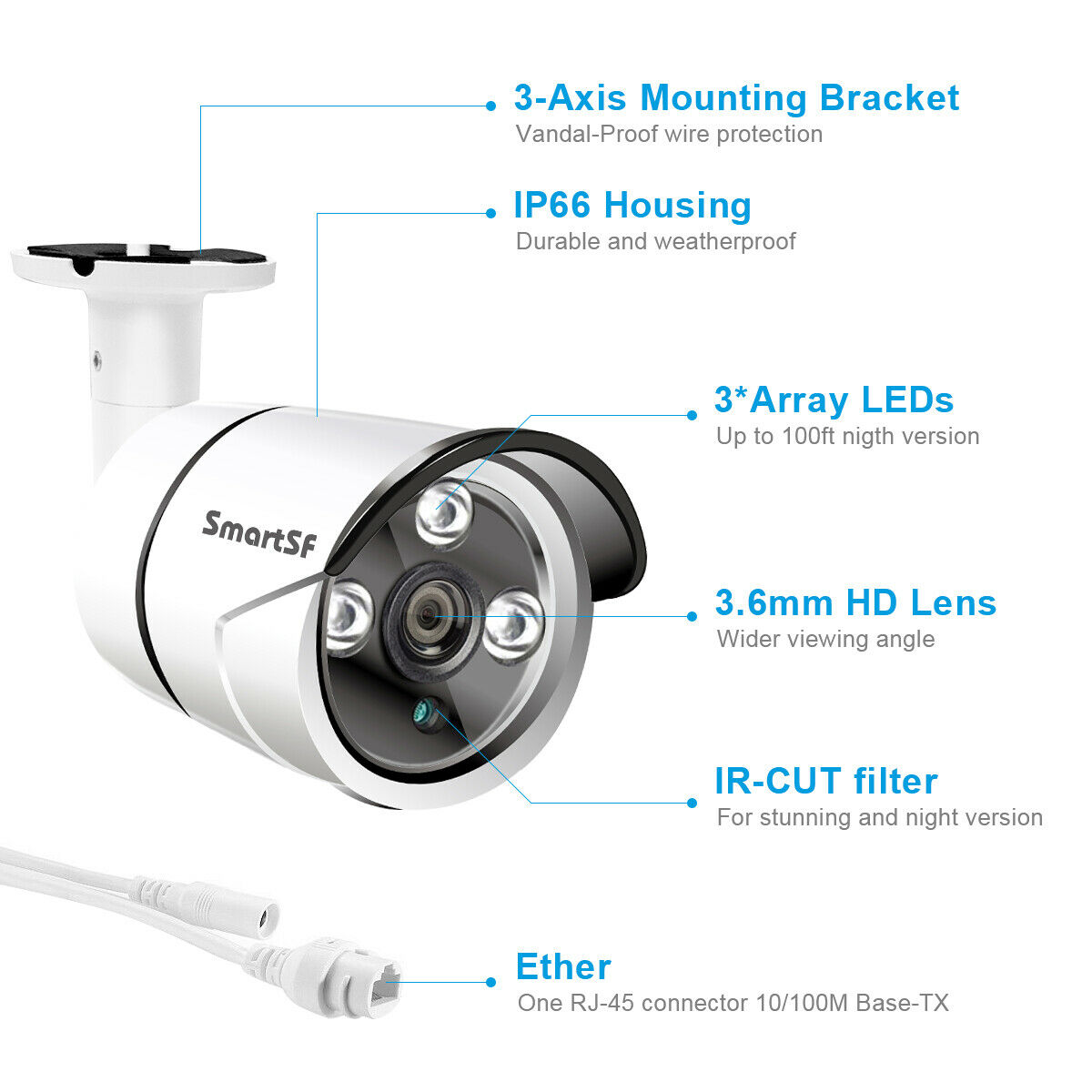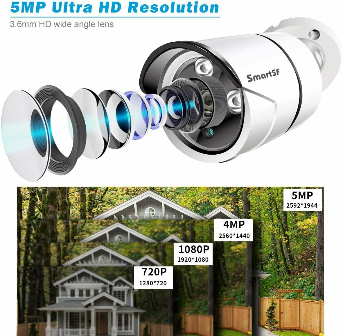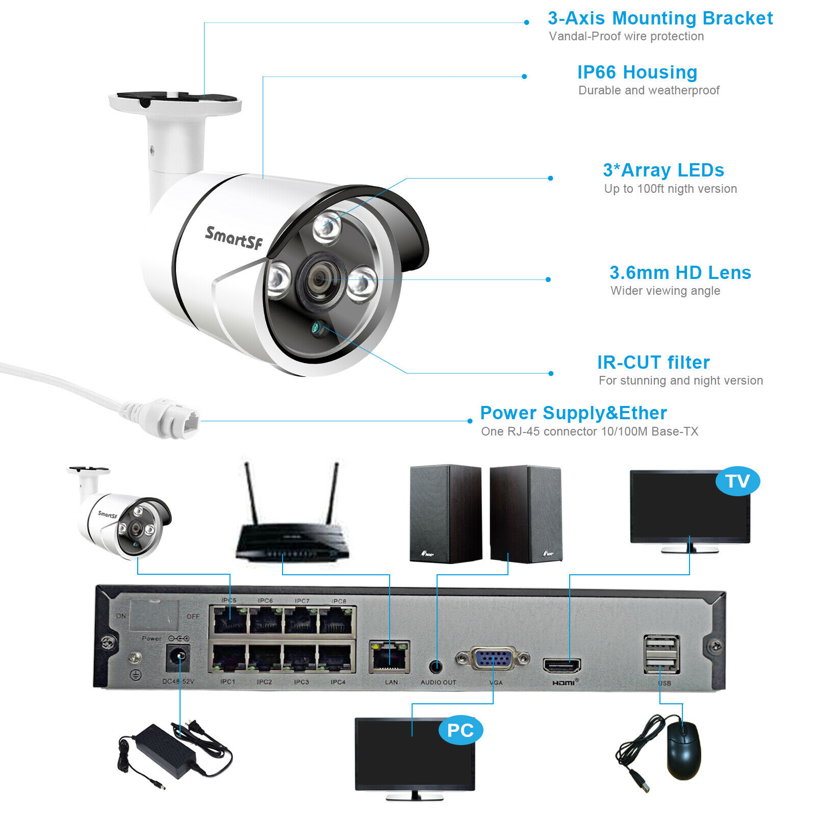 SmartSF 8 Channel 5-Megapixels 2560*1920P Outdoor PoE IP Security Camera System Features: 【Super HD 5-Megapixel High Resolution】 5.0MP IPG5520-F with a pixel resolution of 2560x1920, that is, nearly 2.4X the resolution of 1080p Full HD, and even 1.3X the resolution of 1440p. It sees and records your home security more clearly, with more details. 【Excellent Night Vision, Up to 100ft】 Great cameras aren't just measured by images in daytime. SmartSF 5.0MP security camera kit stands out for its incredibly excellent images at night. Infrared LEDs enable long night vision distance (up to 100ft). Captures crystal clear video evidence of theft and vandalism that occur in low-light conditions. Reliable Solution for Home, Business and Projects. 【Waterproof Works Perfectly Outdoor/Indoor】 The 4 Bullet cameras 5.0MP IPG5520-F have solid aluminum bodies and housing, with an IP66 waterproof rating. So you can feel free to install them outdoors, like in your garage, backyard, or anywhere else. It can stand harsh weather conditions, including rain, snow, intense cold and heat. Rain or shine, hot or cold, these cameras never quit. 【PoE–Easy Setup, Eve n for a Beginner 】 A real plug and play security system! It features PoE (Power over Ethernet), with a single network cable connecting each IP camera to the NVR for both power supply and video signal transmission. Easy wiring – the wiring process can’t be simpler for DIY enthusiasts and beginners. 【Remote Viewing, Anytime, from Anywhere】 No matter where you are, you can remotely access the security camera to see live streaming and stay connected. Remotely view the IP camera via free “IP Pro” App on your mobile device, free “E-see Net” CMS Client on your computer, web browser. Even when you are in your office or travelling, you can check what's happening to your home/business on the go. PoE Network Video Recorder Specifications: IP Video Input: supports 4 IP cameras Video Output: Monitor or HDTV via VGA, HDMI Compression Format: H265+, H.265 and H.264 Playback: 4 cameras play simultaneously HDD: Not included HDD Capacity: 1x internal SATA port, up to 6TB Power over Ethernet Sockets: RJ45 x 4 USB Port: 2x USB 2.0 (mouse control, backup, firmware upgrade) Remote Access: iPhone, Android Phone, Windows PC PoE IP Camera Specifications: Image Sensor: 1/2.8" CMOS Sensor Effective Pixels: 2560 x 1920 (5.0 Megapixels) Frame Rate: Main Stream@25fps, Sub Stream@6fps Day & Night Vision: Auto / Color / BW Output Interface: RJ45 Operating temperature: Up to +60℃ What’s In Box: 1x 8CH 5MP NVR 1x 4pcs 5MP cameras 1x USB mouse 1x DC 48V3A power supply for NVR 4x 18m network video cable for IPC 4x Screw kit for IPC installation 1x User manual