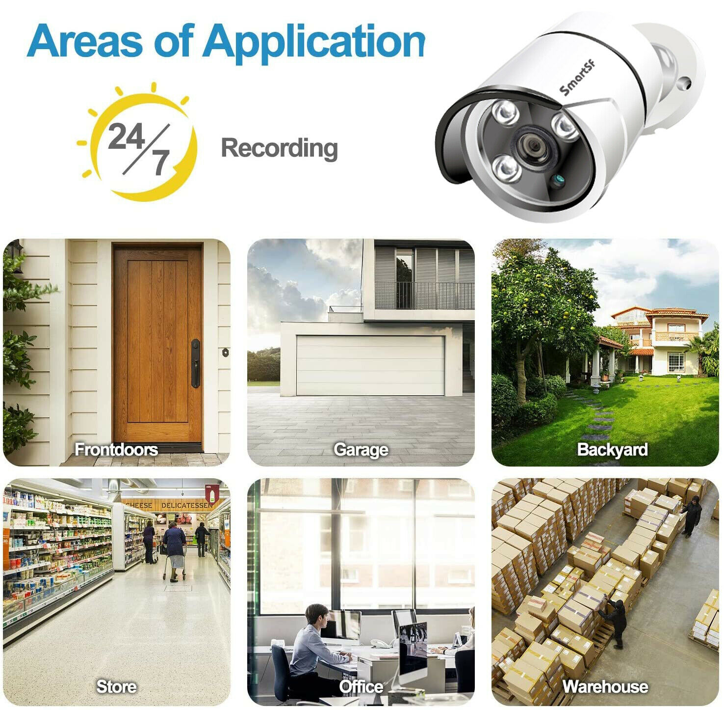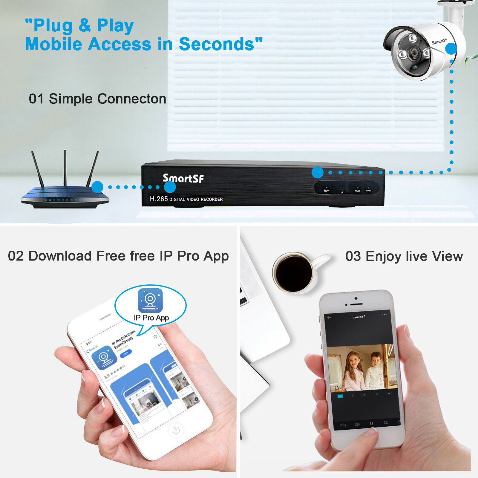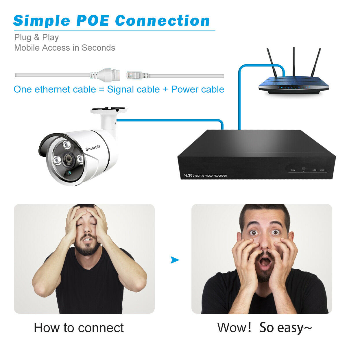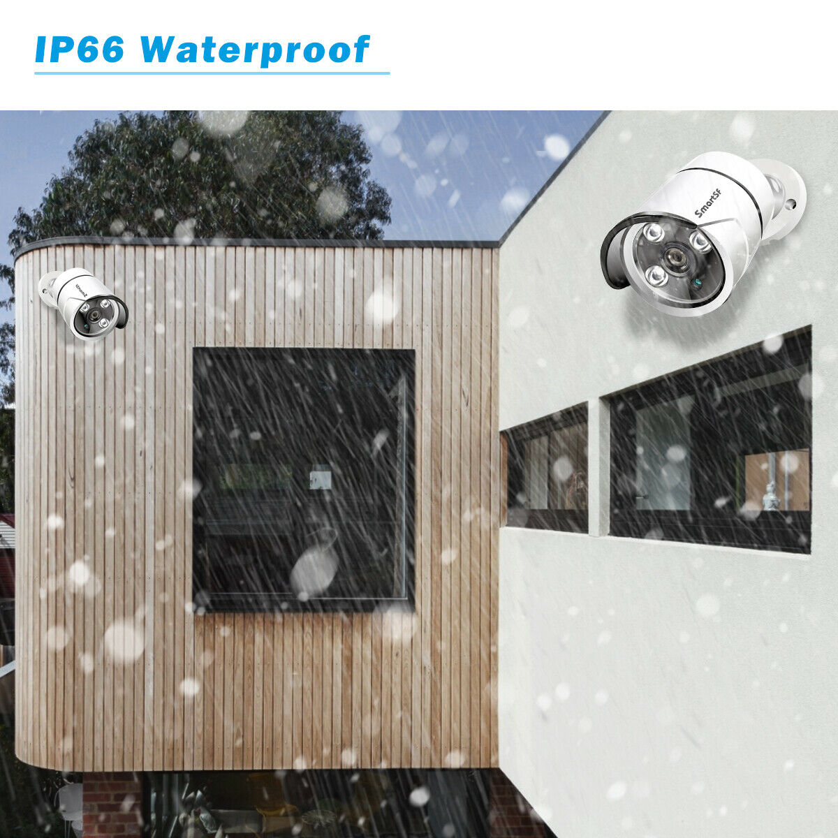 SmartSF 8 Channel 5-Megapixels 2560*1920P Outdoor PoE IP Security Camera System Features: 【Super HD 5-Megapixel High Resolution】 5.0MP IPG5520-F with a pixel resolution of 2560x1920, that is, nearly 2.4X the resolution of 1080p Full HD, and even 1.3X the resolution of 1440p. It sees and records your home security more clearly, with more details. 【Excellent Night Vision, Up to 100ft】 Great cameras aren't just measured by images in daytime. SmartSF 5.0MP security camera kit stands out for its incredibly excellent images at night. Infrared LEDs enable long night vision distance (up to 100ft). Captures crystal clear video evidence of theft and vandalism that occur in low-light conditions. Reliable Solution for Home, Business and Projects. 【Waterproof Works Perfectly Outdoor/Indoor】 The 4 Bullet cameras 5.0MP IPG5520-F have solid aluminum bodies and housing, with an IP66 waterproof rating. So you can feel free to install them outdoors, like in your garage, backyard, or anywhere else. It can stand harsh weather conditions, including rain, snow, intense cold and heat. Rain or shine, hot or cold, these cameras never quit. 【PoE–Easy Setup, Eve n for a Beginner 】 A real plug and play security system! It features PoE (Power over Ethernet), with a single network cable connecting each IP camera to the NVR for both power supply and video signal transmission. Easy wiring – the wiring process can’t be simpler for DIY enthusiasts and beginners. 【Remote Viewing, Anytime, from Anywhere】 No matter where you are, you can remotely access the security camera to see live streaming and stay connected. Remotely view the IP camera via free “IP Pro” App on your mobile device, free “E-see Net” CMS Client on your computer, web browser. Even when you are in your office or travelling, you can check what's happening to your home/business on the go. PoE Network Video Recorder Specifications: IP Video Input: supports 4 IP cameras Video Output: Monitor or HDTV via VGA, HDMI Compression Format: H265+, H.265 and H.264 Playback: 4 cameras play simultaneously HDD: Not included HDD Capacity: 1x internal SATA port, up to 6TB Power over Ethernet Sockets: RJ45 x 4 USB Port: 2x USB 2.0 (mouse control, backup, firmware upgrade) Remote Access: iPhone, Android Phone, Windows PC PoE IP Camera Specifications: Image Sensor: 1/2.8" CMOS Sensor Effective Pixels: 2560 x 1920 (5.0 Megapixels) Frame Rate: Main Stream@25fps, Sub Stream@6fps Day & Night Vision: Auto / Color / BW Output Interface: RJ45 Operating temperature: Up to +60℃ What’s In Box: 1x 8CH 5MP NVR 1x 4pcs 5MP cameras 1x USB mouse 1x DC 48V3A power supply for NVR 4x 18m network video cable for IPC 4x Screw kit for IPC installation 1x User manual