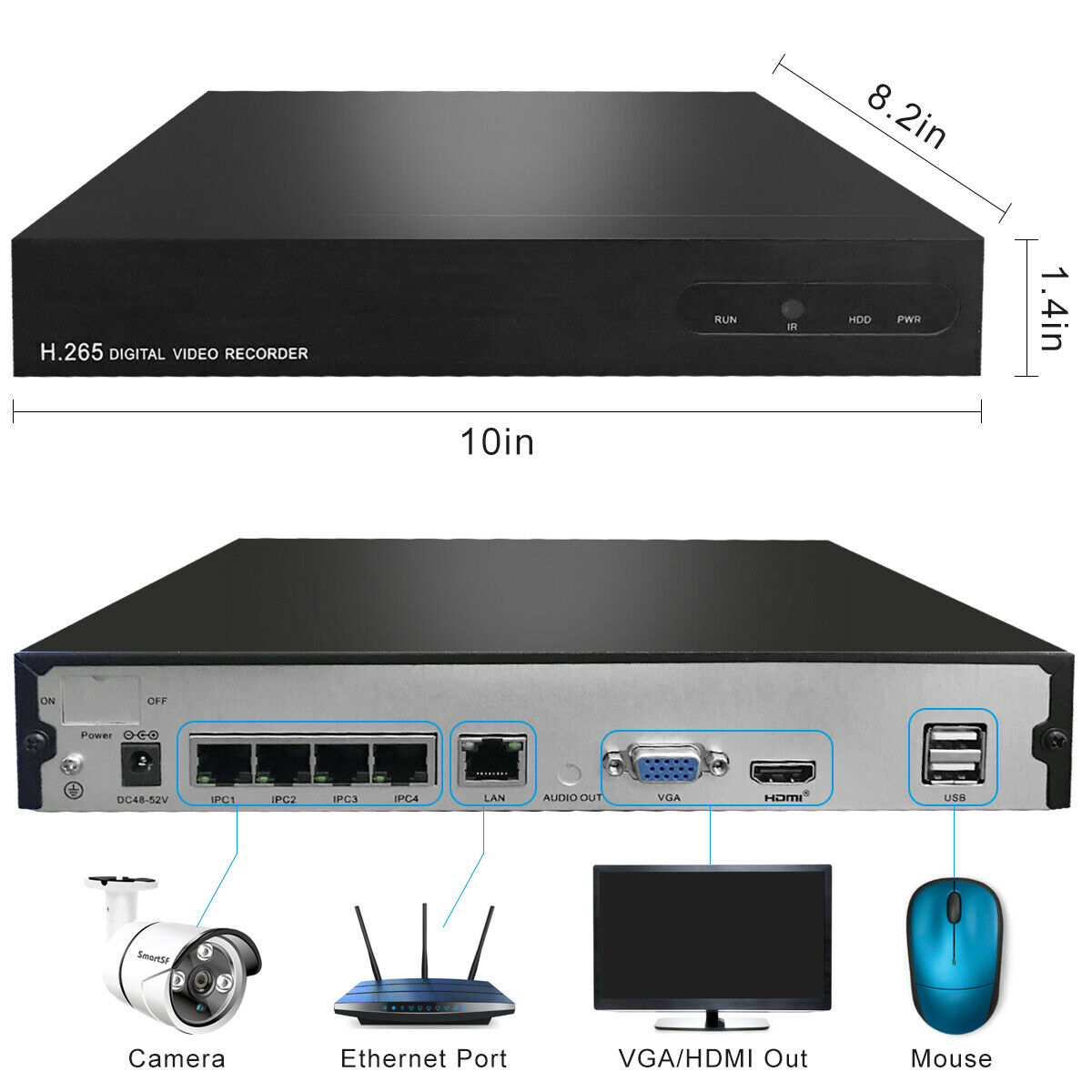Condition: New Type: Bullet Brand: SmartSF Item must be returned within: 60 Days Location: Indoor/Outdoor Compression Format: H265+, H.265 and H.2 Surveillance Technology: CCTV Features: Audio Recording Smart Home Protocol: Infrared Connectivity: Wired Effective Pixels: 2560 x 1920 (5.0 Megapixels) Power over Ethernet Sockets: RJ45 x 4 Output Interface: RJ45 MPN: Does Not Apply Items Included: Camera Number of Cameras Included: 4 Application: Indoor/Outdoor Day & Night Vision: Auto / Color / BW Maximum Resolution: 5MP Storage Capacity: 6TB,hard disk Not included HDD Capacity:: Not included! internal SATA port, up to 6TB Return shipping will be paid by: Country/Region of Manufacture: China Operating temperature: Up to +60℃ All returns accepted: Returns Accepted Refund will be given as: Money back or exchange (buyer's choice) Number of Channels: 4 Model: Security Camera System