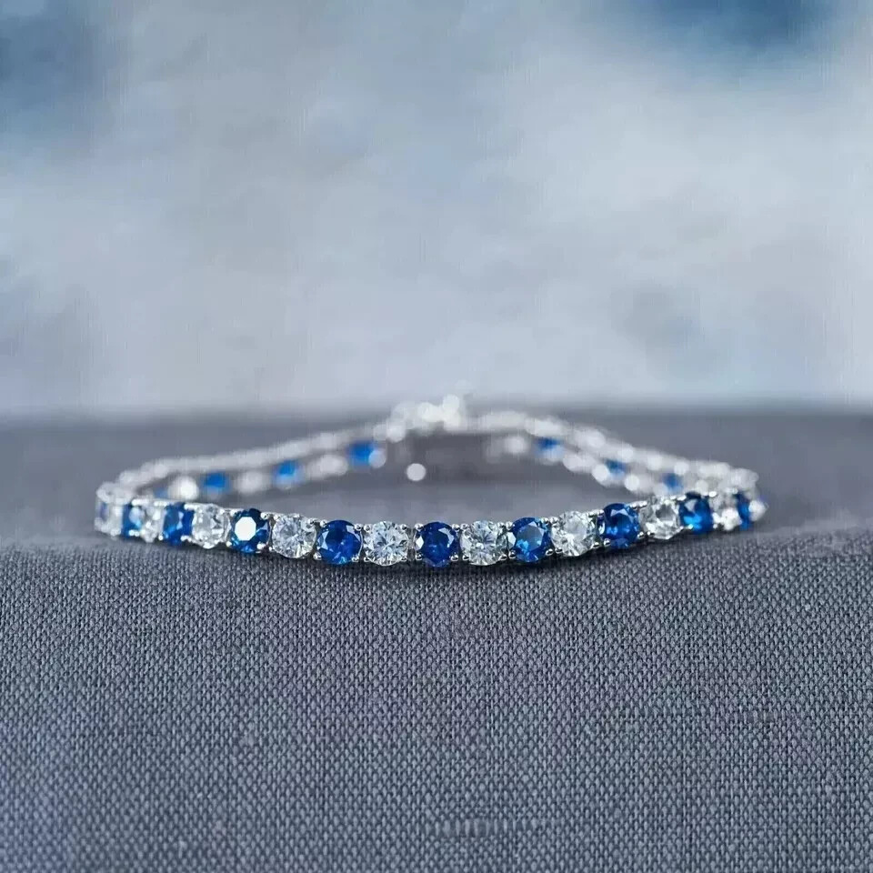 $ 92.0414K White Gold Plated 5Ct Round Cut Lab Created Blue Sapphire Tennis Bracelet 7"