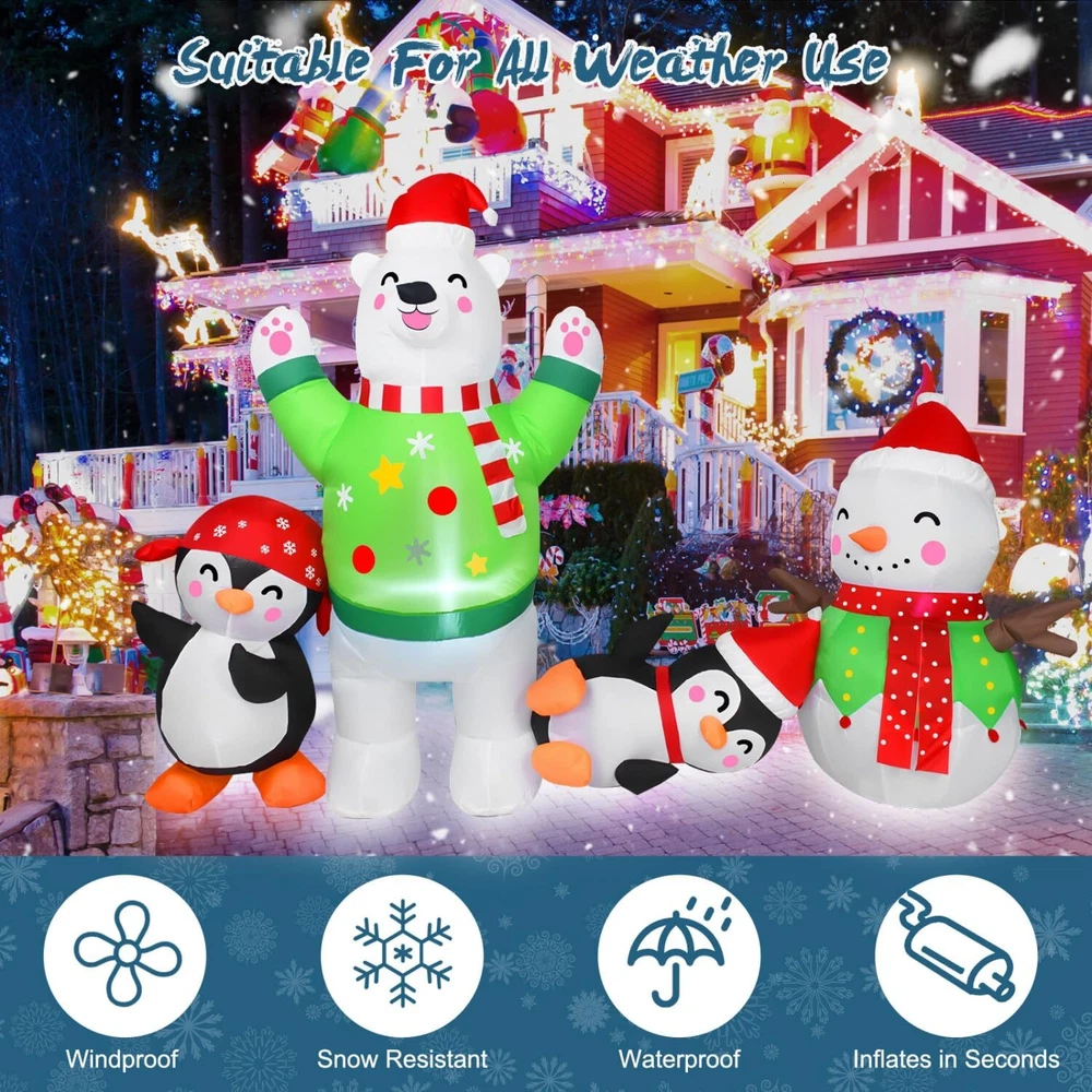 8FT Christmas Inflatable Outdoor Decoration Inflatable Snowman Plays with Penguin Polar Bear Christmas Decorations Outside Blow Up Christmas Decorations Outdoor Christmas Inflatables for Yard Cute And Festive Christmas Decorations: The Christmas outdoor inflatables are made up of snowmen, polar bears and penguins in different shapes. Cute & charming. Christmas decorations create a strong festive atmosphere and are deeply loved by kids High Quality: Christmas blow up yard decorations made of high-quality polyester, weatherproof and fade resistant. Equipped with 2 windproof ropes and 4 ground stakes, and built-in sandbags to ensure a more stable stand when used outdoors Super Bright LED Lights: The Christmas yard inflatables decorations are Built-in super bright LED lights, 8 FT long. Illuminate your lawn garden house at night and make your yard more eye-catching. Kids and adults alike will love it Quick Inflatable: Our outdoor inflatable christmas decorations are equipped with a powerful built-in fan, just plug it into the socket and in seconds you will have a glowing inflatable Christmas decoration. Easy to install and disassemble Perfect Christmas Gift: Perfect for Christmas outdoor decorations. You can place it in your garden, front, backyard or party, etc. to give your friends and family a stronger Christmas atmosphere. Can also be used as Christmas gifts