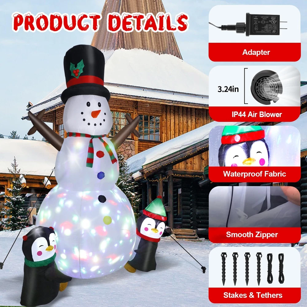Inflatable Christmas snowman with 2 cute penguins-Inflating in minutes when plugged into any stanadard electrical outlet. Great for Any Occasion: Wonderful for yard decoration, home, garden, lawn, holiday, indoor, outdoor Christmas decorations. The festive atmosphere of Christmas will revolve around your family. Specifications: Material: Polyester Fabric Model: RH-120-1250U4-1 Product Size: Height: 243.8cm/8FT, Length:150cm/4.9FT, Width:85cm/2.79FT Power Cord Length: 2m Package Included: 1 * Inflatable Snowman with Two Penguins 4 * Stakes 2 * Ropes 1 * Blower 1 * Power Adapter 1 * Instruction Manual Note 1. Be sure the zipper is full closed before inflating 2. Do not put anything into the blower. 3. Do not place the plug in the rain or snow, which will cause a short circuit. 4. Turn the blower outlet towards the product so that it will inflate much faster. 5. Please dry before storage. 6. Please keep away from sharp tools when inflating. 7. Protect the blower and power cord from water, fire, and severe weather. 8FT Christmas Inflatable Snowman: giant snowman wears an exquisite hat and a pretty scarf, and two adorable penguins hug him, adding a touch of liveliness and charm to the overall design. Its towering size and cute appearance instantly attract children and neighbors' attention. Dazzling Colorful LED Lights: Our inflatable snowman is built-in multicolored LED lights, as if it comes to life in a kaleidoscope of colors. The enchanting lights can rotate and caste a warm and inviting glow that beckons everyone to gather 'round and soak in the holiday spirit. Superior Quality Materials: Made of high-quality waterproof polyester cloth, weather-resistant, fade-resistant, ensuring it remains vibrant and eye-catching even in rainy or snowy conditions, providing years of joyful celebrations. Besides, the UL listed adapter ensures safety for outdoor use. Quickly Inflation & Well Steady: The powerful blower can make the inflatable snowman blow up in minutes once plug into an outlet. Come with 4 ground stakes and 2 ropes for added stability, even sewed 3 pockets for sandbags inside to ensure it stands firmly even in windy weather. Perfect Outdoor Christmas Decorations: Our Xmas inflatable snowman is great choice for yard, garden, lawn, indoor/outdoor holiday party, Christmas night event, amusement park and shopping mall etc. You can also give it as a Christmas gift to your family and friends to celebrate Christmas together!