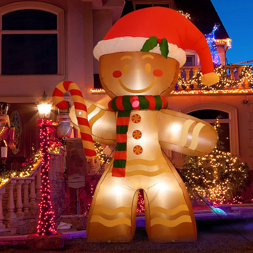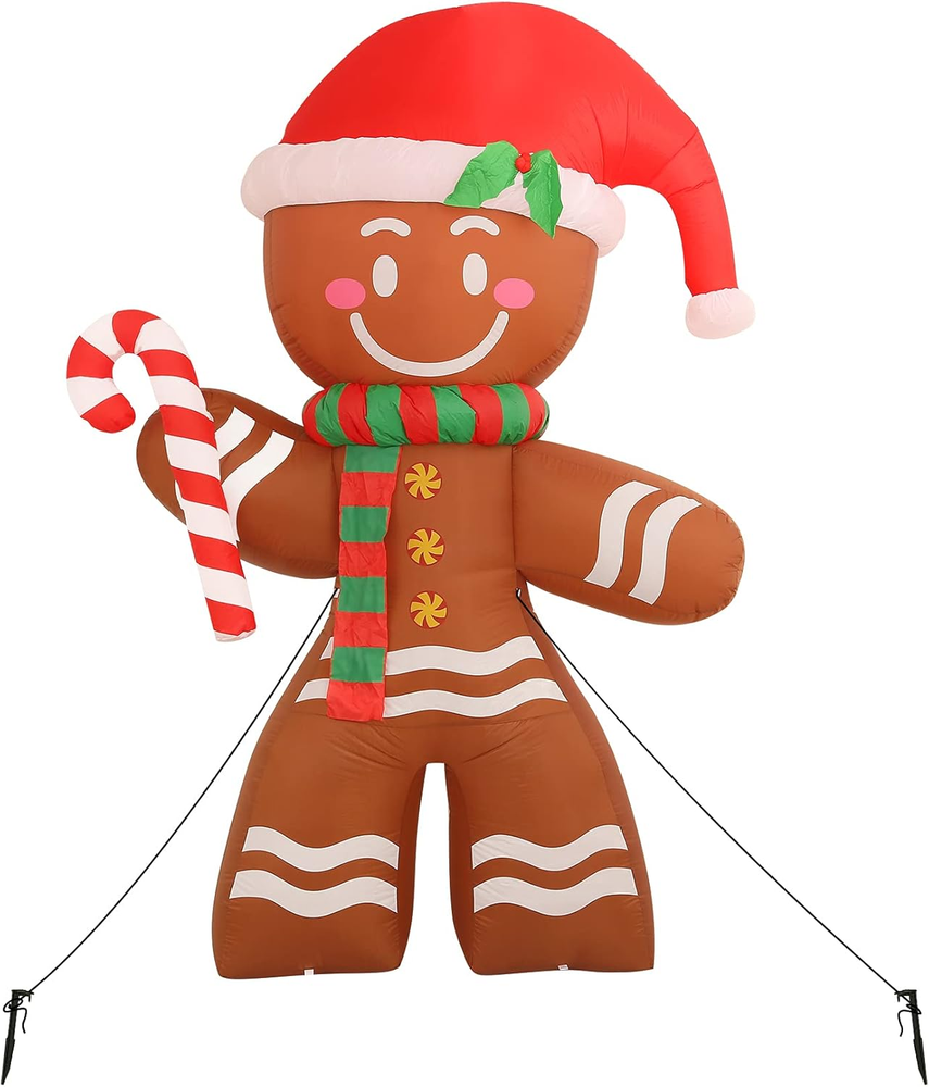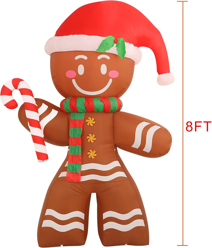 High Quality Durable Material & Easy to Inflate - Made of high quality Polyester material, which is strong, secure and durable material, not easy to tear, adds the perfect touch for Christmas! The inflatable Gingerbread man is super easy to inflate, just zip it up and plug it in, you will see It go from laying down to fully inflated within a couple of minutes. Taking it down is just as easy, simply unplug it and roll it up. Build-in LED Light - Super bright LED light and colorful design are the spotlight of your Christmas decorations. There are bright LED lights inside, This Inflatable Gingerbread Man will really stand out and be visible even on the darkest night with his bright lights. If you like the design, this will be a good addition to your Christmas decoration! Stable and Steady Enough - Don't worry that the Christmas inflatables will fly away with the wind. It came with 8 stakes and 4 rope to hold in place if necessary. and built in sandbags. It is easy to stake down and seems fairly sturdy. BLOW UP FAST- Setup is super simple. Just plug it in, everything pops up in a minute! The package comes with an extended cord, fan, ground stakes, fastened ropes, built-in sandbags, and a plug with UL certification. Great for Festival - 8 FT Gingerbread Man Inflatable is ideal Christmas blow up yard decorations. The Christmas Inflatables will light up your yard and welcome your lovely neighbors. Entertain your guests and family with this fun Gingerbread Man inflatable. Perfect for Christmas Indoor outdoor yard garden lawn decorations, Christmas event decoration, party decorations. Product description
