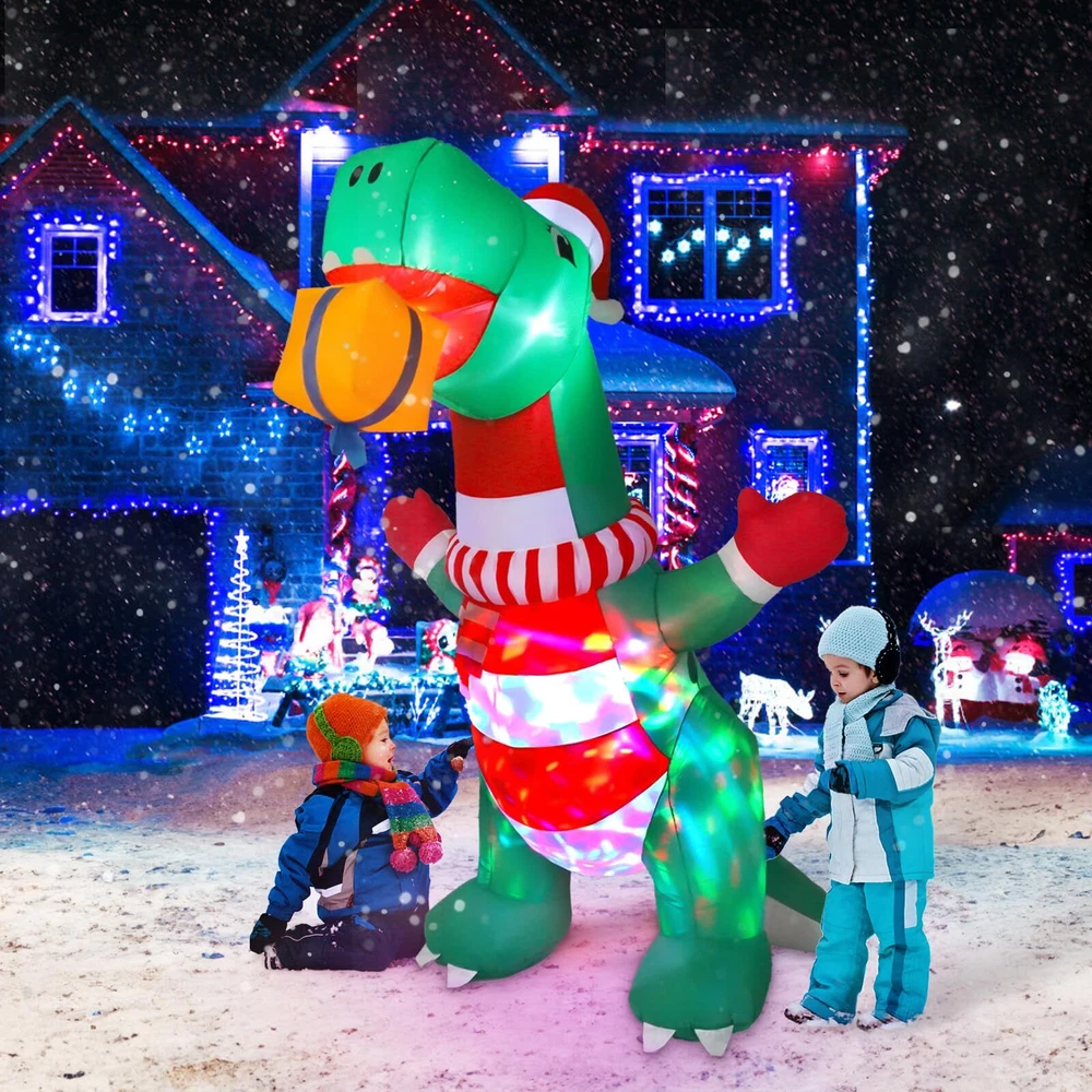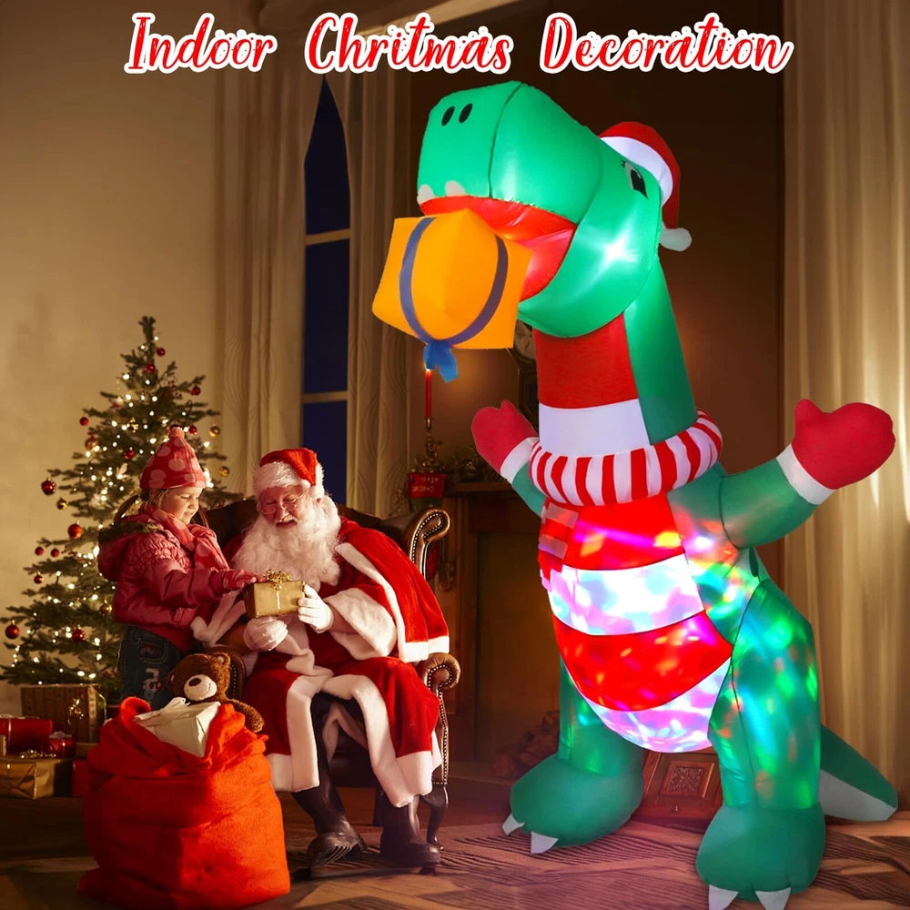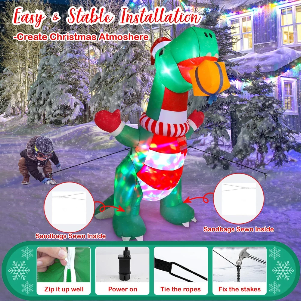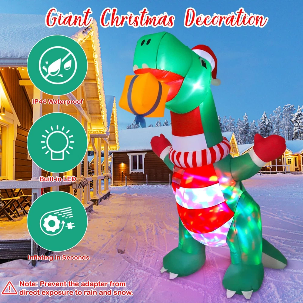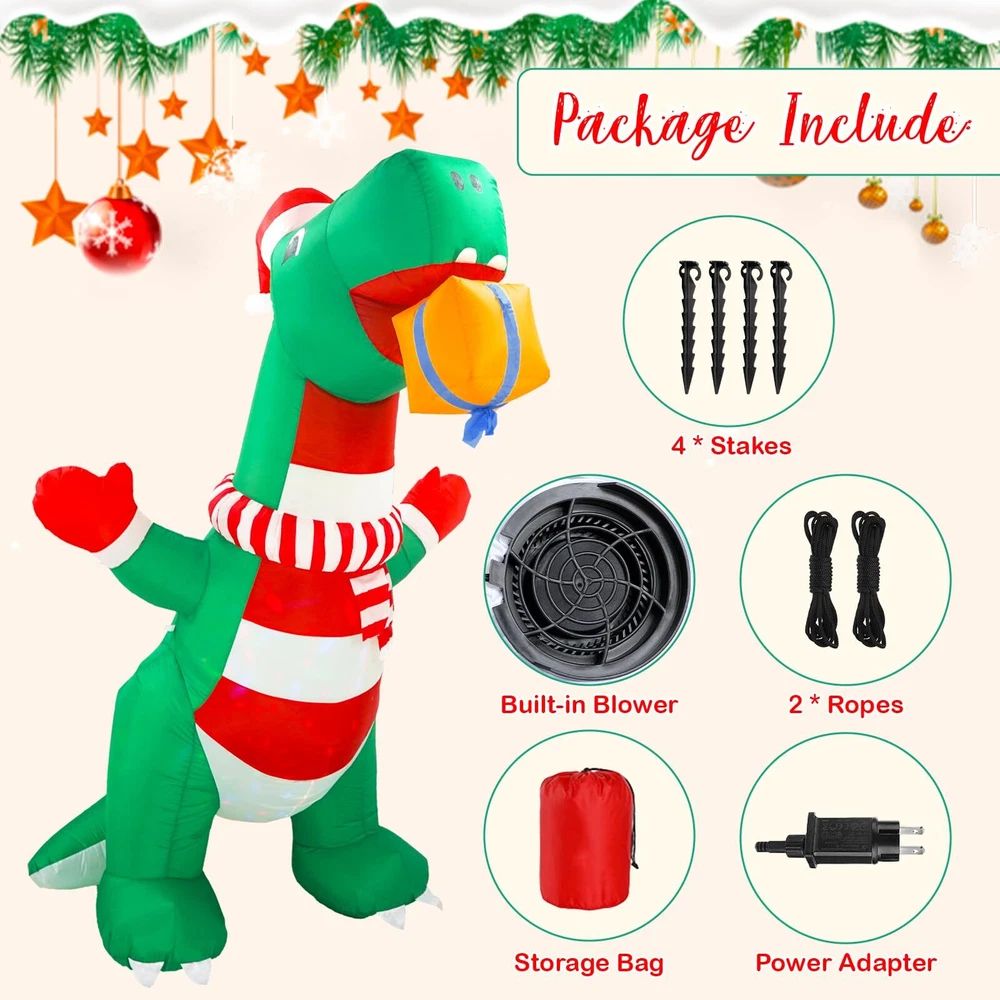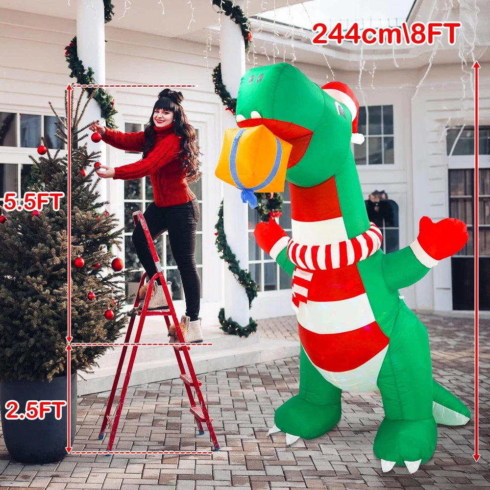 Elevate Your Holiday Celebrations with Wothfav 8FT Christmas Inflatable Dinosaur! Standing tall at 8 feet, this festive decoration brings the magic of Christmas to your doorstep. Our cute Xmas inflatable dinosaur wears a cute Xmas hat, scarf and gloves, holding a Christmas gift box in its mouth, which is like a friendly gift giver. The built-in rotating colorful LED lights create a mesmerizing display, lighting up your space with holiday cheer, day and night. With a powerful internal fan, it self-inflates quickly, ensuring hassle-free setup. Crafted from durable IP44 waterproof fabric, it's designed to withstand the elements and bring festive joy year after year. Perfect for gardens, yards, indoor gatherings and outdoor parties, it comes with 2 ropes, 4 ground stakes, and sew 3 small pockets inside for sandbags to add more stabilities. Let our Xmas inflatable dinosaur grace your festive decoration with his welcoming presence. Specification: Main Color: Green, Red Size: Length 125/4.1FT cm, Width 85cm/2.79FT, Height 243.8cm/8FT Material: IP44 waterproof polyester Package Included: 1 * Christmas Inflatable Dinosaur 4 * Stakes 2 * Ropes 1 * Built-in Air Blower 1 * Power Adapter 1 * Instruction Manual Note 1. Be sure the zipper is full closed before inflating 2. Do not put anything into the blower to avoid obstructing airflow outlet. 3. Do not place the plug in the rain or snow, which will cause a short circuit. 4. Please dry before storage. 5. Please keep away from sharp tools when inflating. 6. Protect the blower plug and power cord from water, fire, and severe weather. Impressive Christmas Inflatables Outdoor Decoration: Wothfav 8FT giant festive dinosaur wears a cute Xmas hat, scarf and gloves, holding a Christmas gift box in its mouth, which looks like to share the gift with you. Undoubtedly, the nerdy and cute inflatable dinosaur will be loved by your kids. Weatherproof & Durable: Crafted from high-strength thickened waterproof 210T polyester fabrics, our Christmas inflatable dinosaur is designed to withstand the rain, wind, and snow, fade-resistant and long-lasting, ensuring a vibrant and cheerful Christmas year after year. Mesmerizing LED Lights: Built-in rotating colorful LED lights to create a dazzling display at night, instantly lighting up the cheerful ambiance of Christmas night, and attracting a lot of children, neighbors and guests, making your Christmas yard decorations a big hit around. Rapid Inflation & Stable: With a powerful air blower, just simply plug it in, the the inflatable dinosaur come to life in minutes. Equipped with 4 ground stakes and 2 ropes, even sewed 3 pockets inside for sandbags to add more stabilities, ensuring it stands strong even in the outdoor challenging weather. Perfect Christmas Holiday Decor: Whether it's your front door, garden, yard, lawn or indoor Xmas decoration, our Christmas inflatable dinosaur adds a touch of holiday magic. Also, it is suitable for Christmas night event, Christmas party, Xmas party gifts, shopping mall holiday decorations, etc.