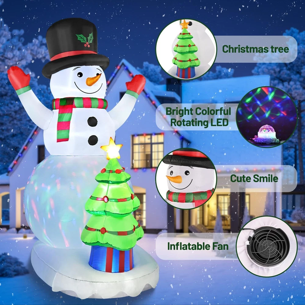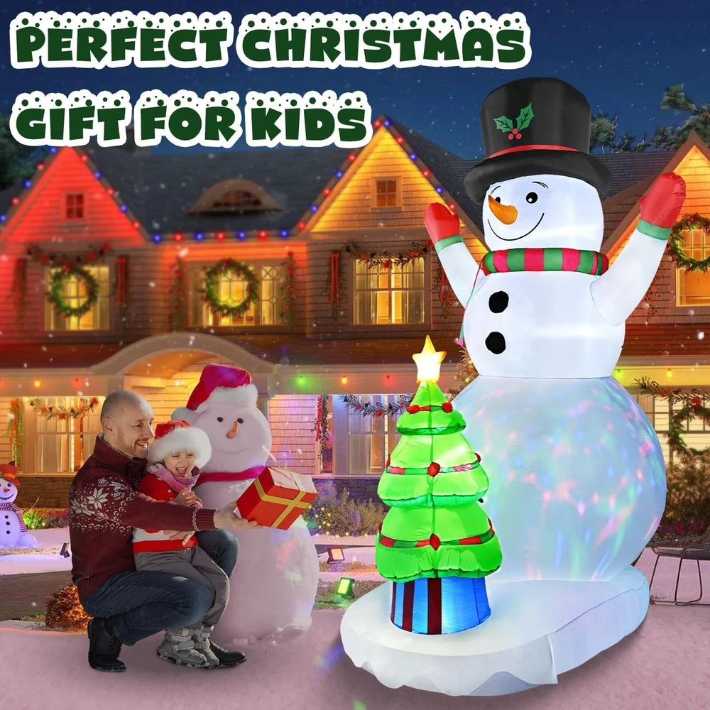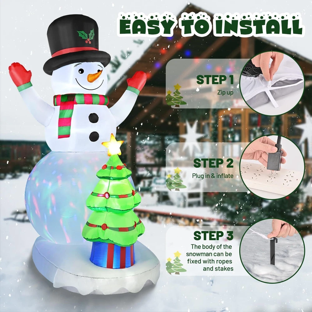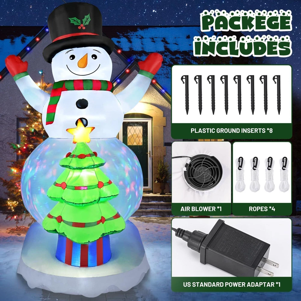 Package Include: Plastic Ground inserts *8 Air blower *1 Ropes *4 US Standard Power Adaptar *1 Christmas Inflatables Snowman and Christmas Tree: 8FT Tall Snowman inflatable wears a hat and opens its hands as if it is embracing you warmly, Christmas tree inflatable is set up in front of the round belly,Smiling and waving hands, such an eye-catching christmas inflatable outdoor decoration in your front door. Bright Colorful Rotating LED Lights: Snowman outdoor Christmas decorations feature super bright colorful LED lights,It is very suitable for displaying at night.The dazzling lights will attract neighbors and guests to stop and take photos and interact,illuminating your lawn or garden,createing a happy and joyful Christmas atmosphere Easy Self Inflating in Seconds: Just zip up the bottom zipper and plug into the power, you will get a giant snowman blow up christmas decorations within few minutes.The inflatable can quickly deflates and can be easily stored in a small space,which makes it an ideal outside christmas decorations for a Christmas party decoration Safe and Secure: No need to worry that your christmas inflatables outdoor will fly away with the wind,the solid foundation design is very stable,also equipped with 4 Fasten Ropes, 8 Ground Stakes that strenthen the stability.The inflatable snowman is made of waterproof and wrinkle resistant polyester,The reinforced seams provide extra durability, ensuring that this Christmas decorations inflatable outdoor will last through many holiday seasons. Best Christmas Decorations Outdoor Kit: This Christmas inflatable is one of the ideal Christmas Decorations for hosting a Christmas event, our winter Christmas outdoor yard decorations are about to create a happy and joyful atmosphere for you to enjoy a great time with families and friends