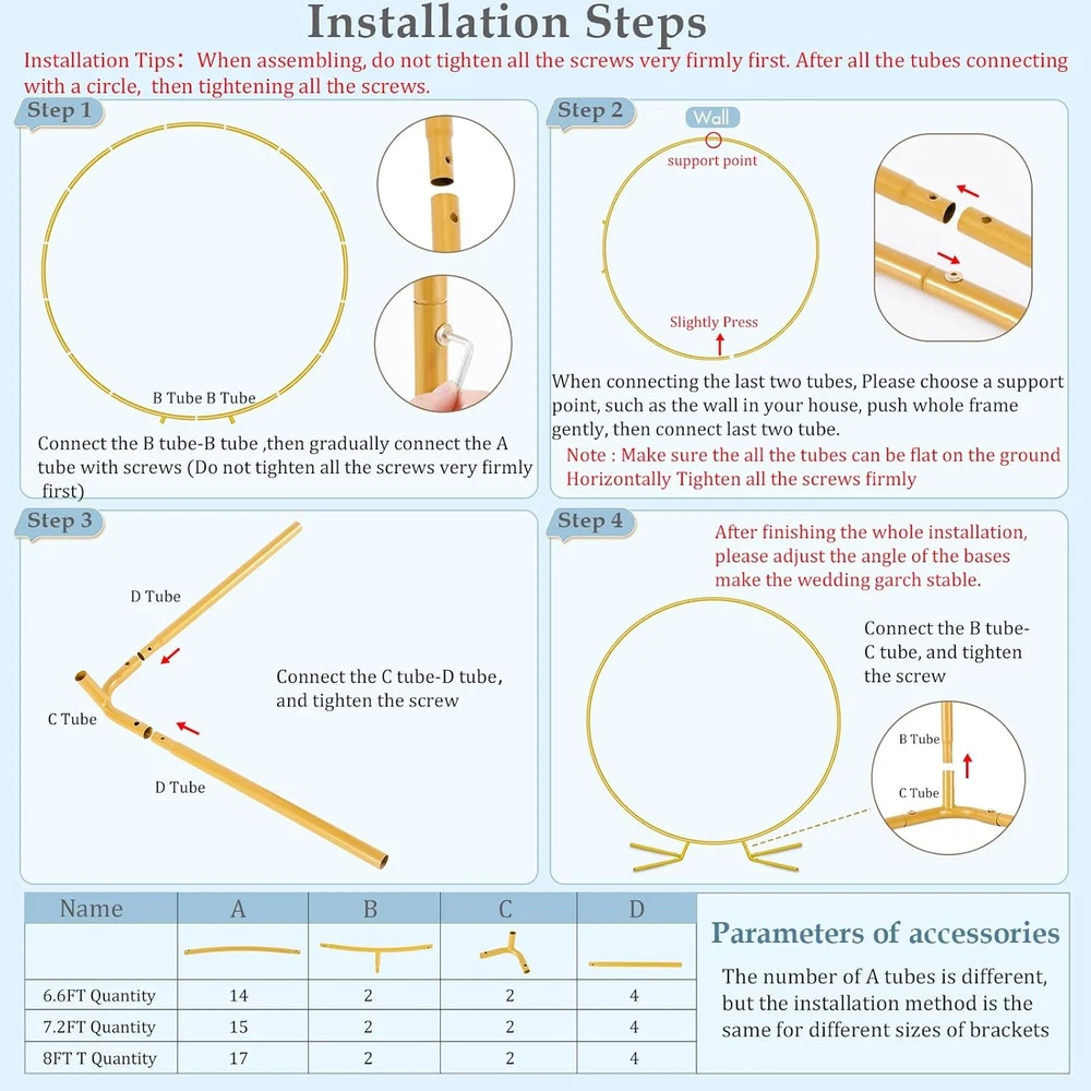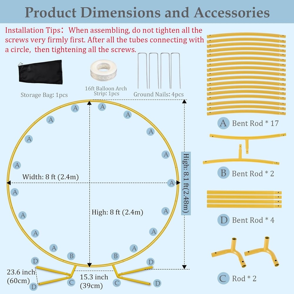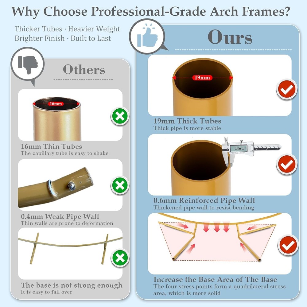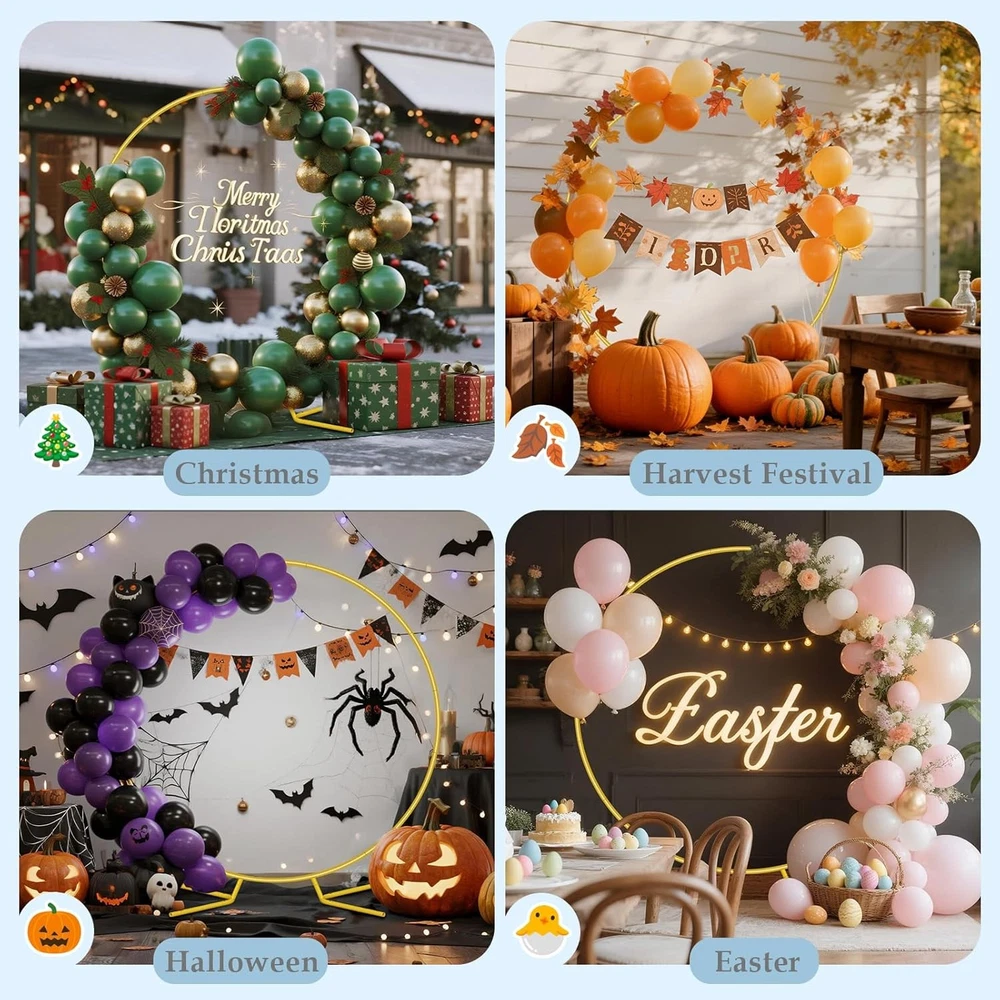 Free eBay listing template designed by dewiso.com 8FT Circle Arch Backdrop Stand for Parties, Round Balloon Arch Stand Kit with Base, Metal Gold Wedding Arches Frame Heavy Duty for Ceremony Birthday Baby Shower Gender Reveal Party Decoration FREE AND FAST SHIPPING! About this item Patent Applying Upgraded Base Design & Thickened Metal Pipe: Experience superior stability with our premium metal arch backdrop stand. Crafted from thick, 19mm diameter rust-proof tubing (0.6mm wall thickness) – significantly sturdier than standard 15mm tubes – while its engineered base expands the stress area via four optimized weight distribution points, ensuring your wedding arch stand remains flawlessly secure and wobble-free throughout any event. Balloon Arch Stand Kit: Meet every decorating vision with our unique 8ft arch backdrop stand. Create stunning focal points of varying heights for ceremonies, photo backdrops, or centerpieces, all featuring a luxurious metal arch stand finish. All-Inclusive Gold Wedding Arch Backdrop Stand Kit: 1pcs 8ft Round arch backdrop stand, 4pcs ground spikes , 1pcs 5m balloon strips, 1pcs storage bag. Reinforced spikes secure on grass/sand for child-safe stability.Drape with flowers, balloons, fabric, or lights to create breathtaking entrances, captivating Background Support, or enchanting seasonal centerpieces. Transform Any Space for Any Occasion: This versatile backdrop stand for parties kit goes far beyond a simple wedding arch stand. Instantly elevate celebrations like baby showers, birthdays, graduations, and photo booths – or create stunning seasonal focal points for Christmas wonderlands, spooky Halloween setups, festive harvest festivals, and joyful Easter gatherings. Premium, Portable & Reusable Investment: Designed for lasting beauty and ease, our rust-proof gold backdrop stand heavy duty feature a premium electroplated finish. The included black storage bag ensures simple transport and compact storage, making this balloon arch kit a reusable centerpiece solution for countless celebrations to come. Product We offer a 30-Day Return Policy on items which you are not completely satisfied with. You have the option for a full-refund or an exchange of the item. No returns are available on items shipped outside of the US . Shipping We offer Free Shipping to the US and ship within 2 business days of payment, usually sooner. We use UPS express shipping. That's why your products are usually delivered within 3 days . Contact We try our very best to make sure every customer is completely satisfied. If there's a problem , message us! We're happy to help. 24/7 live chat available.