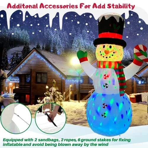 30 Days Return Policy Fast Delivery Trusted seller 8FT Inflatable Snowman Christmas Outdoor Yard Decorations Outside Giant Tall Cute Blow Up Decoration with Built-in Colorful Rotating LED Lights for Indoor Holiday Party Yard Garden Lawn Xmax Product Description 【Cute Christmas Yard Decorations & Super Thick Excellent Material】Our 8 feet snowman inflatable with Top Hat,scarf,candy cane. The cute smiling face and open hands seem to give people a warm hug,this snowman is made of super thick durable strength waterproof polyester that is weather-resistant, fadeproof, the excellent stitching improves the durability of the inflatable decoration. DONT WORRY about rips and tears, easy to clean and maintain for a long time use. 【Upgrade Super Bright Roating LED Lights】This 8FT giant outdoor inflatable christmas decorations has 2 Built-in eye-catching energy saving bright colorful rotating LED Lights, when you light up at night this snowman, moment illuminate your lawn or garden at night. attracts the attention of neighbors and children, The blow up decorations bring a strong Christmas atmosp,let your family have charming and cheerful holiday time. 【Safe and Stable】 This Christmas inflatable yard decoration is equipped with 10 ft power cord, you can easily placed it anyw in your yard or garden. Certified for UL and CE outdoors and uses only 12 volts, let your Christmas safer. With 6PCS ground stakes and 3 Build-in heavy sandbags, and tethers on both sides of the product, keeping it secure to the ground. No worries about if this inflatable might fly away by the wind. 【Quick Inflated & Deflated】The height of 8FT Christmas decorations outdoor equipped with a powerful built-in fan,can easily blow up inflatables in a few minutes,lightweight and self-inflating design make it easy to set up and store.The bottom zipper avoid air leakage and helps fast deflate. NOTE: Please make sure the air blower is facing up when inflating. The air blower facing the ground will affect the effect of inflating. 【Perfect Outdoor Christmas Decorations】 huge inflatable christmas yard decorations kit included with a built-in air fan, 3 fixed sandbags,2 colorful rotating led lights,6 ground stakes,2 ropes and a plug with UL certification,1 gift box,1 manual. Cute Santa Back a gift inflatable is perfect Christmas Décor for outdoor indoor, yard, garden, lawn, party, holiday, festivals, Xmas Shipping Returns Payment Shipping Shipping is FREE to all addresses other than APO/PO boxes in the lower 48 states. All our stock ships from US-based warehouses. Shipped via USPS or UPS (depending on location and package weight) Unless stated otherwise, all orders will ship within 24-72 hours of your payment being processed. Check our feedback to see the great reviews of FAST shipping we offer. Returns As our valued customer, we will do our best to make sure the product you receive arrives to you on time and as expected. If you are not satisfied with your purchase, please contact us within 30 days of receiving your order to process a return. Payment We currently accept payment via eBay managed payments only. Once payment is cleared, we will dispatch your shipment within 1-3 business days. Please refer to the "Shipping" tab for more information regarding shipping speed to your destination.