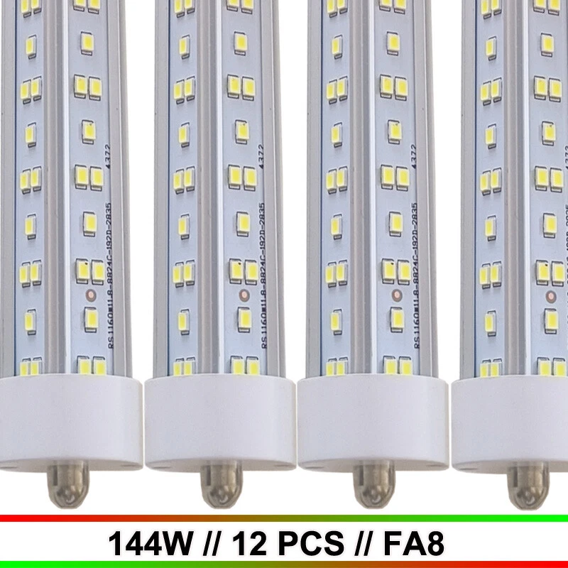 FAST DELIVERY - Ship from New Jersey or Los Angeles Warehouse via FedEx , 3-7 Days Delivered Your Door . SCIENTIFIC DESIGN - 8Ft LED Shop Lights Fixture is Made of 6500K Cold White SMD2835 LED Chip ,Plastic Clear Cover , Aluminum Bracket Housing ,and AC85-277V Constant Current Driver . It can work in -68F to 120F Temperature Conditions EASY INSTALLATION - The Integrated Tube Fixture Can be Install on Wall or Ceiling ,Easily Replace Traditional Fluorescent Tube Bulb . Plug and Play , Free Accessories (Power Cords, Connector , Extension Cords , Clip and Screw ) Come with Tube Lights Together WIDE APPLICATION - Linkable 8Ft Bulbs Widely Used in Garage Ceiling , Barbershop , Schools, Hospitals Basement , Factory Warehouses , Supermarkets Cooler Door , Offices, Shops,Hotels, etc 8FT Led Tube Light 144W FA8 T8 Single Pin LED Shop Light 8FT Bulbs 6500K 12PC 【No RF & FM Interference】LED Driver have passed Electromagnetic Magnetic Compatibility EMC tests,No cause EMI ,No longer subject to any RF & FM jamming. Never interfering with the signal of your garage roller shutter door,No make noise when you listen radio 【Easy to Install】Just simply bypass the ballast and connection AC85-277V AC power . Not compatible with single-ended powered sockets 【Wide Application】 - 8Ft 144W V Shaped FA8 HO LED Bulb fitted to replace traditional F96T12 T8 T10 T12 fluorescent bulbs. Widely used in Garage,supermarkets, offices , convenience stores , gas stations , warehouse,parking lot,shops, hotels,Refrigerator,coolers or freezers illumination,etc 【High Output】8Ft 144W 18000LM FA8 【Rotate Cap & Swivel End】 Easy Adjust rotated Lighting Direction within 180 degree after Installation