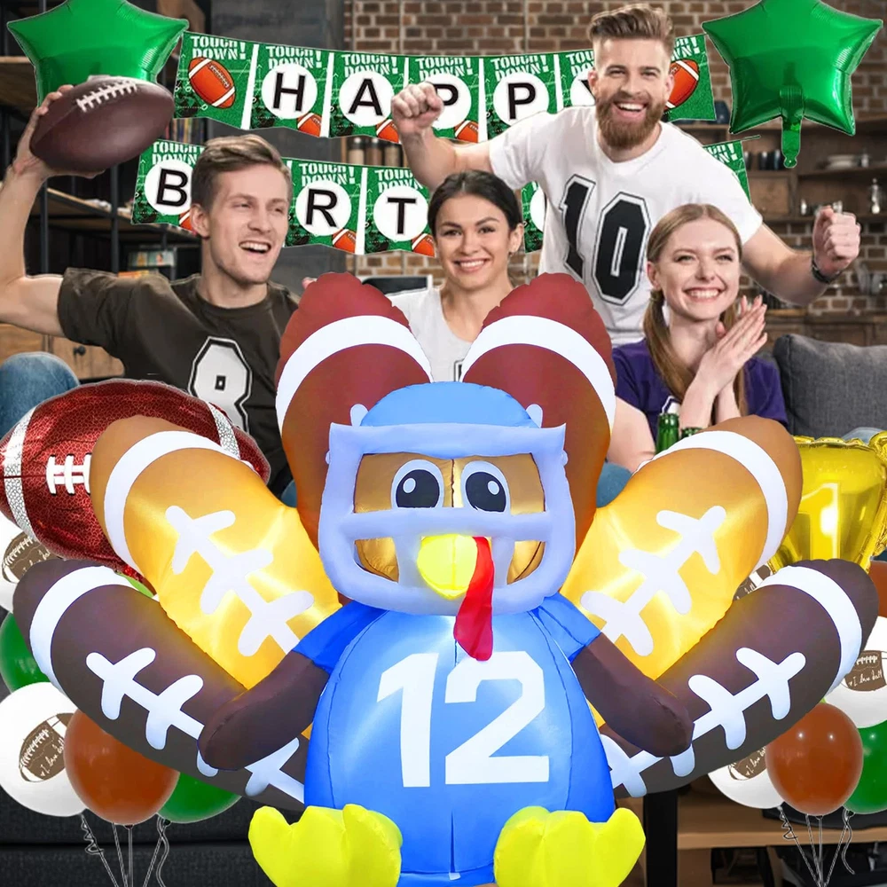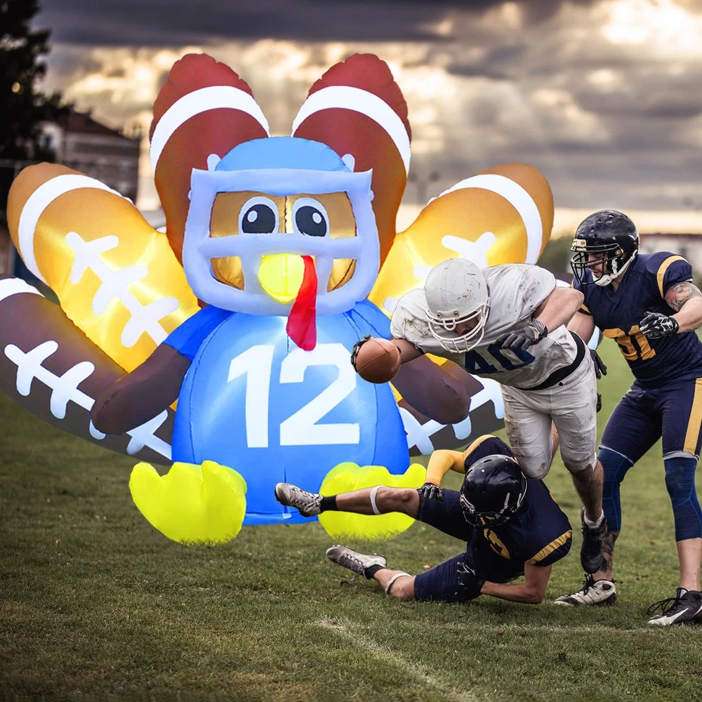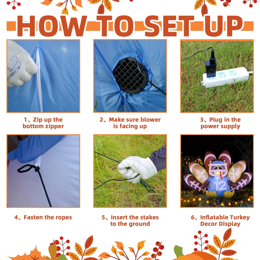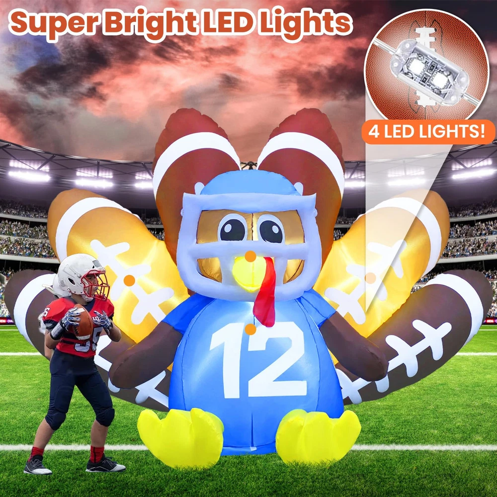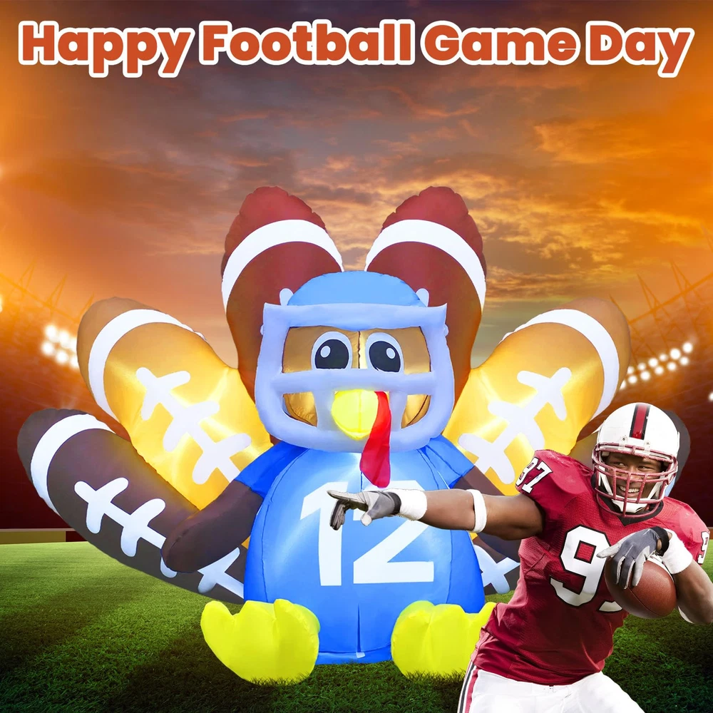 【Perfect Inflatable Turkey for Thanksgiving】 Our 6FT Football Turkey Inflatable with LED lights creates a warm, festive atmosphere at night. This Turkey No.12 decoration is sure to make your yard the highlight of Thanksgiving. 【Fast Inflation & Energy-Efficient】 Made from premium waterproof polyester, this inflatable turkey outdoor Thanksgiving decoration is built to last. The quiet, powerful fan keeps your blow-up turkey inflated with minimal energy use. 【Easy Setup & Storage】 Setting up is simple with the included UL adapter, stakes, tethers, and storage bag. The blow-up turkey comes with an extension cord for flexible placement. After the holiday, deflate, fold, and store it easily. 【Versatile Decor】 Perfect for your yard, garden, patio, lawn, or doorway, this football turkey inflatable adds festive charm to any space. It’s a great way to catch attention and bring holiday cheer. 【Exceptional Customer Support】 We’re committed to providing top-notch customer service. Our dedicated service team is here to ensure you have a smooth and enjoyable experience with your Thanksgiving inflatable outdoor decoration.