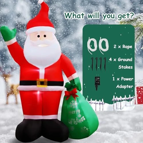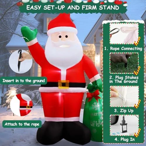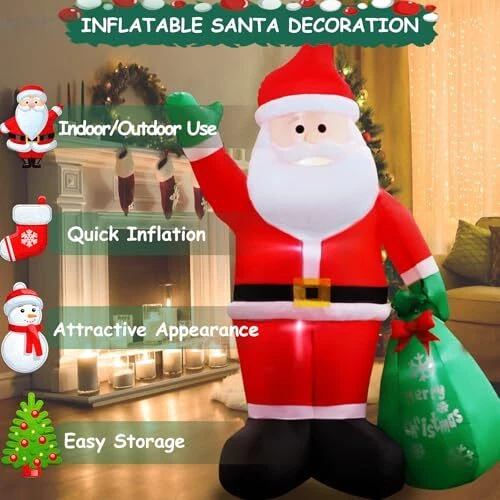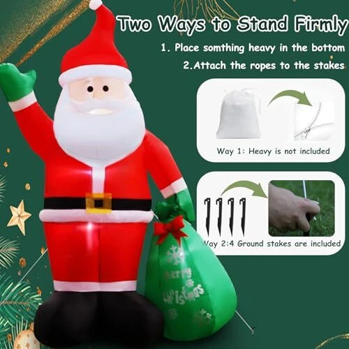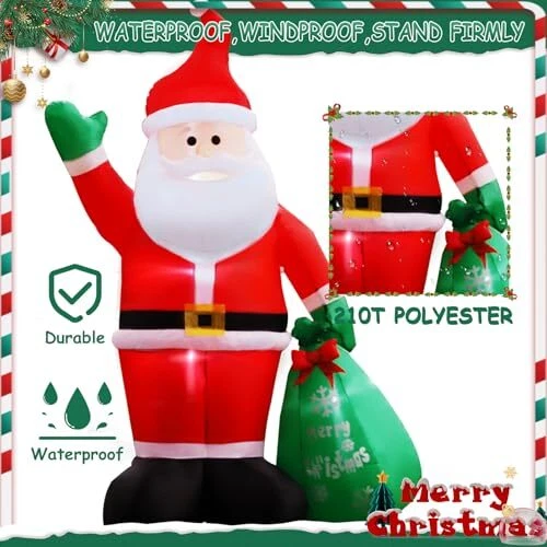 30 Days Return Policy Fast Delivery Trusted seller 8FT Outdoor Christmas Inflatables Decorations Santa Claus with Gifts Bag Christmas Inflatables Blow up with Built-in LED Lights Inflatable Santa for Outdoor/Indoor/Yard/Holiday Decor Product Description BRING HOLIDAY CHEER IN CLASSIC CHRISTMAS FASHION - Infuse your holiday spirit with our 7-feet inflatable Santa Claus and build the perfect holiday yard display this year to outdo the neighbors and bring holiday cheer in classic Christmas fashion SUPER BRIGHT LED LIGHTS —Eye-catching, bright LED lights built inside the inflatable Santa. Warm white 4 LED lights create the ultimate festive Christmas display in your yard this holiday season. With the Outdoor Santa Claus Christmas Holiday Inflatable, you can bring the holiday spirit to life SEIF-INFLATING &WATERPROOF FOR OUTDOOR USE—Our Christmas inflatable yard decoration is crafted from high-quality, 210T thickened polyester PVC waterproof material, ensuring long-lasting durability and resistance to tearing. It features a powerful waterproof built-in fan and a UL-certified adapter, continuously inflating the decoration and maintaining its perfect condition A POWERFUL BUILT-IN FAN,EASY TO USE—The H2cegak Christmas inflatable Santa is equipped with an upgraded powerful inflation fan, allowing the inflatable yard decoration to be quickly inflated in just two minutes, efficiently. Don’t forget to zip up the bottom before inflating. It also comes with 2 ropes and 4 stakes to ensure it stays firmly in place DURABLE MATERIALS & ADVANCED SEWING TECHNIQUES—The high-density thickened polyester fiber combined with advanced sewing techniques ensures durability, waterproofing, fade resistance, and puncture resistance. This outdoor decoration is suitable for rainy and snowy weather. The deflated tree is easy to store and saves space effectively STABLE & WIND-RESISTANT —Each set includes 4 stakes and 2 ropes for quick and easy setup of the Christmas inflatable decoration. The outdoor Christmas decoration features two built-in water/sand bags to enhance bottom stability! T's a zippered opening at the bottom, providing space to add our water bags for added safety and security. Rest assured that this inflatable Christmas tree won't be blown away by the wind Shipping Returns Payment Shipping Shipping is FREE to all addresses other than APO/PO boxes in the lower 48 states. All our stock ships from US-based warehouses. Shipped via USPS or UPS (depending on location and package weight) Unless stated otherwise, all orders will ship within 24-72 hours of your payment being processed. Check our feedback to see the great reviews of FAST shipping we offer. Returns As our valued customer, we will do our best to make sure the product you receive arrives to you on time and as expected. If you are not satisfied with your purchase, please contact us within 30 days of receiving your order to process a return. Payment We currently accept payment via eBay managed payments only. Once payment is cleared, we will dispatch your shipment within 1-3 business days. Please refer to the "Shipping" tab for more information regarding shipping speed to your destination.