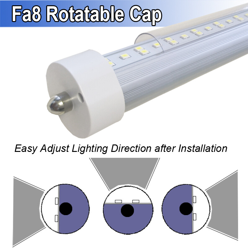 FAST DELIVERY - Ship from New Jersey or Los Angeles Warehouse via FedEx , 3-7 Days Delivered Your Door . SCIENTIFIC DESIGN - 8Ft LED Shop Lights Fixture is Made of 6500K Cold White SMD2835 LED Chip ,Plastic Clear Cover , Aluminum Bracket Housing ,and AC85-277V Constant Current Driver . It can work in -68F to 120F Temperature Conditions EASY INSTALLATION - The Integrated Tube Fixture Can be Install on Wall or Ceiling ,Easily Replace Traditional Fluorescent Tube Bulb . Plug and Play , Free Accessories (Power Cords, Connector , Extension Cords , Clip and Screw ) Come with Tube Lights Together WIDE APPLICATION - Linkable 8Ft Bulbs Widely Used in Garage Ceiling , Barbershop , Schools, Hospitals Basement , Factory Warehouses , Supermarkets Cooler Door , Offices, Shops,Hotels, etc 8FT T8 LED Tube Light Bulbs FA8 Single Pin 8FOOT LED Shop Lights 144W 25PACK 【No RF & FM Interference】LED Driver have passed Electromagnetic Magnetic Compatibility EMC tests,No cause EMI ,No longer subject to any RF & FM jamming. Never interfering with the signal of your garage roller shutter door,No make noise when you listen radio 【Easy to Install】Just simply bypass the ballast and connection AC85-277V AC power . Not compatible with single-ended powered sockets 【Wide Application】 - 8Ft 144W V Shaped FA8 HO LED Bulb fitted to replace traditional F96T12 T8 T10 T12 fluorescent bulbs. Widely used in Garage,supermarkets, offices , convenience stores , gas stations , warehouse,parking lot,shops, hotels,Refrigerator,coolers or freezers illumination,etc 【High Output】8Ft 144W 18000LM FA8 【Rotate Cap & Swivel End】 Easy Adjust rotated Lighting Direction within 180 degree after Installation