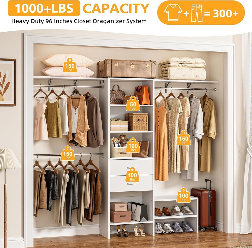 8FT Closet System with 3 Adjustabl Hanging Rods, Walk in Closet Organizer