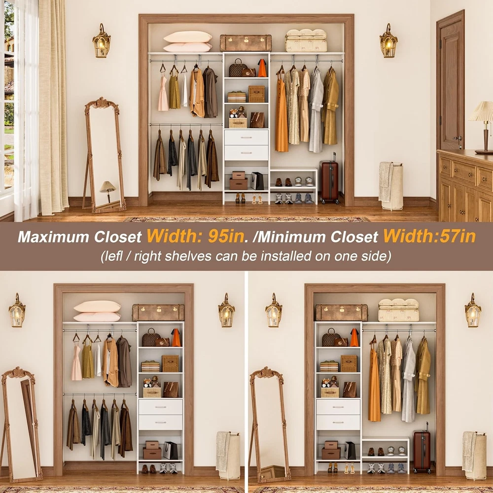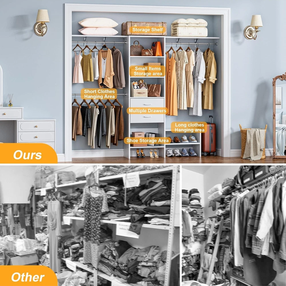 Product Description Heavy Duty Clothes Rack with 2 Wooden Drawers and 3 Hanging Rods Versatile Storage Options Step into “Wardrobe Closet.” Its thoughtful layout enhances space utilization while offering clear visibility and easy access. Say goodbye to clutter and embrace the joy of organization, where every clothing choice becomes an effortless pleasure. Comparison Before and After Use From a cluttered mess to a pristine, organized space, our thoughtfully designed partition system has turned chaos into clarity. Each section is meticulously crafted to accommodate various types of clothing, ensuring that every item has its perfect place. Elegant and Immaculate Bedroom Something You Need to Know Your Personal Walk-In Closet On Aug 11, 2025 at 21:08:38 PDT, seller added the following information: