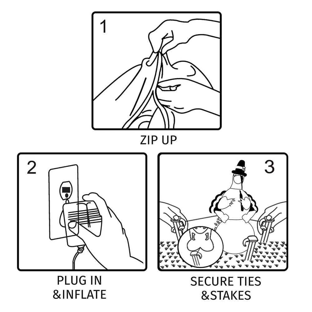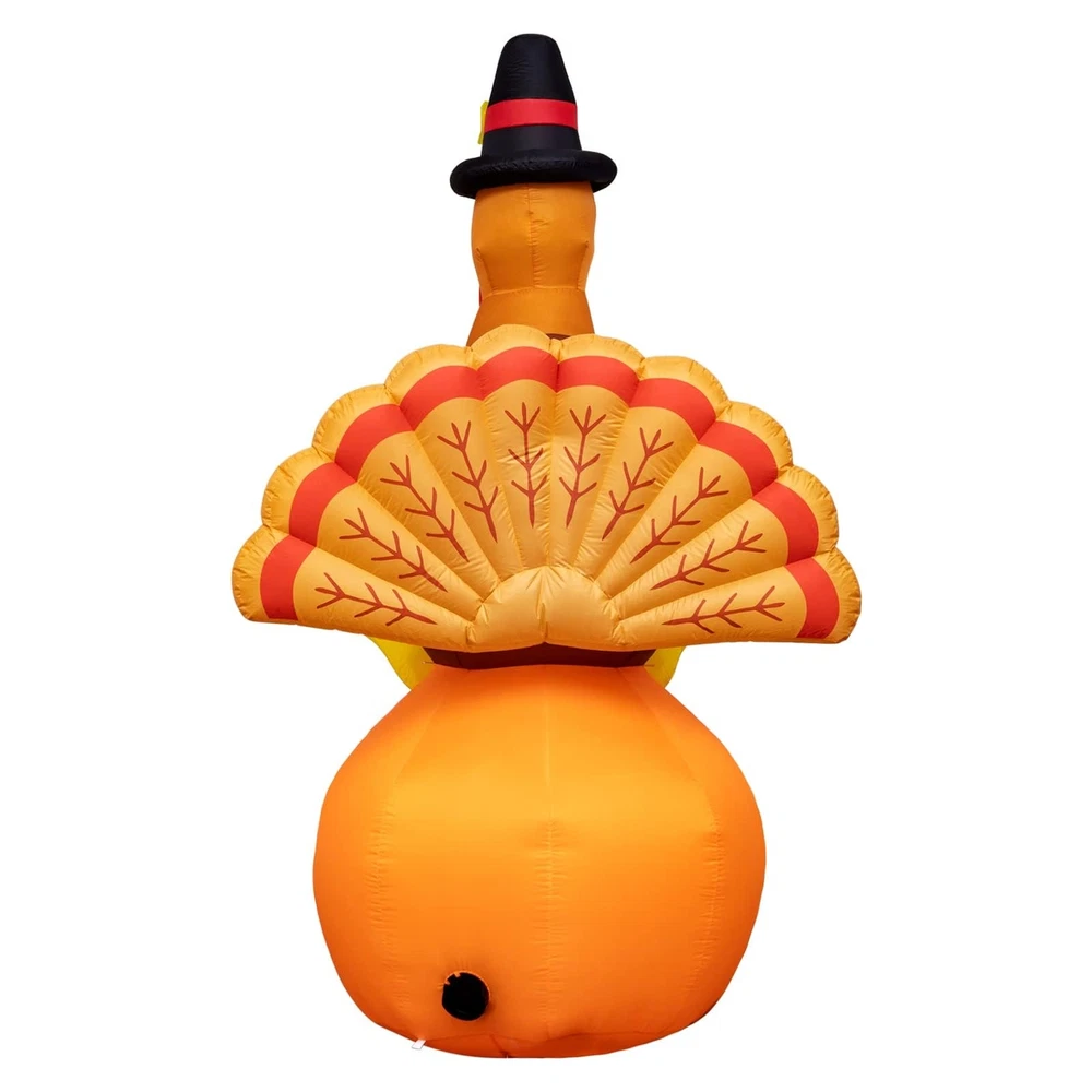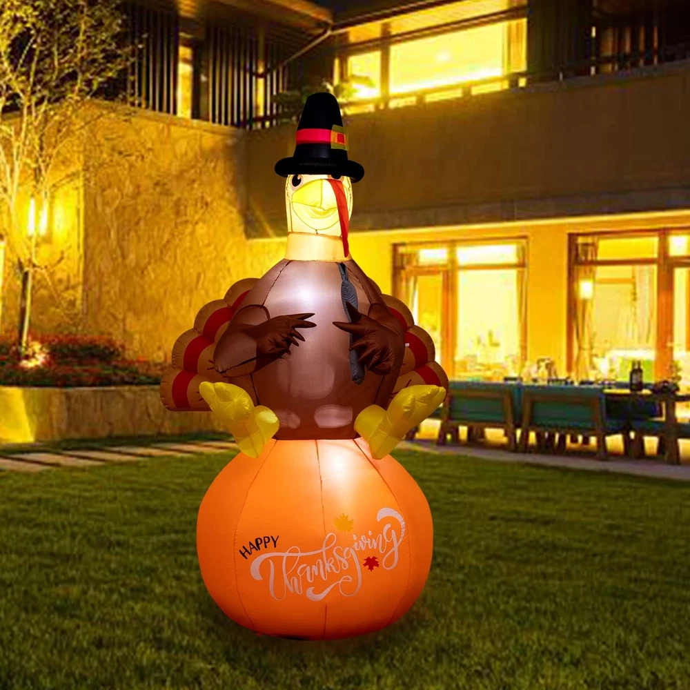 Thanksgiving Inflatable Decorations 8Ft Inflatable Turkey Blow Up Turkey Built-in LED Lights Wanna add some fun to your yard for the upcoming Thanksgiving? This inflatable turkey is an ideal choice. Your and neighbor would love it! When you place this fall Thanksgiving decoration outdoors and indoors, home, yard, garden, lawn, patio, porch, party, stage, restaurants, cafes, playgrounds, etc. the large full bodied turkey will be a big hit at your thanksgiving. Specification: Material: Polyester Inflated height: 8 feet Power: Plug in Package including: 1 x inflatable turkey, 1 x adapter,2 x Clips,4 x ground stakes and 4 tethers. Caution: 1. Protect the blower and power cord from water. 2. Do not inflate during storms or strong winds. 3. Please make sure the air blower is facing up when inflating. The air blower facing the ground will affect the effect of inflating. Supersized Decor: The Thanksgiving Decorations adorable inflatable turkey stands 8 Ft tall. It will be the cute centerpiece of your Thanksgiving decoration. Easy Setup and Storage: This Thanksgivings inflatable decoration comes with a powerful built-in blower. Just plug it in and the large turkey will be self-inflating and in 90 seconds standing up to its full height. For storage simply let the air out and fold it. Excellent quality: The Thanksgiving outdoor decoration is made of thickened waterproof polyester fabric. Soft, light and firm, wear-resistant. Please make sure the air blower is facing up when inflating. The air blower facing the ground will affect the effect of inflating,Features low noise, our product only makes a little noise when operating in the room; If put in the outdoor, the noise can be neglected. Reinforced Tie-Downs: 4 Ground stakes and 4 tethers are provided for tie-down. Built-in fixed sandbag, an opening at the bottom with a zipper provides space for adding some heavy objects to make it more secure and stable. No need to worry that our Thanksgiving yard inflatables will fly away with the wind. Wide Application: When you place this fall Thanksgiving decoration outdoors and indoors, home, yard, garden, lawn, patio, porch, party, stage, restaurants, cafes, playgrounds, etc. the large full bodied turkey will be a big hit at your thanksgiving.