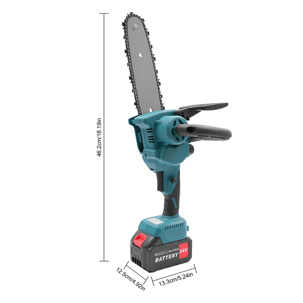 Specifications Color: Black, Green Material: #50 Steel, ABS Process: Quenching Copper Type: Brushless Pure Copper Motor Battery Capacity: 3000mAh(18650, 10 Battery Cells) Plug Standard: US Standard Rated Voltage: 100-240V AC50-60Hz Running Current: 60(A) Guide Plate Length: 25cm/9.84in Maximum Cutting Diameter: 20cm/8in Oil Tank Capacity: 30ml/1oz Charging Cord Length: 65cm/25.59in Power: 800W Speed: 4360rpm Endurance: About 40min Assembly Required: Yes Product Size: 13.3*12.5*46.2cm/5.24*4.92*18.19in Carrying Case Size: 49.7*16*24.5cm/19.57*6.3*9.65in Packaging Size: 49.7*24.5*16cm/19.57*9.65*6.3in Gross Weight: 3.6kg/7.94lbs Net Weight: 2.6kg/5.73lbs Package Included 1*Electric Saw 1*Saw Chain 1*Screw Driver 1*Charger 1*Battery 1 Pair*Gloves 11*Carrying Case Other Needed Accessories 8 inch Electric 800W Chainsaw Cordless Handheld Chain Wood Cutting Saw w/Battery Description This 8-inch electric chainsaw will be a flexible, lightweight plant-cutting and pruning tool in your hands with its powerful motor, high-capacity battery, comfortable handle, and compact size. The automatic lubrication function makes the product run quickly, providing you with a fast and smooth cutting experience and improving your work efficiency. Key Features Sturdy and Durable: The product is made of #50 steel and ABS with a quenching process, which is sturdy, durable, corrosion-resistant , rust-proof , tear-proof , and wear-resistant . Powerful Cutting Performance: The quenched high-quality guide chain ensures a smooth cut. In addition, a pure copper motor is used to provide your tool with long run time, large torque, and strong power, reducing wear and tear to extend the service life while delivering strong power for more efficient and faster cutting. Large Battery Capacity: This product is equipped with a 24V 3000mAh rechargeable Li-Ion battery that can last for 40 minutes for long-time working. In addition, the design of using lithium battery charging avoids the operation limitation brought by charging cable, which makes your operation site more flexible. Compact Size and Lightweight: Its slim body (5.24*4.92*18.19in) allows you to work easily even in narrow spaces. In addition, its lightweight(5.73 lbs) makes it ideal for one-handed use by women and the elderly, and less fatiguing for long-time work. Safety Guarantee: The product is equipped with a safety lock, you need to press the safety lock first and then press the trigger to activate it, effectively avoiding accidental contact and accidental injury. In addition, the product comes with overheating protection to avoid damage to the product under high intensity and long time operation. Thoughtful Design: The product is equipped with automatic chain lubrication. You only need to pour the oil into the oil tank to lubricate the chain, the product will reduce wear and make the cutting smoother. Simple Chain Adjusting: You just need to twist the knob on the sprocket cover to adjust the chain tension without tool requirements. User-friendly Design: The product comes with a non-slip textured handle and a pair of gloves to provide protection for your hands and allow you to hold the product tightly. Customer Service: We aim to provide quality products and services. If you have any problems, please feel free to contact us. We will reply and solve the problem for you as soon as possible. Details Protective Baffle: It prevents wood chips from splashing, ensures a healthy working environment, and protects your hands during work. Air Vents: They can promote ventilation and accelerate the cooling effect to avoid overheating of the machine. Application The product is suitable for use in gardens, farms, parks, forests, pastures, orchards, indoors, etc. for tree pruning, shrub pruning, home improvement, wood cutting, and other work. Specifications Color: Black, Green Material: #50 Steel, ABS Process: Quenching Copper Type: Brushless Pure Copper Motor Battery Capacity: 3000mAh(18650, 10 Battery Cells) Plug Standard: US Standard Rated Voltage: 100-240V AC50-60Hz Running Current: 60(A) Guide Plate Length: 25cm/9.84in Maximum Cutting Diameter: 20cm/8in Oil Tank Capacity: 30ml/1oz Charging Cord Length: 65cm/25.59in Power: 800W Speed: 4360rpm Endurance: About 40min Assembly Required: Yes Product Size: 13.3*12.5*46.2cm/5.24*4.92*18.19in Carrying Case Size: 49.7*16*24.5cm/ 19.57*6.3*9.65in Packaging Size: 49.7*24.5*16cm/19.57*9.65*6.3in Gross Weight: 3.6kg/7.94lbs Net Weight: 2.6kg/5.73lbs Package Included 1*Electric Saw 1*Saw Chain 1*Screw Driver 1*Charger 1*Battery 1 Pair*Gloves 1*Carrying Case Other Needed Accessories Notes Please check the size carefully before ordering. Please remember to fully charge the battery before storing it if you don't use it for a long time for a better experience the next time you use it. Please allow the slight color difference caused by the shooting light and 1-3cm error due to manual measurement, and make sure you do not mind before you order. Payment Delivery details Terms of sales About us Contact us Payment We accept ebay payment 。 Fees such as import duties, taxes are not included in the item price or shipping costs. These charges are the buyer's responsibility. Delivery details Shipping: 2-9 working days to: USA Terms of sales We maintain high standards of excellence and strive for hundred percent customer satisfaction. Feedback is very important to us. We hope that you contact us immediately before you give neutral or negative feedback, so that we can address your concerns. It is impossible to address issues if we do not know about them! About us Your satis faction is our ultimate goal. We work hard to earn your trust and future business. Our certified technicians have tested each item before shipping. The unit comes with 1 year limited warranty on all manufacturing defects. a) If you receive a defective item, you may return it or ask for a discount. Please contact us within 14 days after you receive the package. b) What you returned must 