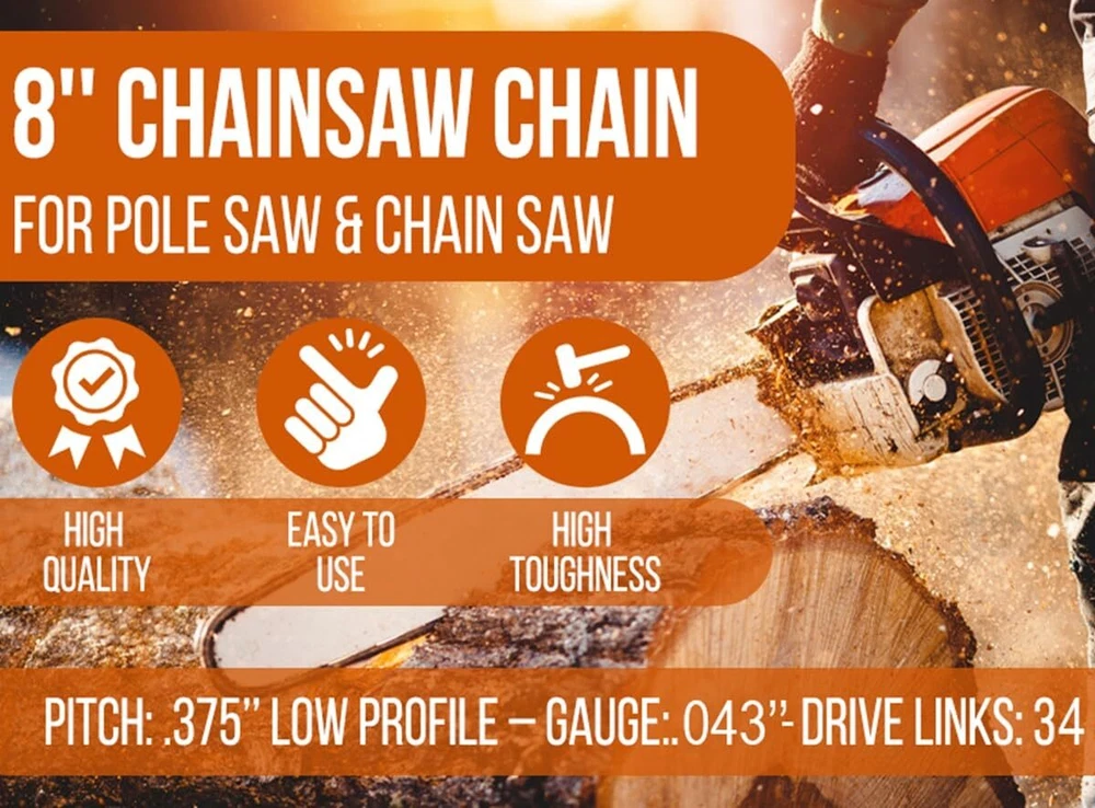 This chainsaw chain is a perfect replacement for my DeWalt pole saw—sharp, durable, and fits exactly like the original. Cuts through branches smoothly with no skipping or stretching. Great value for the price, and it works with multiple brands, making it super convenient. Highly recommend for anyone needing a reliable replacement chain!