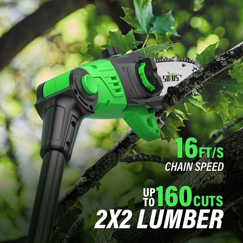 Cordless Pole Saw 8-Inch, 2-in-1 Pole Hedge Trimmer 18-Inch, 15-Foot Max Reach Pole Saw for Tree Trimming, 16ft/s Speed, Auto Oiling, Multi-Angle Pole Chainsaw with 2.0Ah Battery & Charger 2-IN-1 POLE SAW & HEDGE TRIMMER - The newly designed 2-in-1 pole saw with saw head attachment and hedge trimmer attachment is able to fully satisfy all your branch pruning needs. For the convenience of customers, we added a section of the extension tube, which is convenient for customers to prune tree branches. It does not depend on unstable ladders, making the work of pruning branches easy. UP TO 15 FEET EXTENDED HEIGHT - When you encounter hard-to-reach branches but don't want to risk climbing a ladder for safety reasons, you deserve to have this cordless pole saw. With an extension pole from 9.4 feet to 10.4 feet, you can reach heights of up to 15 feet (based on a 5.4-foot person holding the pole in an extended position at shoulder level). And there are 3 adjustable angles that allow you to easily trim branches in different locations. AUTOMATIC OILING & TOOL-FREE TENSIONING - pole saw is equipped with automatic oiling system to keep the chain running perfectly at 16FT/S, which greatly extends the service life of the high branch saw. Meanwhile, equipped with tool-free tensioning chain system, you can adjust the chain loosely and freely. Therefore, every time you use it, it can help you cut more efficiently and faster. SAFETY PROTECTION DESIGN - This pole saw incorporates a safety protection system that can only be activated when the safety lock and trigger are pressed, thus preventing the operator from accidental injury. Meanwhile, the new battery pack is equipped with an advanced battery management system, which can make the use safer. PACKAGING & WARRANTY - guarantees 12-month product warranty. If you have any problems with the product, please feel free to contact us. What you get:1 x cordless pole saPw, 1 x hedge trimmer attachment, 1 x 20v 2.0Ah battery pack, 1 x fast charger, 1 x shoulder strap, 1 x extension tube, 1 x manual.
